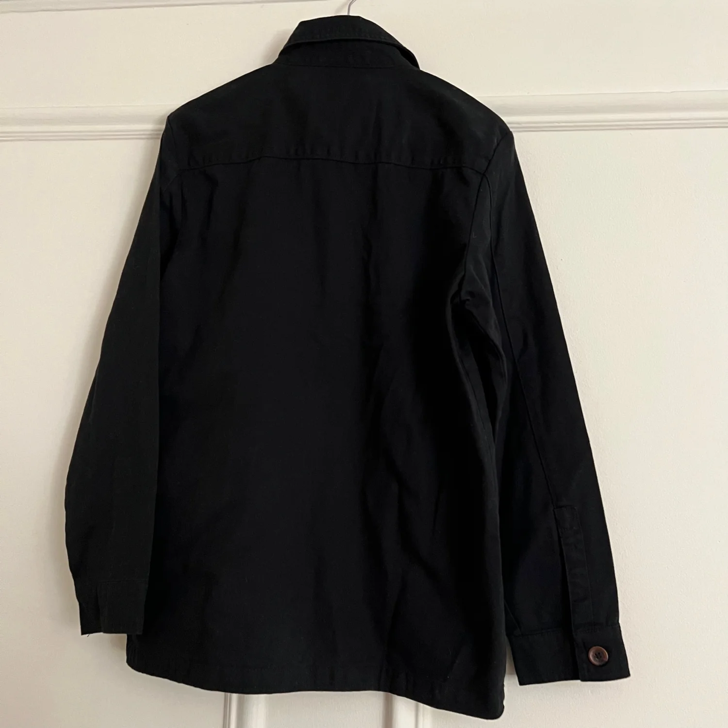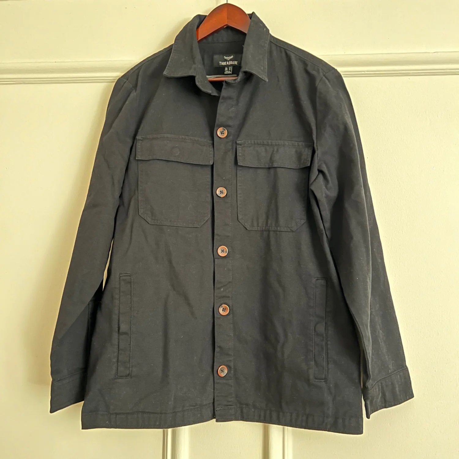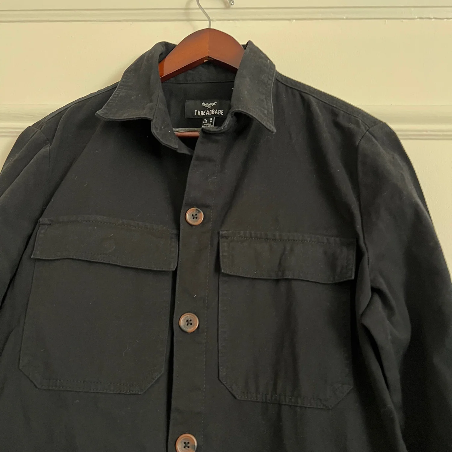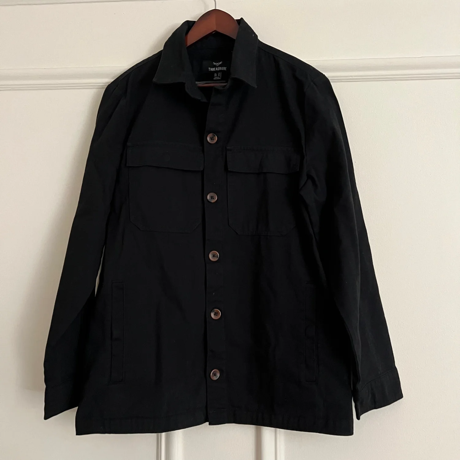 This is a men's black jacket by Threadbare, featuring a button-front design and flap chest pockets. Made from durable material, this jacket is perfect for casual wear. Size Large. Ideal for layering in cooler weather. #Threadbare #Men'sFashion #BlackJacket