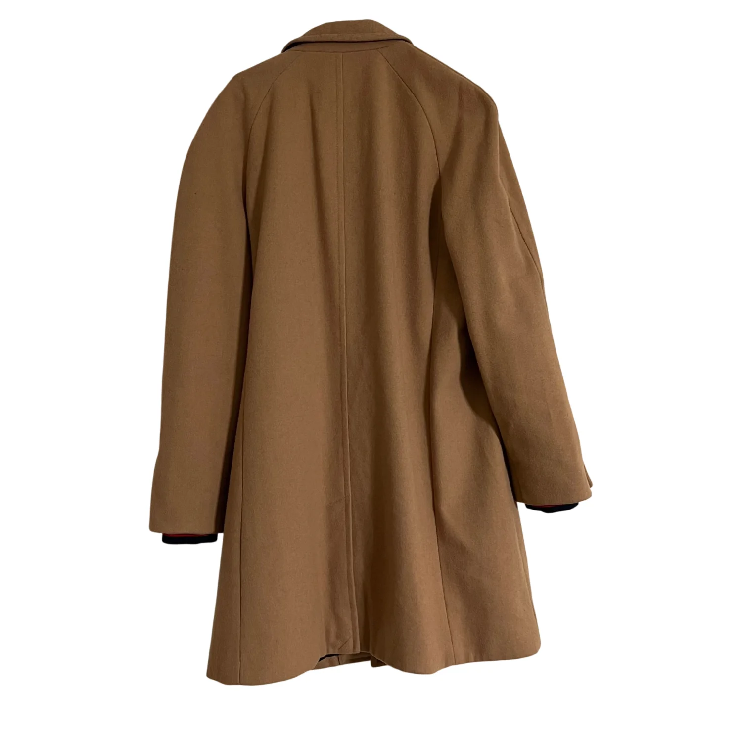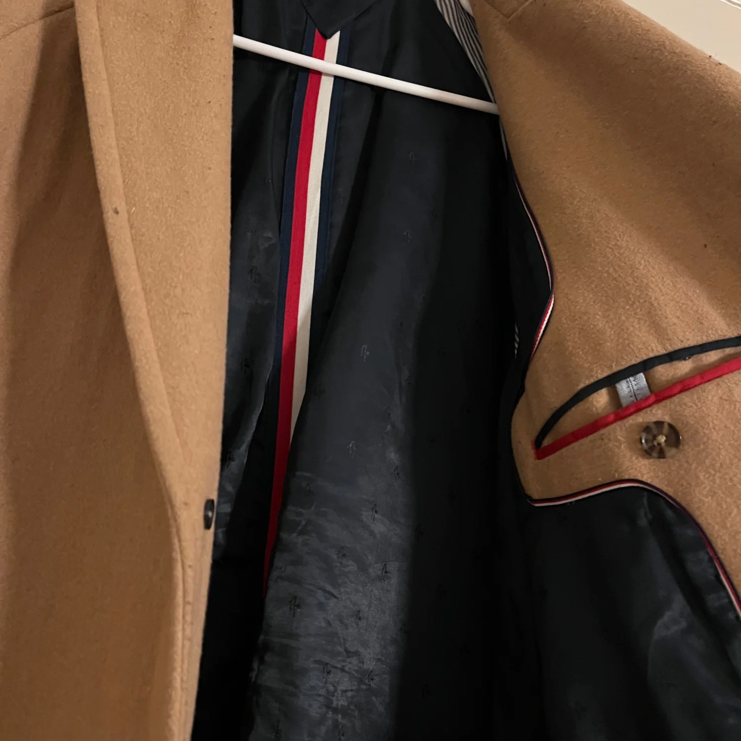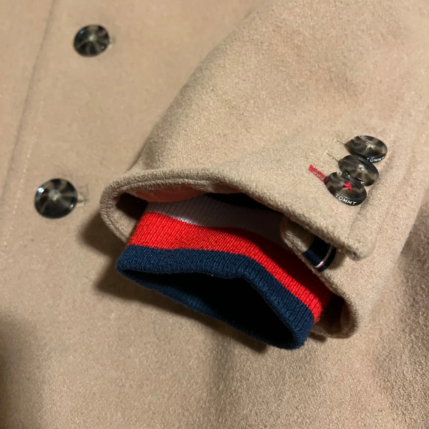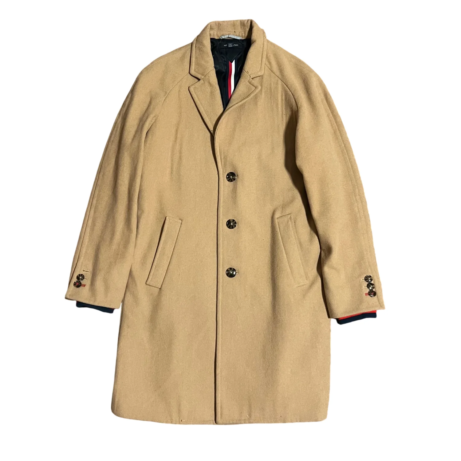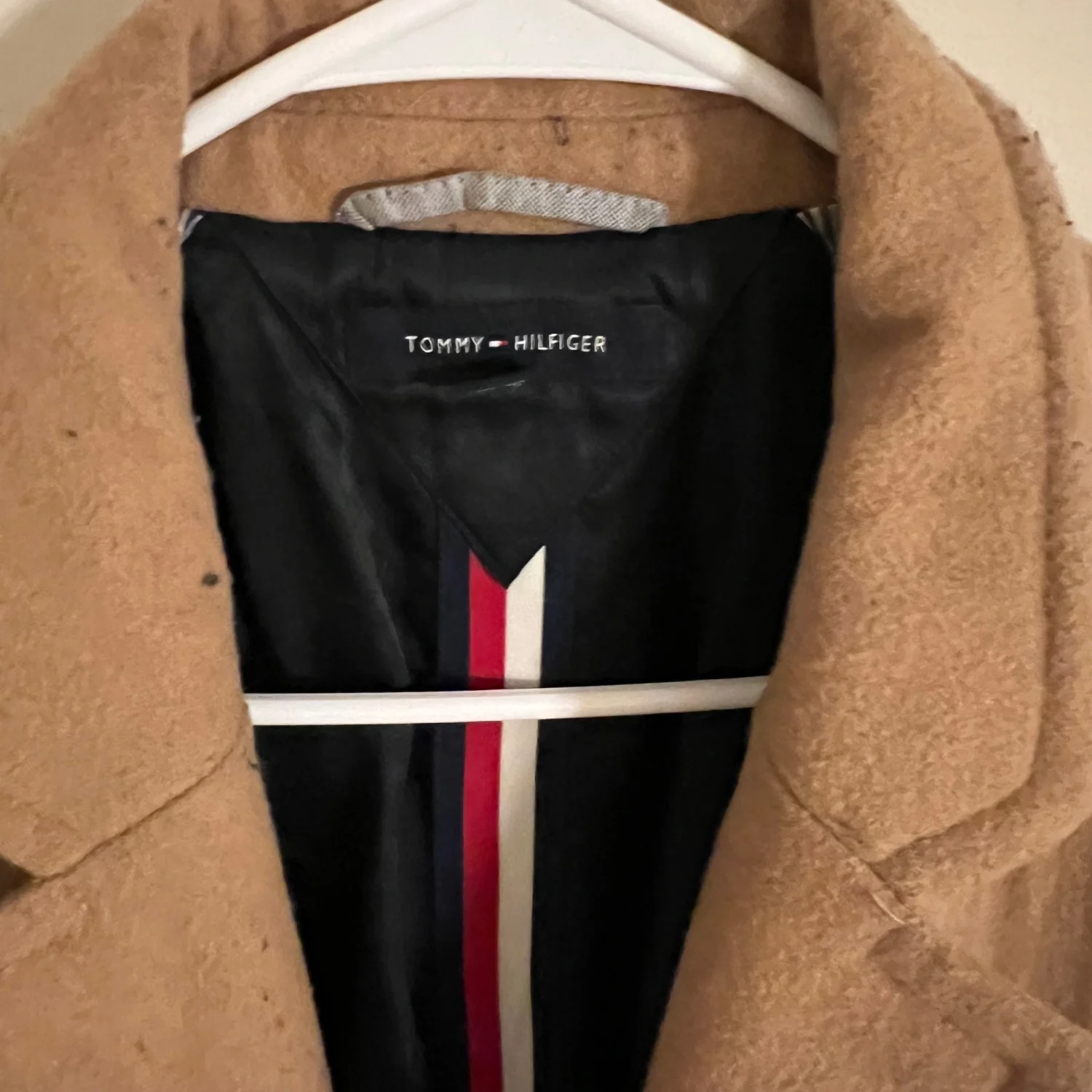 Stylish Tommy Hilfiger overcoat in a classic tan / camel color. Some piling. Features a single-breasted design with three front buttons, side pockets, and buttoned cuffs. The inner lining showcases the iconic Tommy Hilfiger colors. Feel free to ask any questions