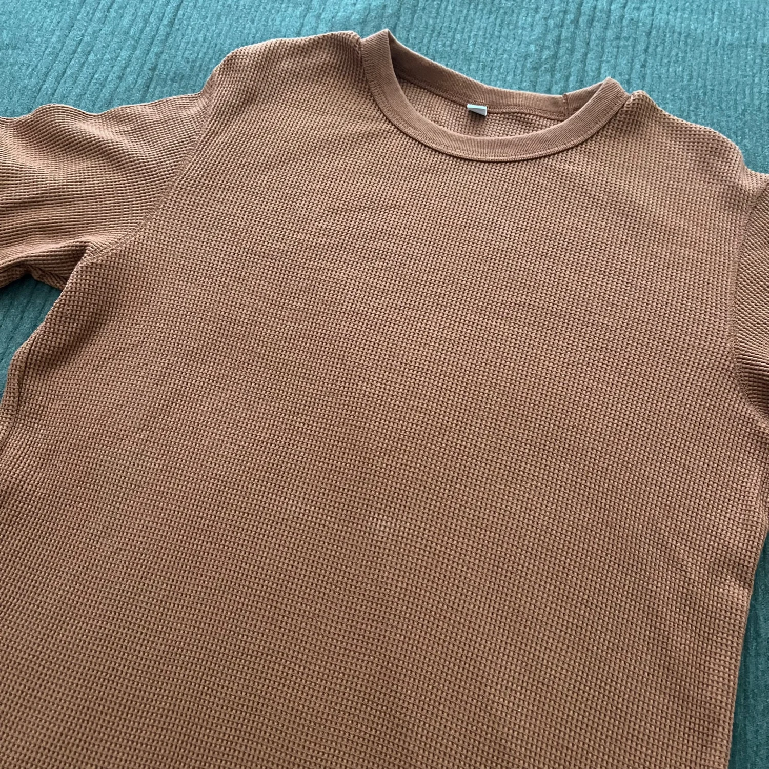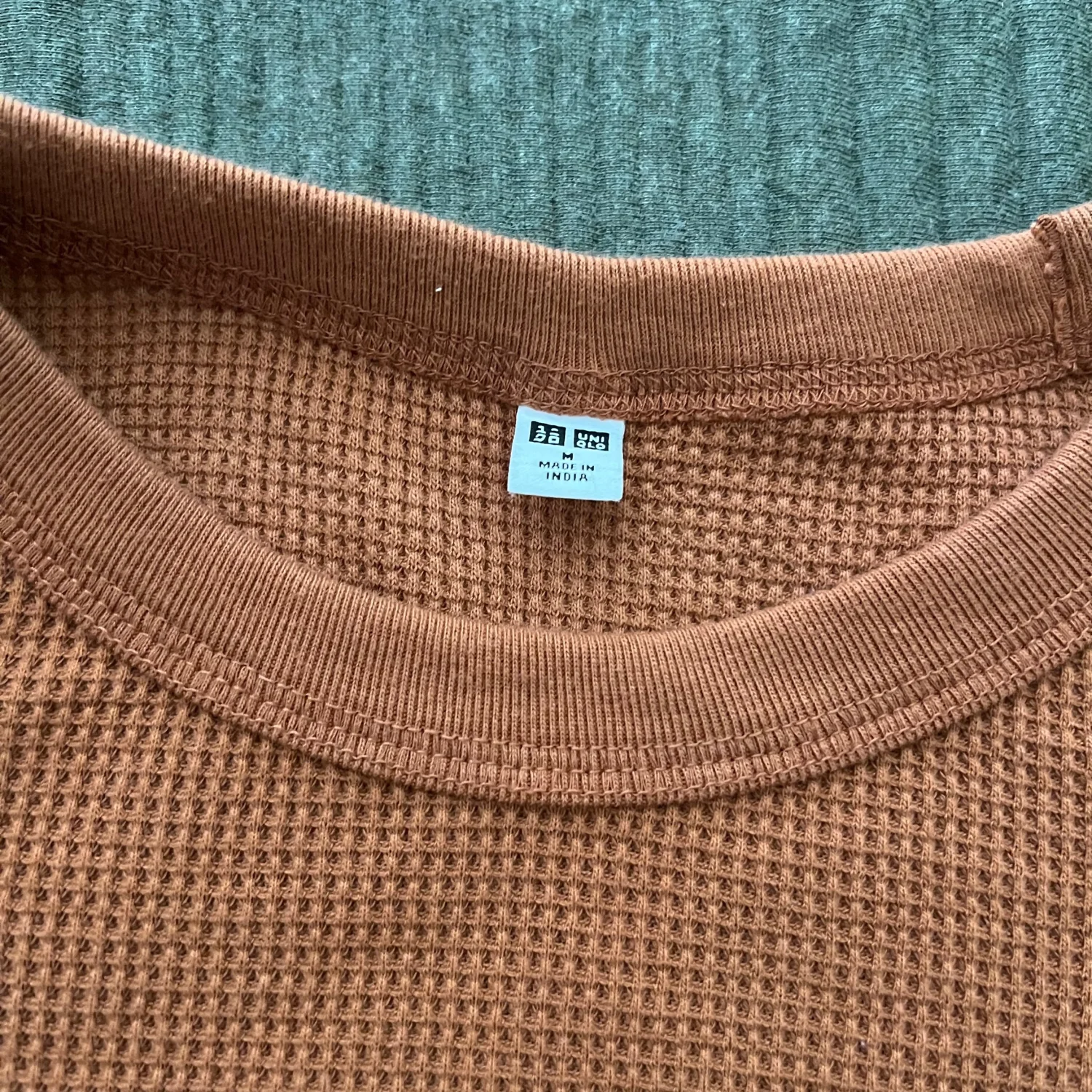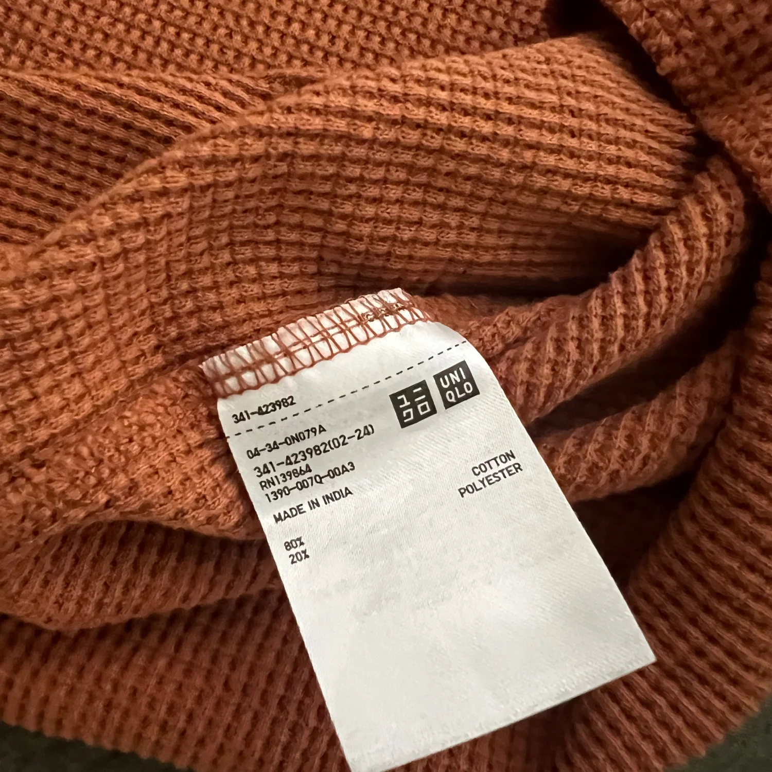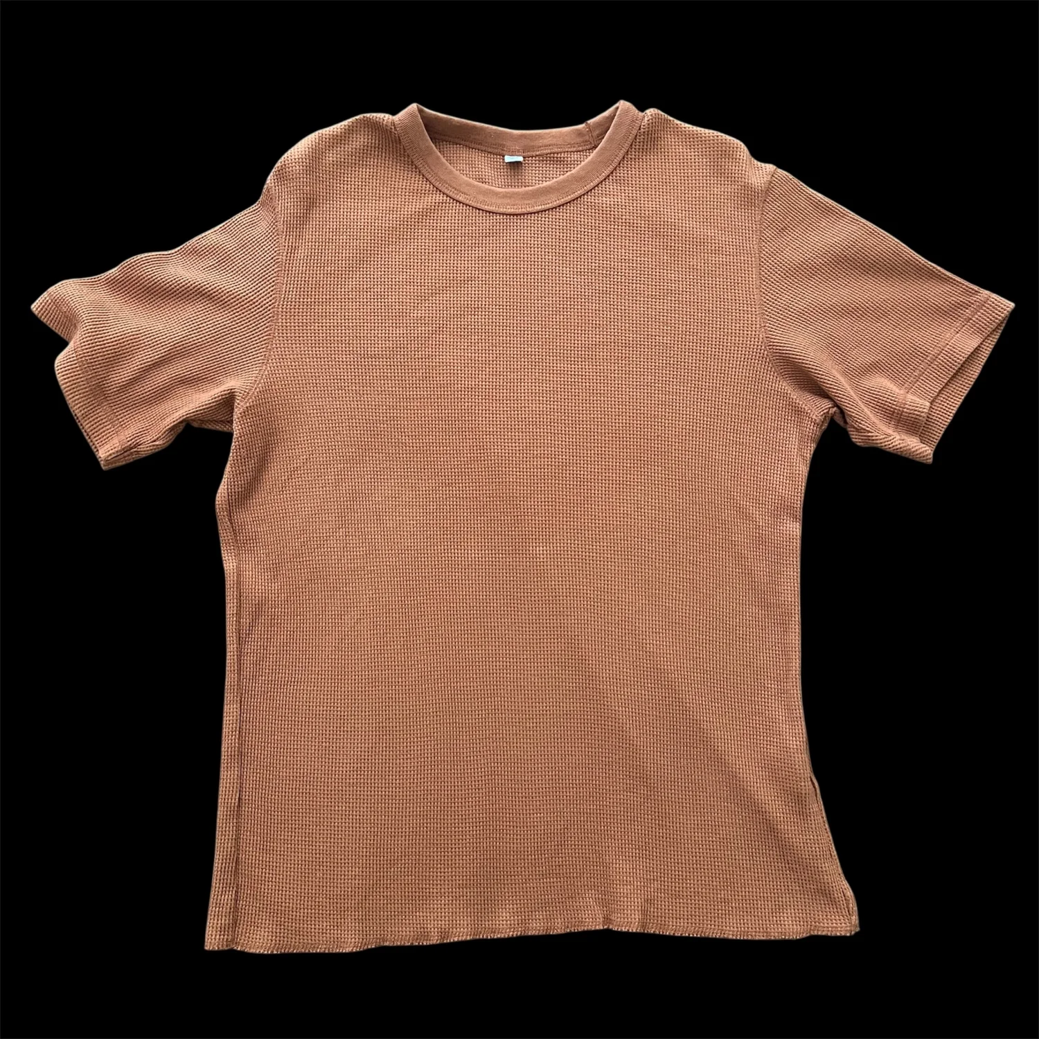 Burnt Orange waffle knit t-shirt by Uniqlo, crafted from a comfortable cotton and polyester blend. Features a classic crew neck and a soft texture, providing warmth and style. Ideal for casual wear. Made in India. #casual #timeless