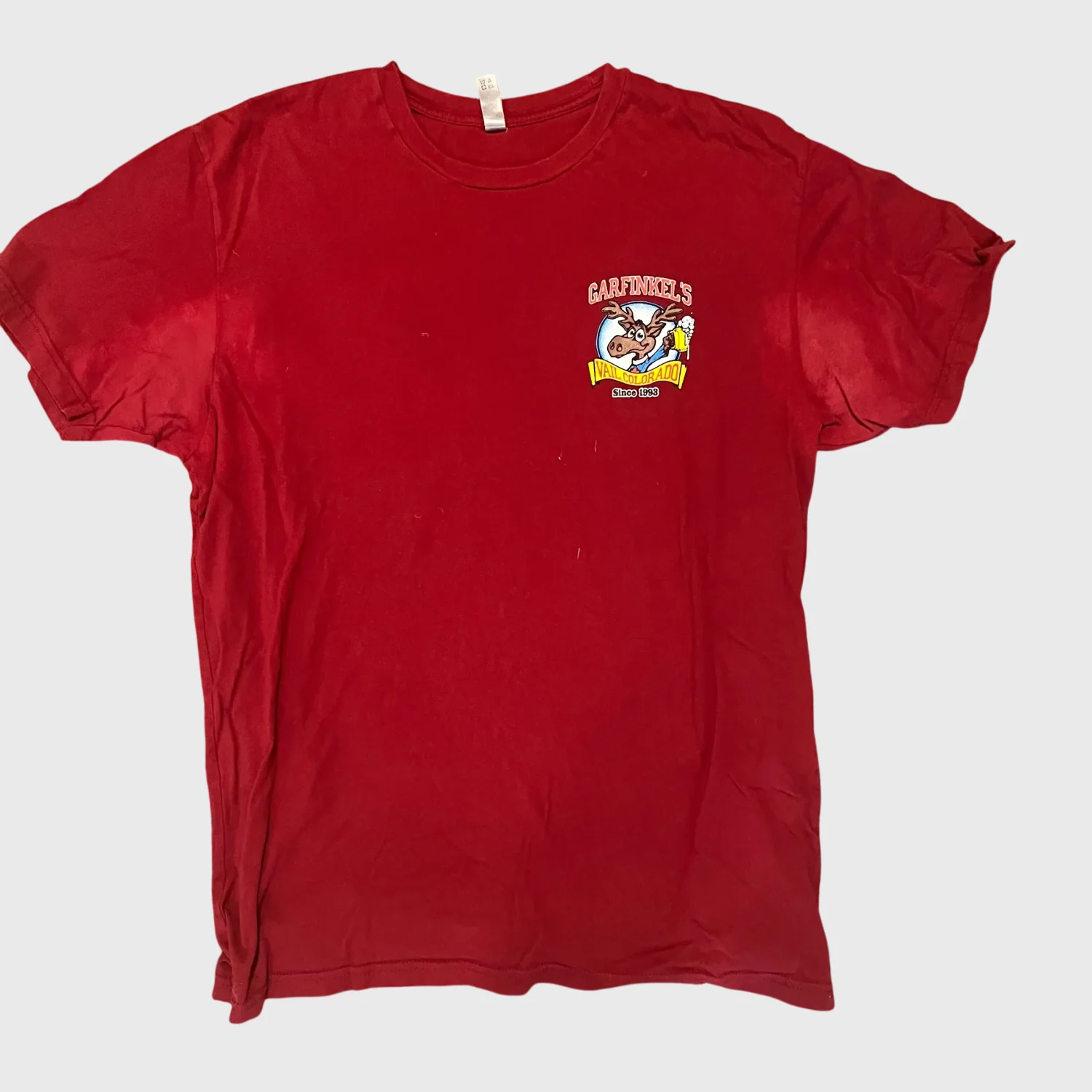 Vintage red t-shirt features the Garfinkel's logo (of Vail Colorado). Popular ski hang out spot Logo printed on both the front and back. “Next Level” size large on tag