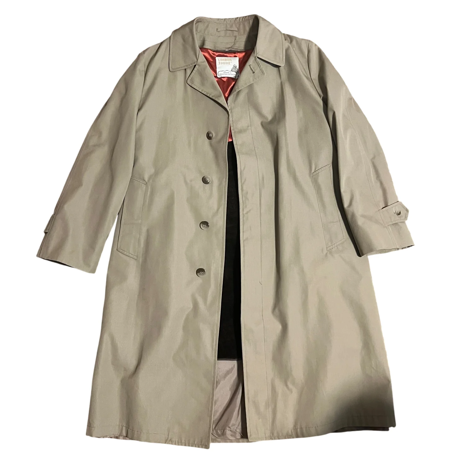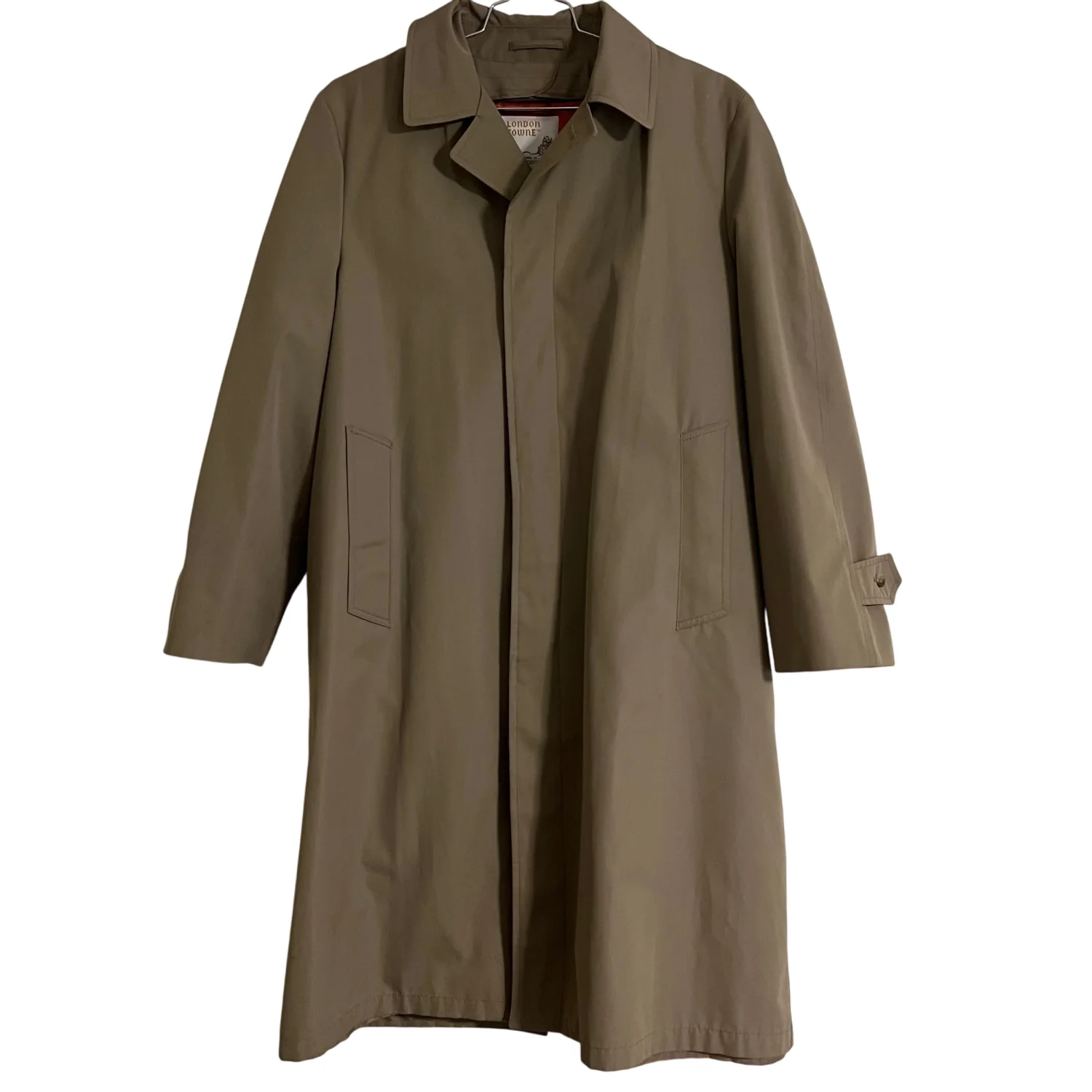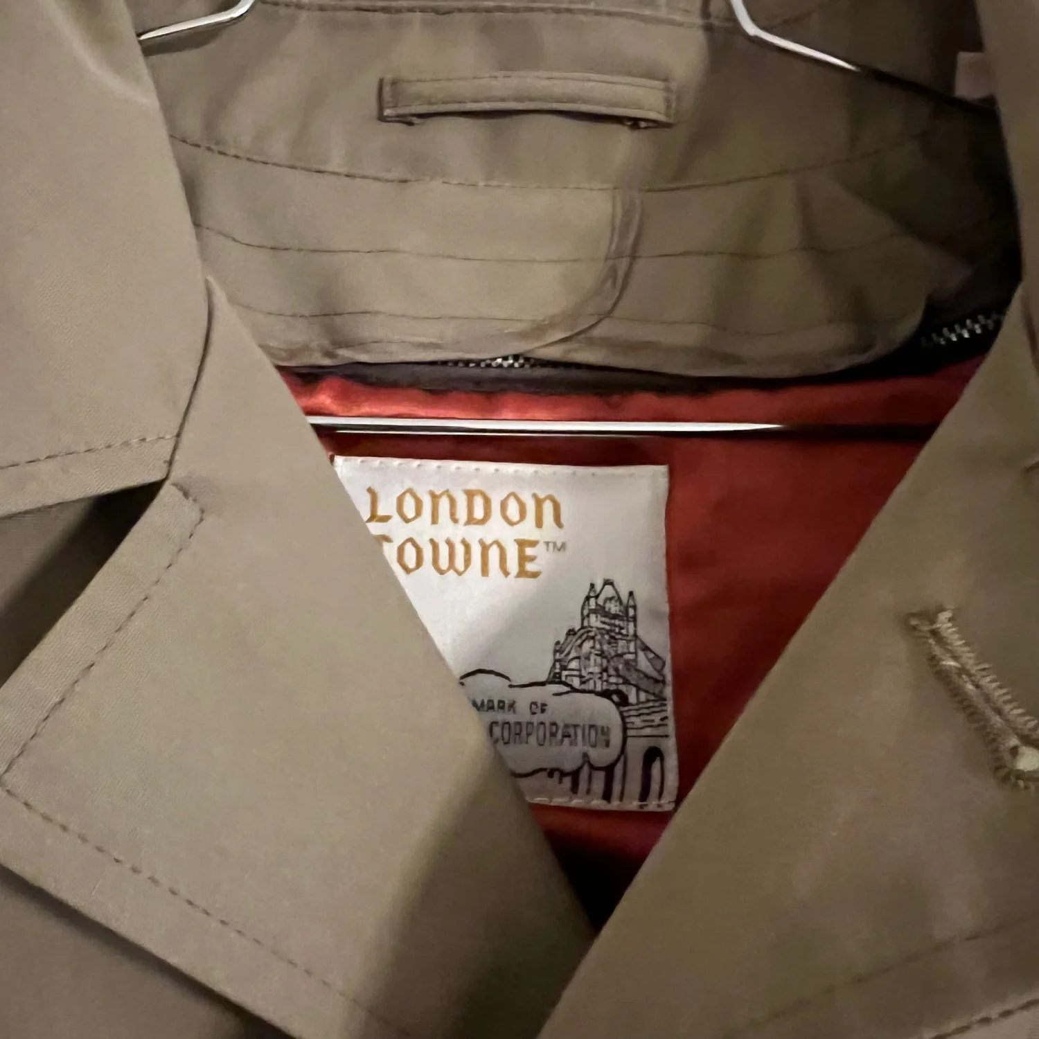 Classic beige trench coat by London Towne. This coat features a traditional button-up front, a notched collar, and adjustable cuffs. Made from durable material, it's fully lined with a removable contrasting inner lining. Perfect for a timeless, sophisticated look. #vintage #trenchcoat #classic (note minor staining on neck that is photographed) (my lighting is not great, which is why it looks dark in the hanging photos). Made in Korea. Dry clean only