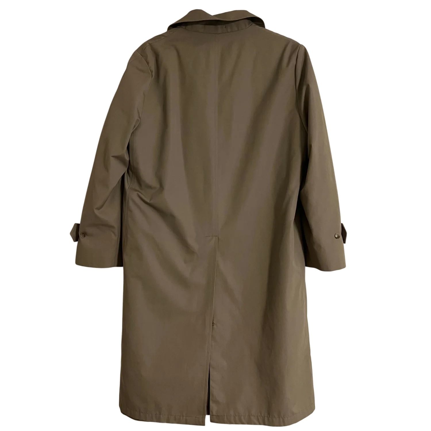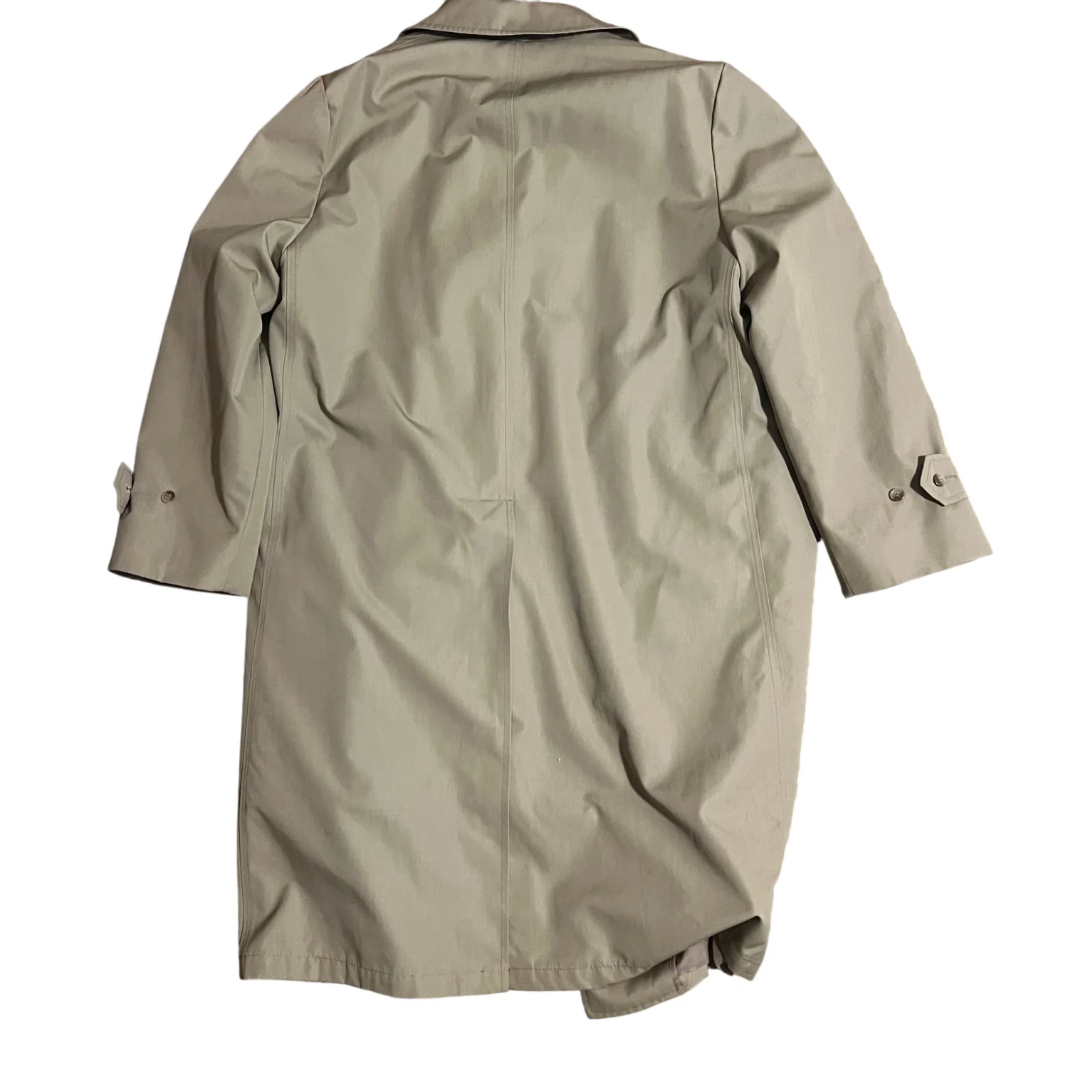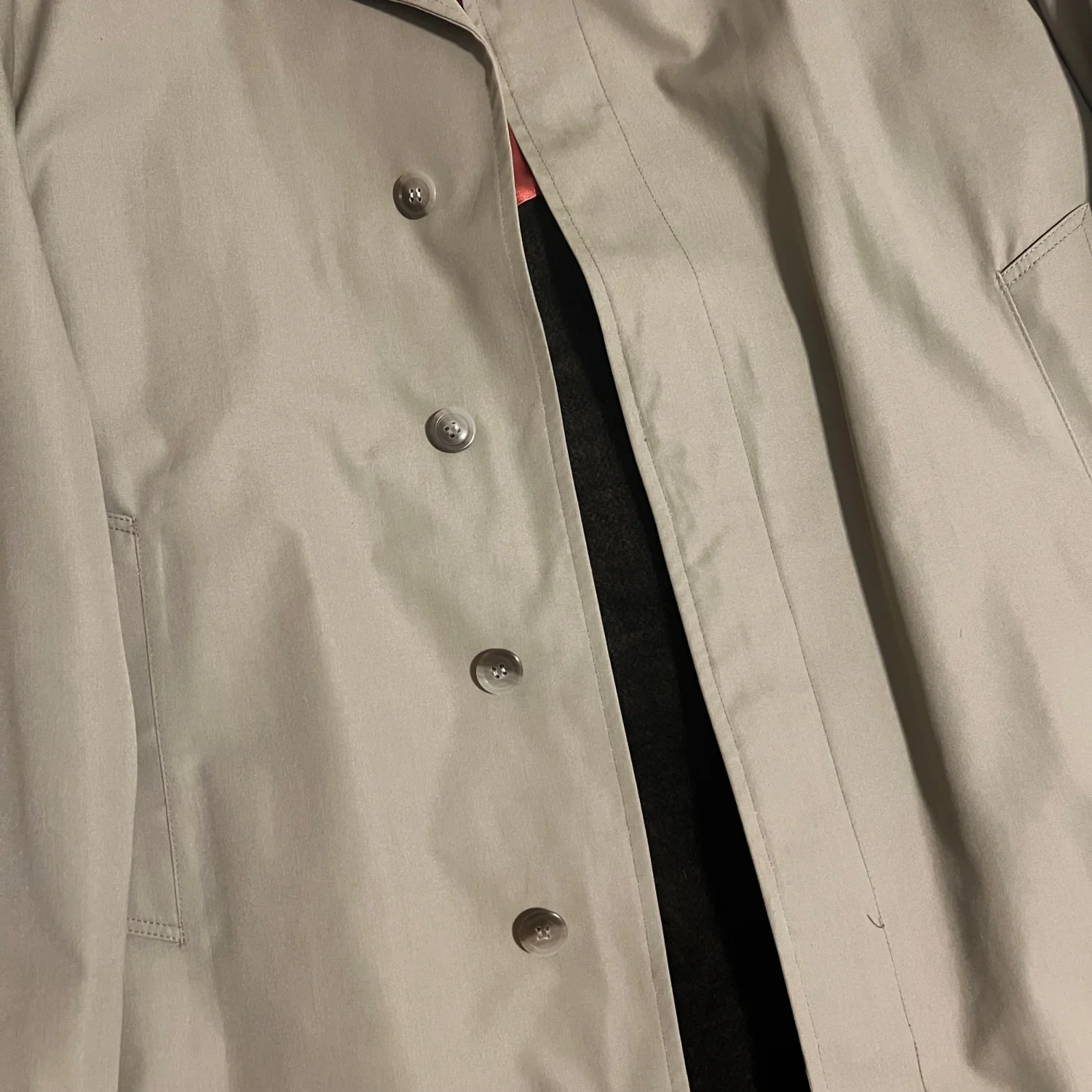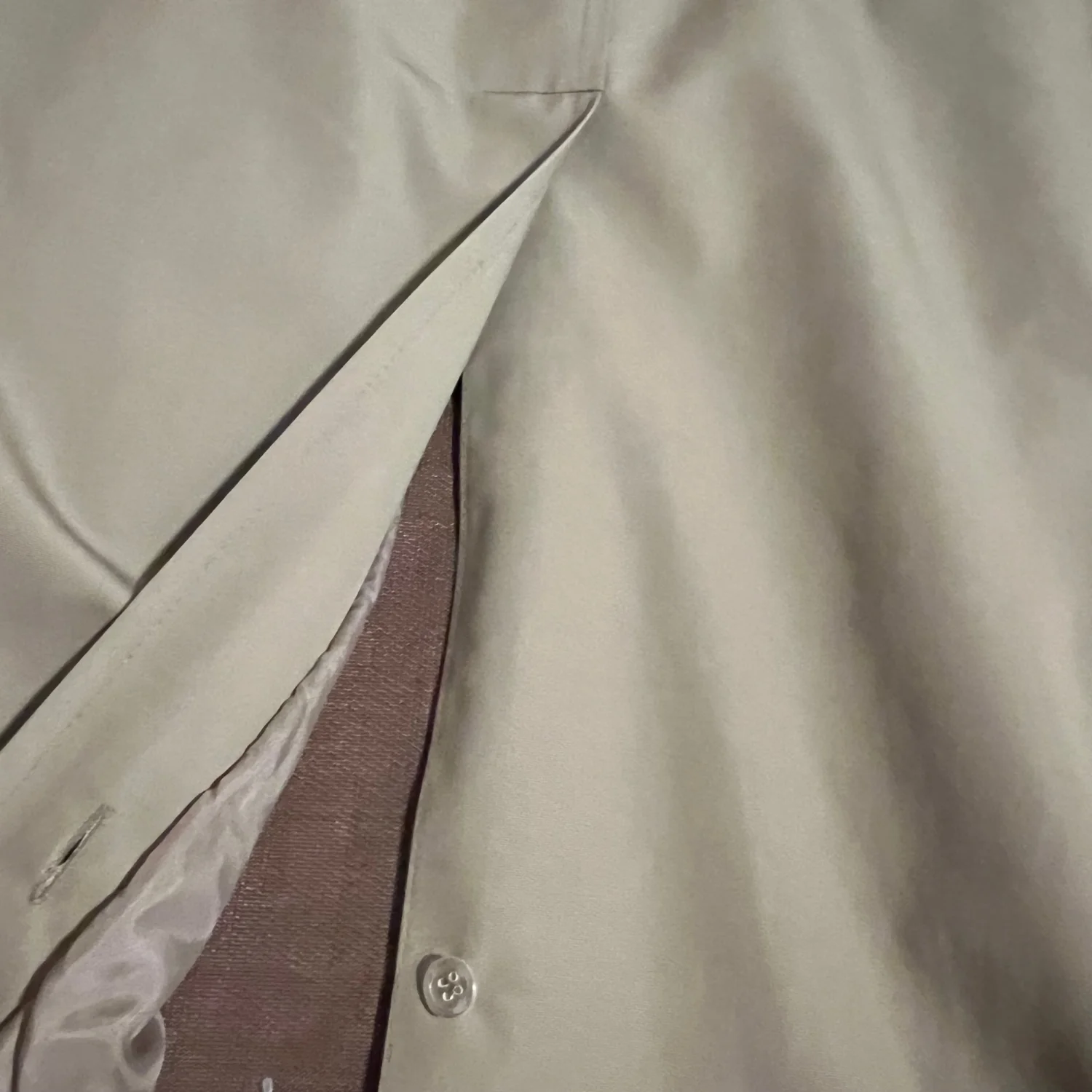 Classic beige trench coat by London Towne. This coat features a traditional button-up front, a notched collar, and adjustable cuffs. Made from durable material, it's fully lined with a removable contrasting inner lining. Perfect for a timeless, sophisticated look. #vintage #trenchcoat #classic (note minor staining on neck that is photographed) (my lighting is not great, which is why it looks dark in the hanging photos). Made in Korea. Dry clean only