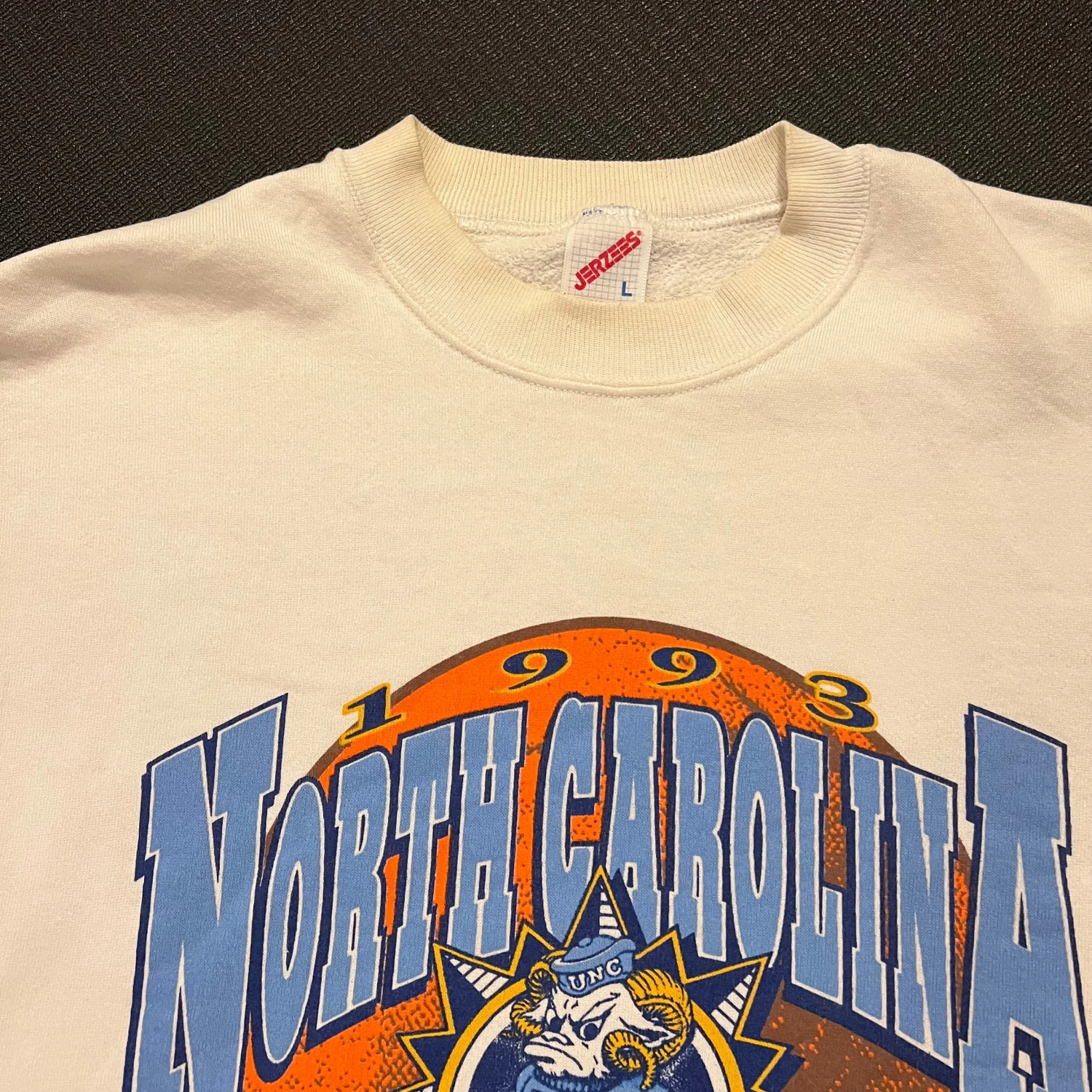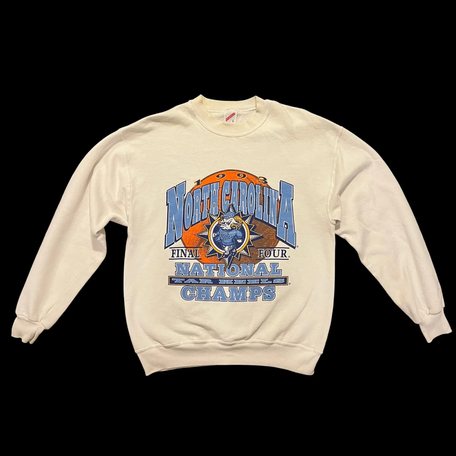 Celebrate history with this vintage 1993 North Carolina Final Four National Champs sweatshirt. Made by Jerzees, this ivory sweatshirt features a bold graphic print of the iconic Tar Heels. It is crafted from a soft cotton blend, ensuring both comfort and style. Perfect for fans and collectors alike, this sweatshirt brings a touch of nostalgia. Note: There are minor spots present, reflecting its vintage character. Note the pictures. Size Large but fits smaller imo Tags: #Vintage #NorthCarolina #CollegeBasketball #TarHeels #1990s