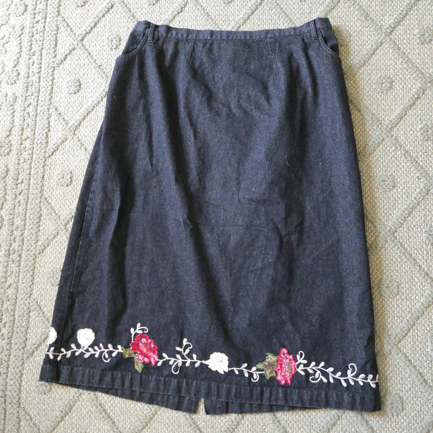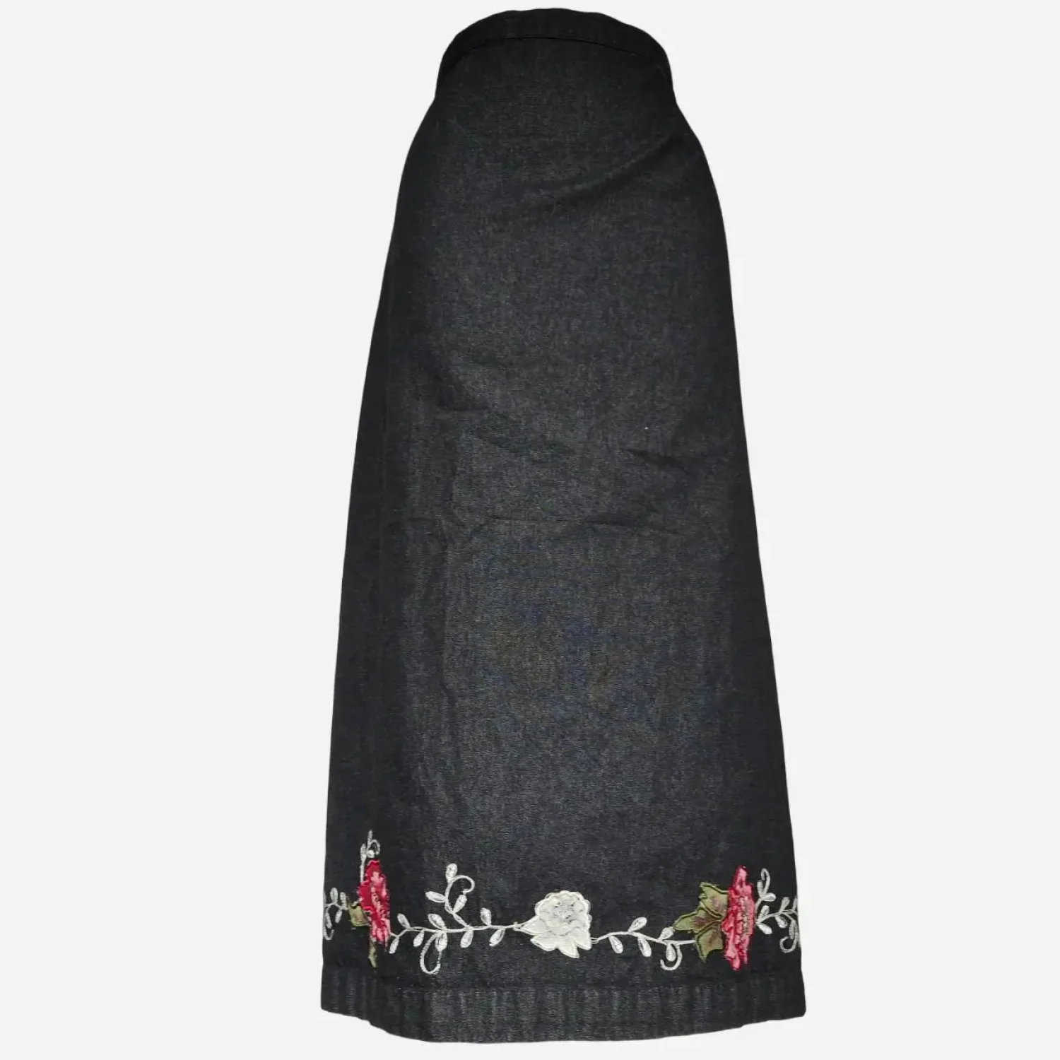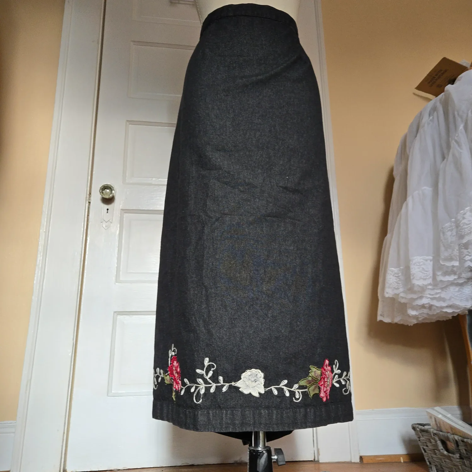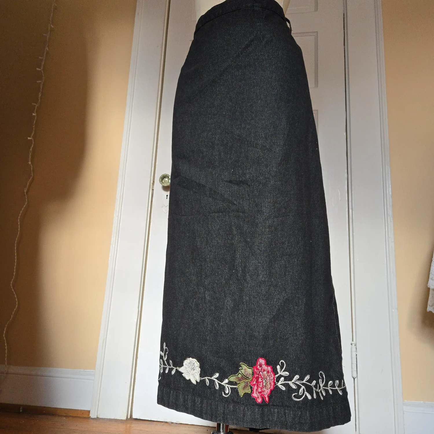 Denim & Co / 3X / 100% cotton / Black denim maxi skirt with embroidered flowers, partially elastic waistband (at back) / #y2k #cottagecore #boho #eclectic #quirky