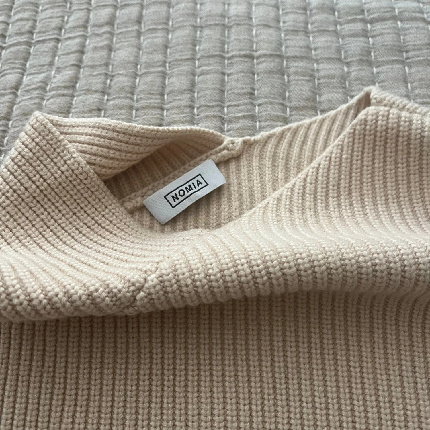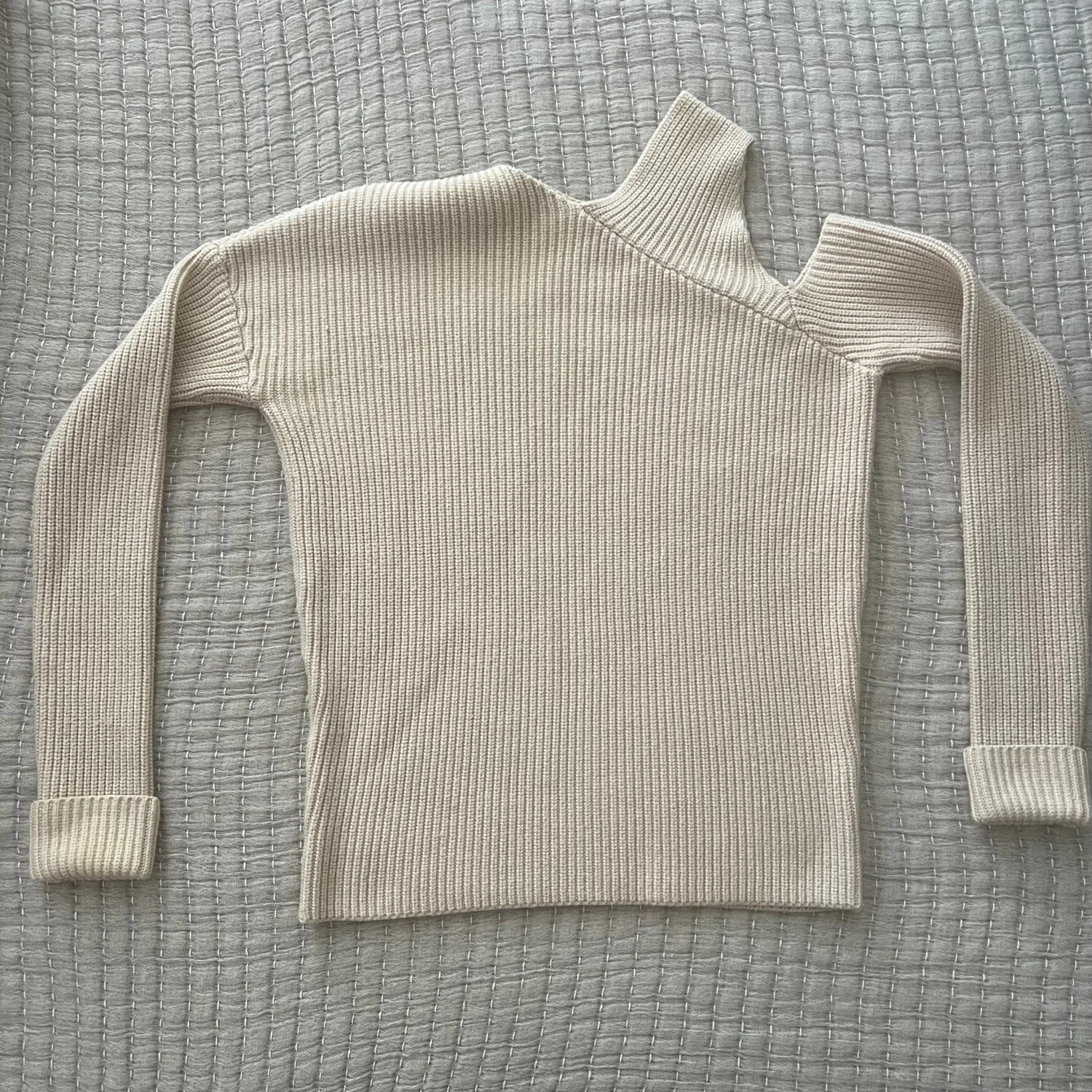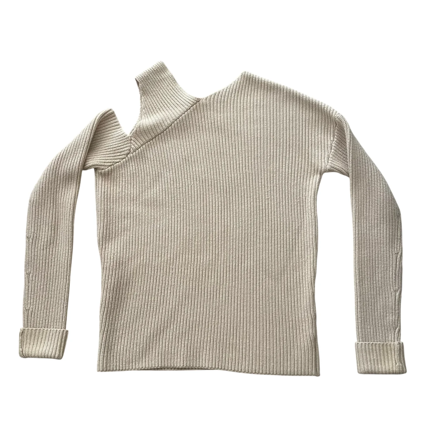 This is an asymmetric ribbed sweater in a light beige color by NOMIA. It features a unique one-shoulder design, adding a modern twist to a classic knitwear staple. The sweater is made of a soft, textured knit fabric. Perfect for layering or as a stand-alone piece for a chic look. Size XS. #asymmetric #ribbed #beige #nomia
