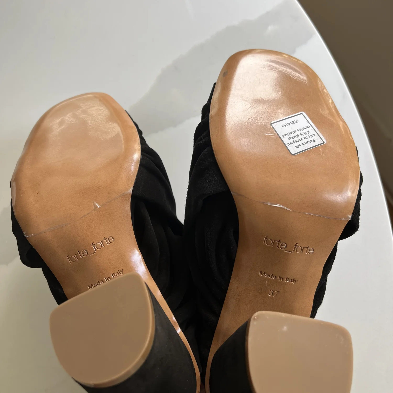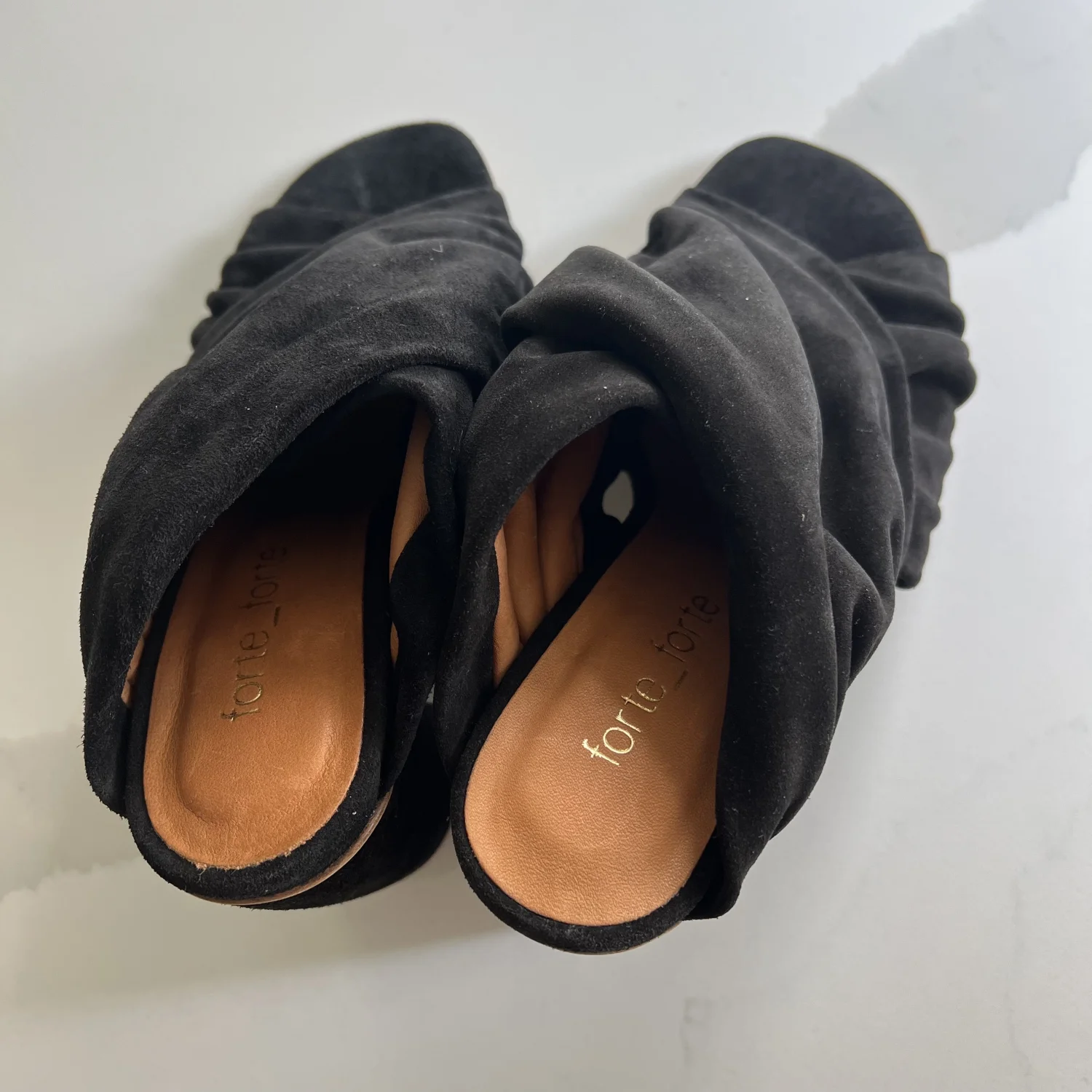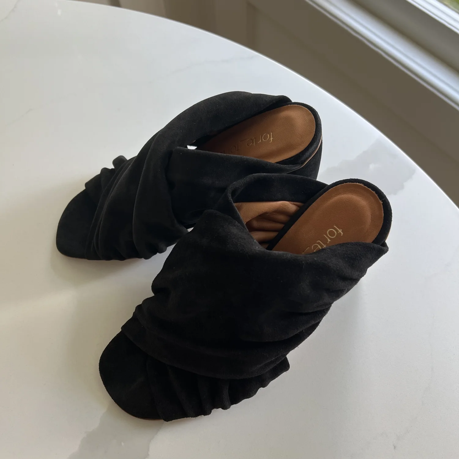Black suede heels by Forte_Forte. Made in Italy. No box unfortunately. These are a pair of black suede heeled mules. They feature a chunky block heel, an open toe design, and a gathered or ruched upper that gives them a soft, draped appearance. Size 37 Italy.