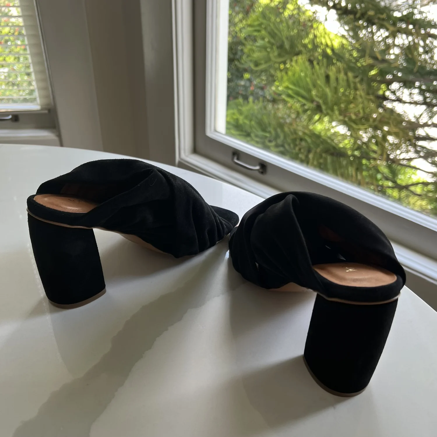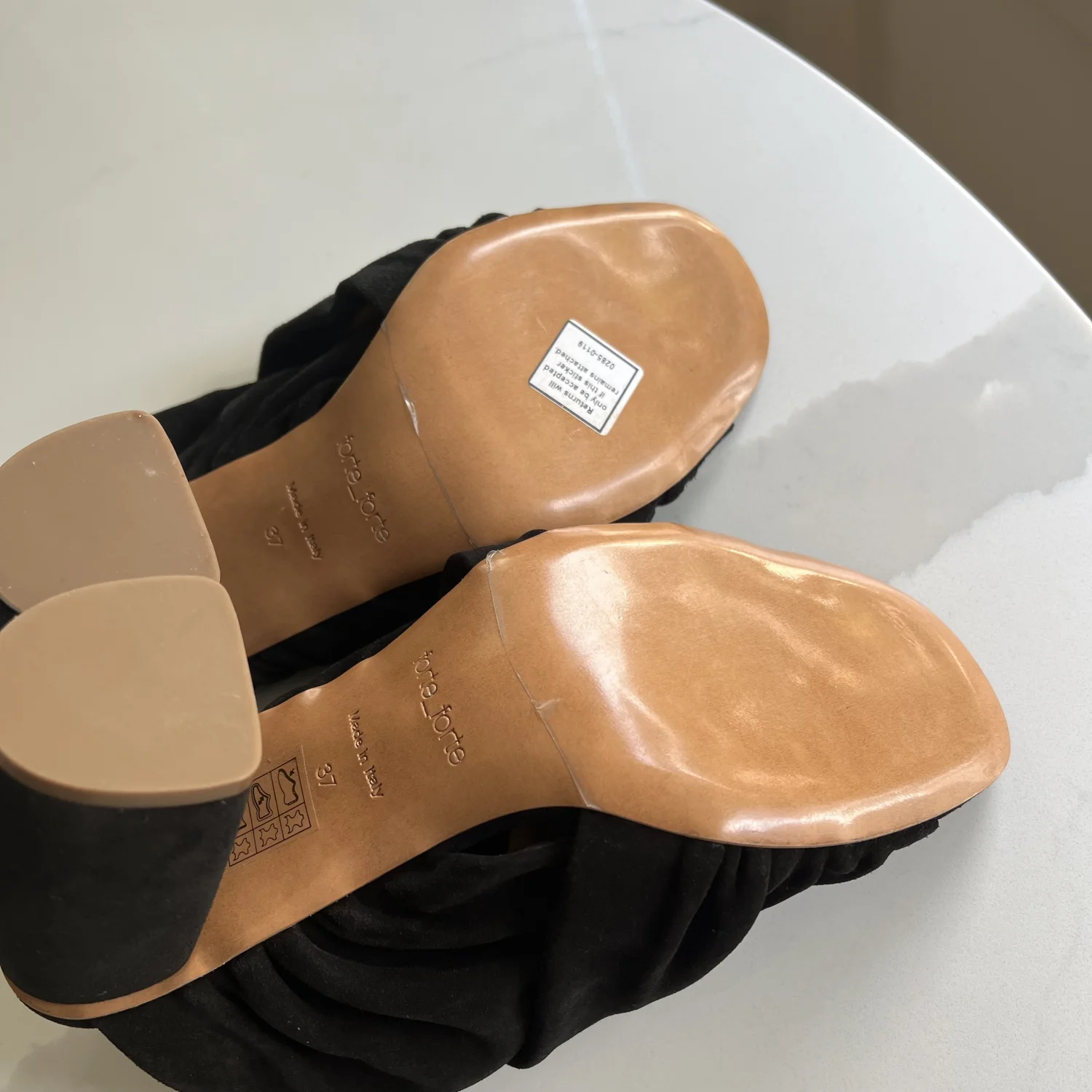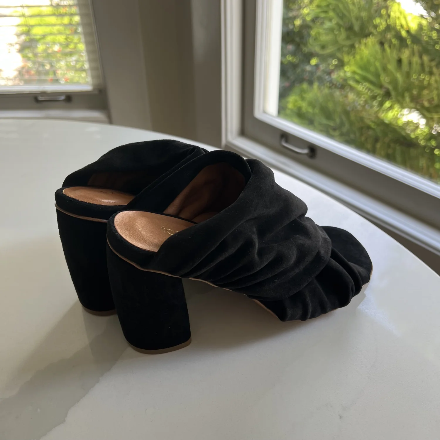 Black suede heels by Forte_Forte. Made in Italy. No box unfortunately. These are a pair of black suede heeled mules. They feature a chunky block heel, an open toe design, and a gathered or ruched upper that gives them a soft, draped appearance. Size 37 Italy.