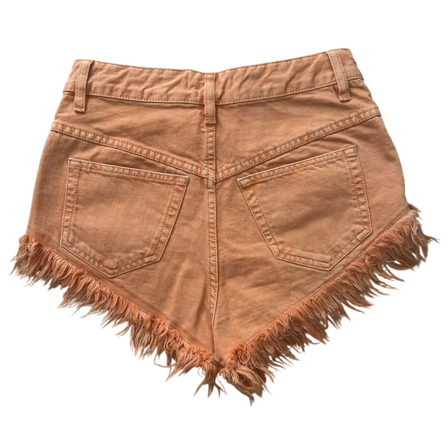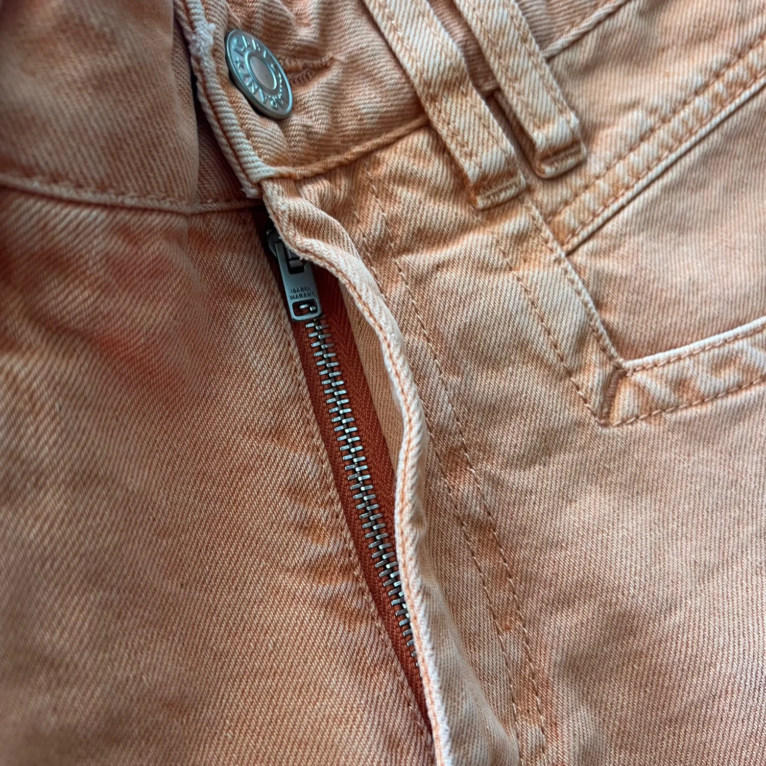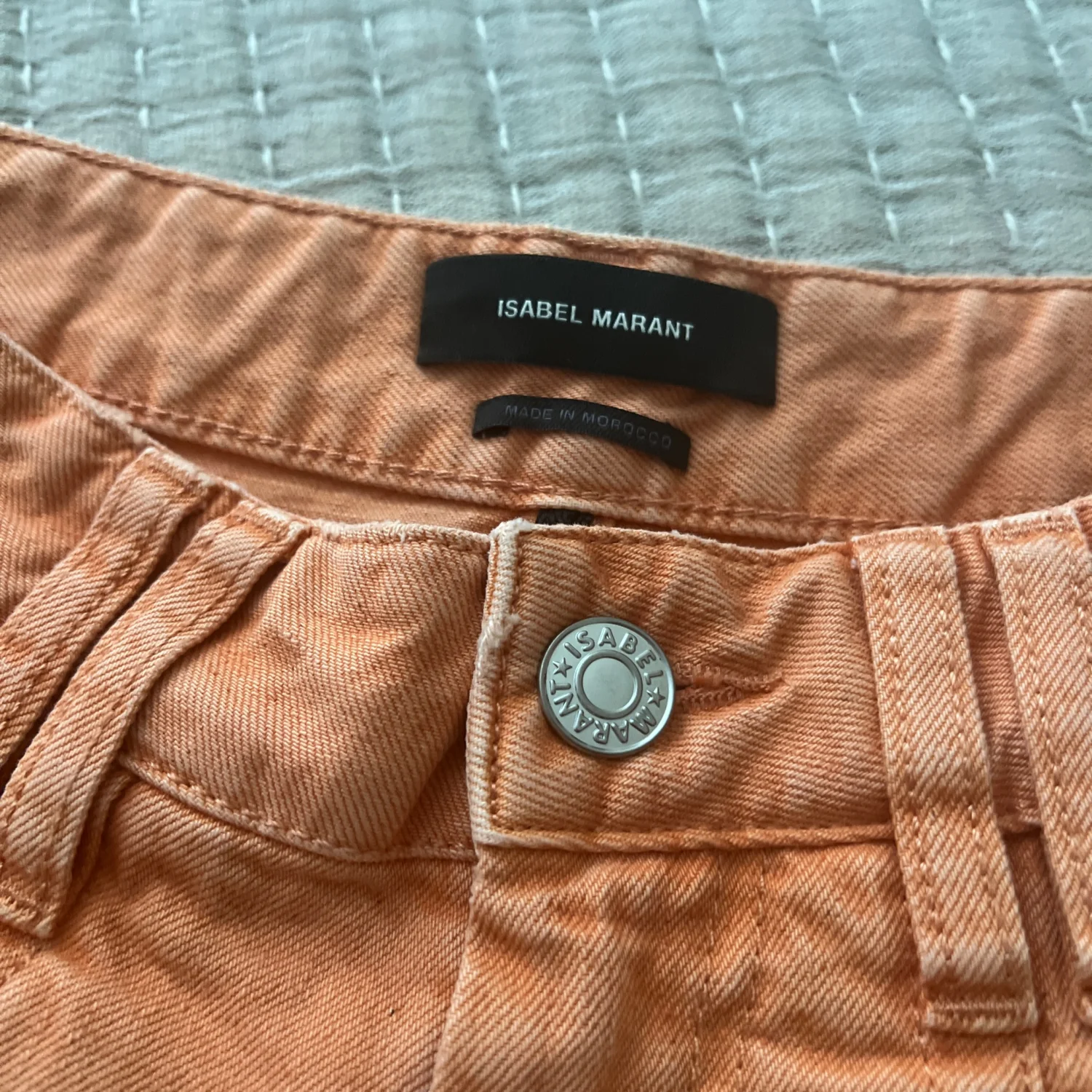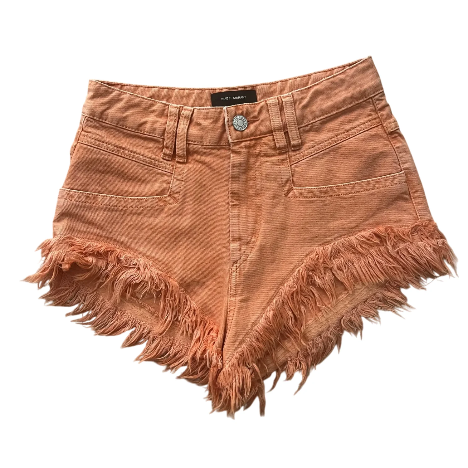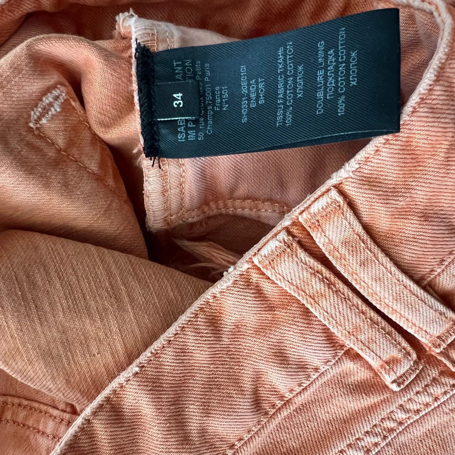 Isabel Marant orange denim shorts with frayed edges and a zipper closure. The shorts are in excellent condition with no visible damage. Size 34 FR = XS