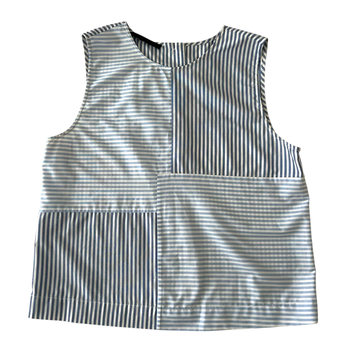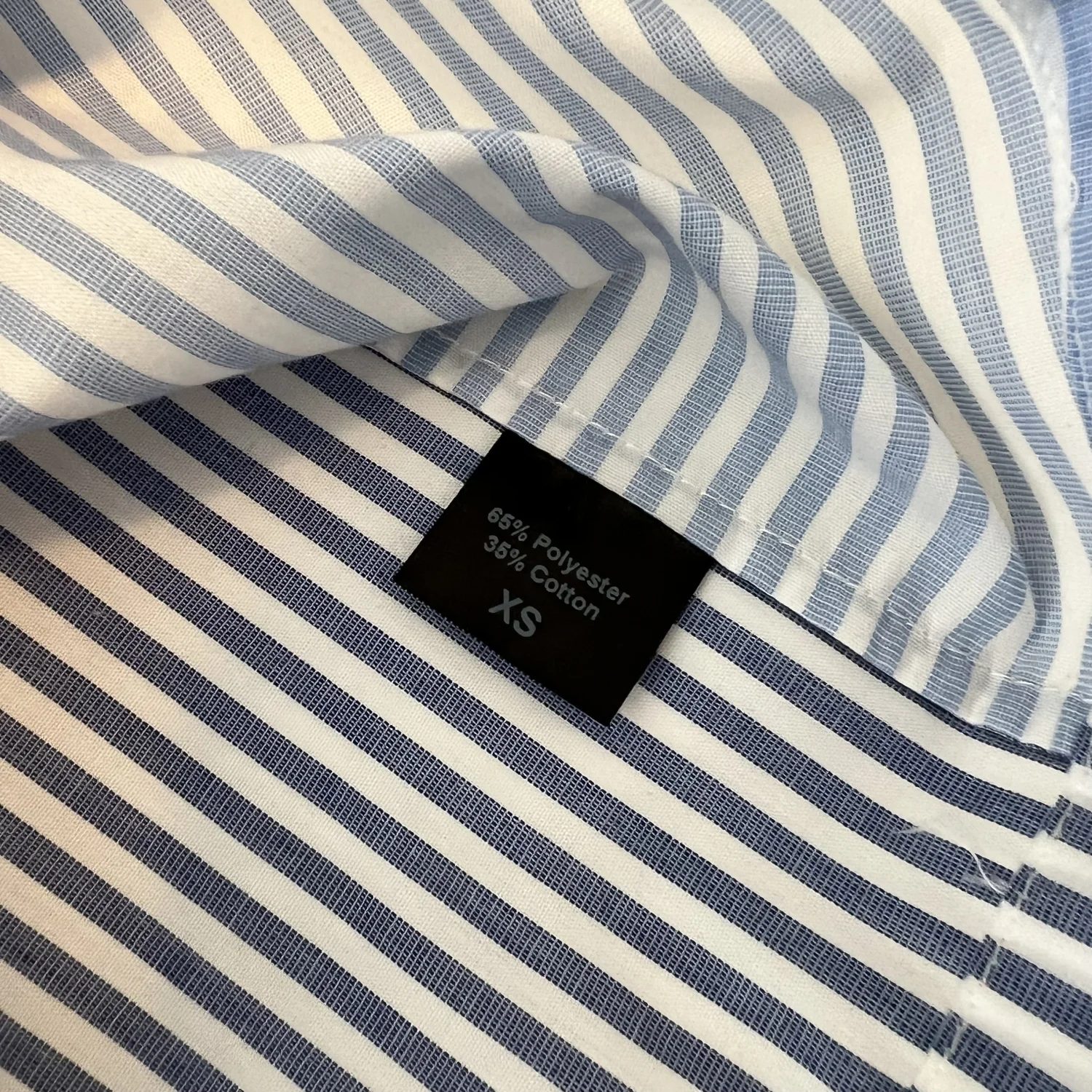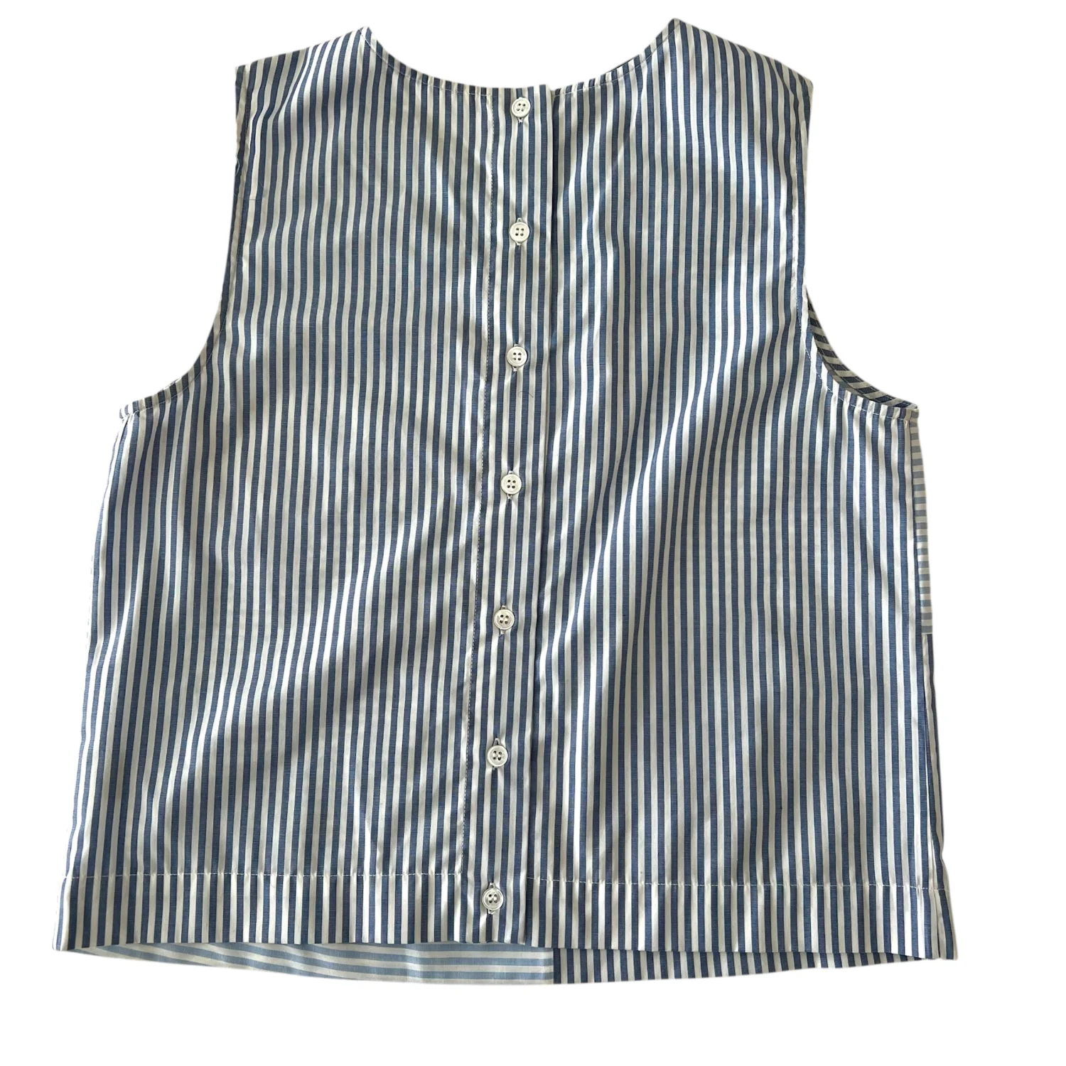 Jenni Kayne top. 60% polyester, 40% cotton. It is blue and white striped with a label inside. The tank top is sleeveless. Size XS. Buttons on back.