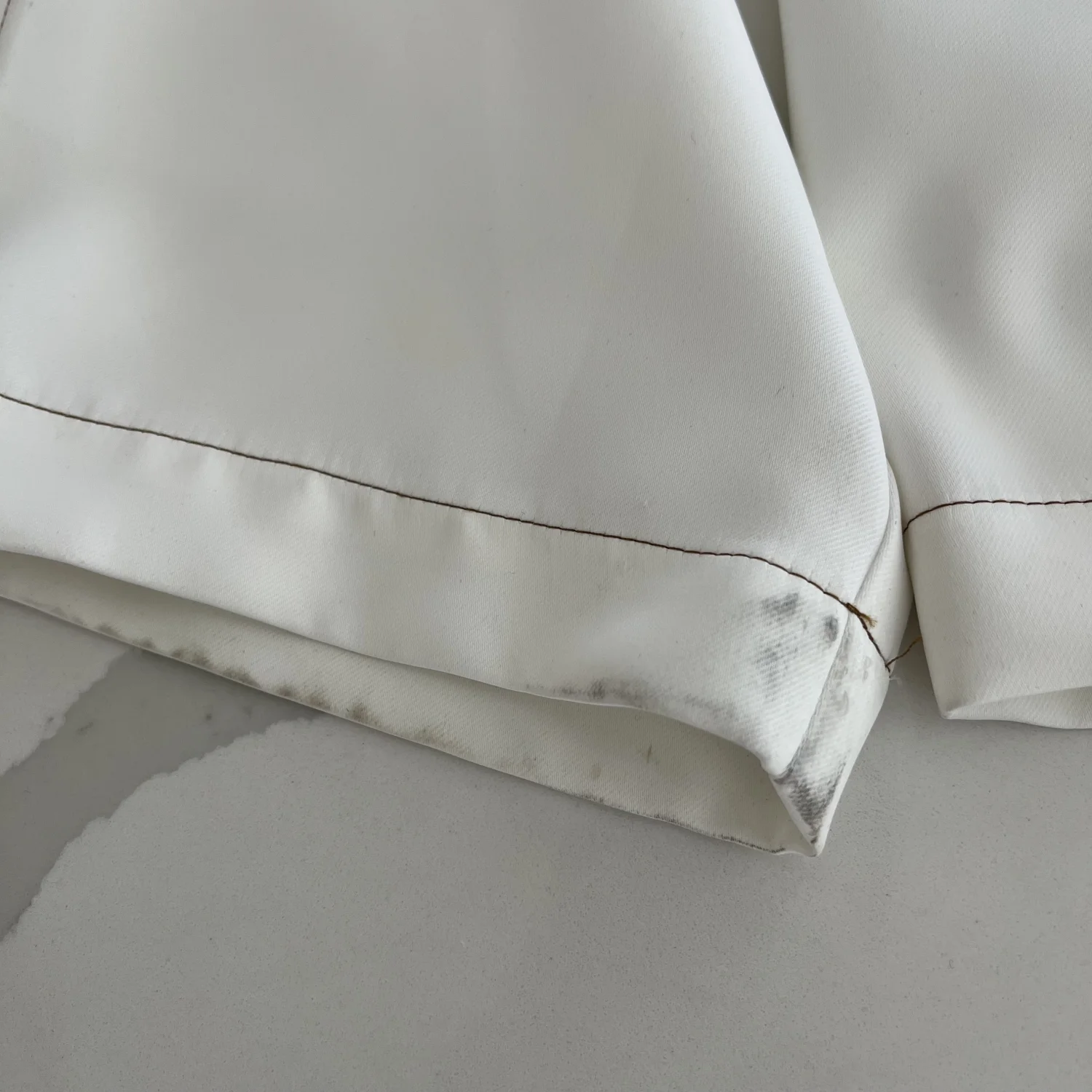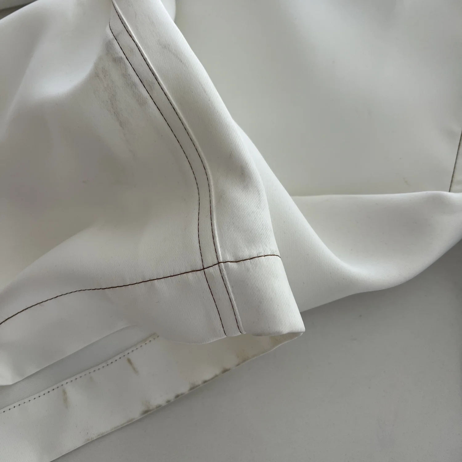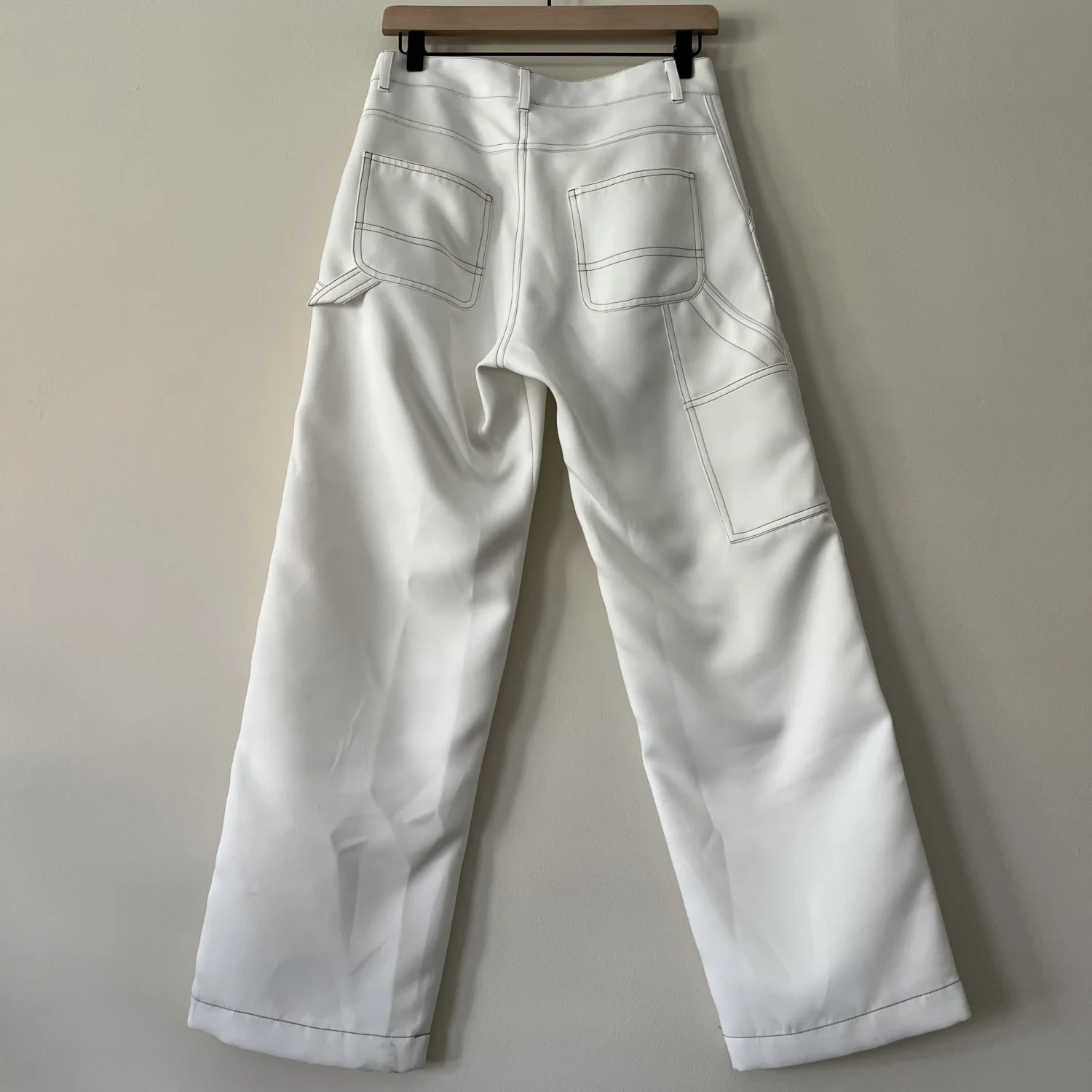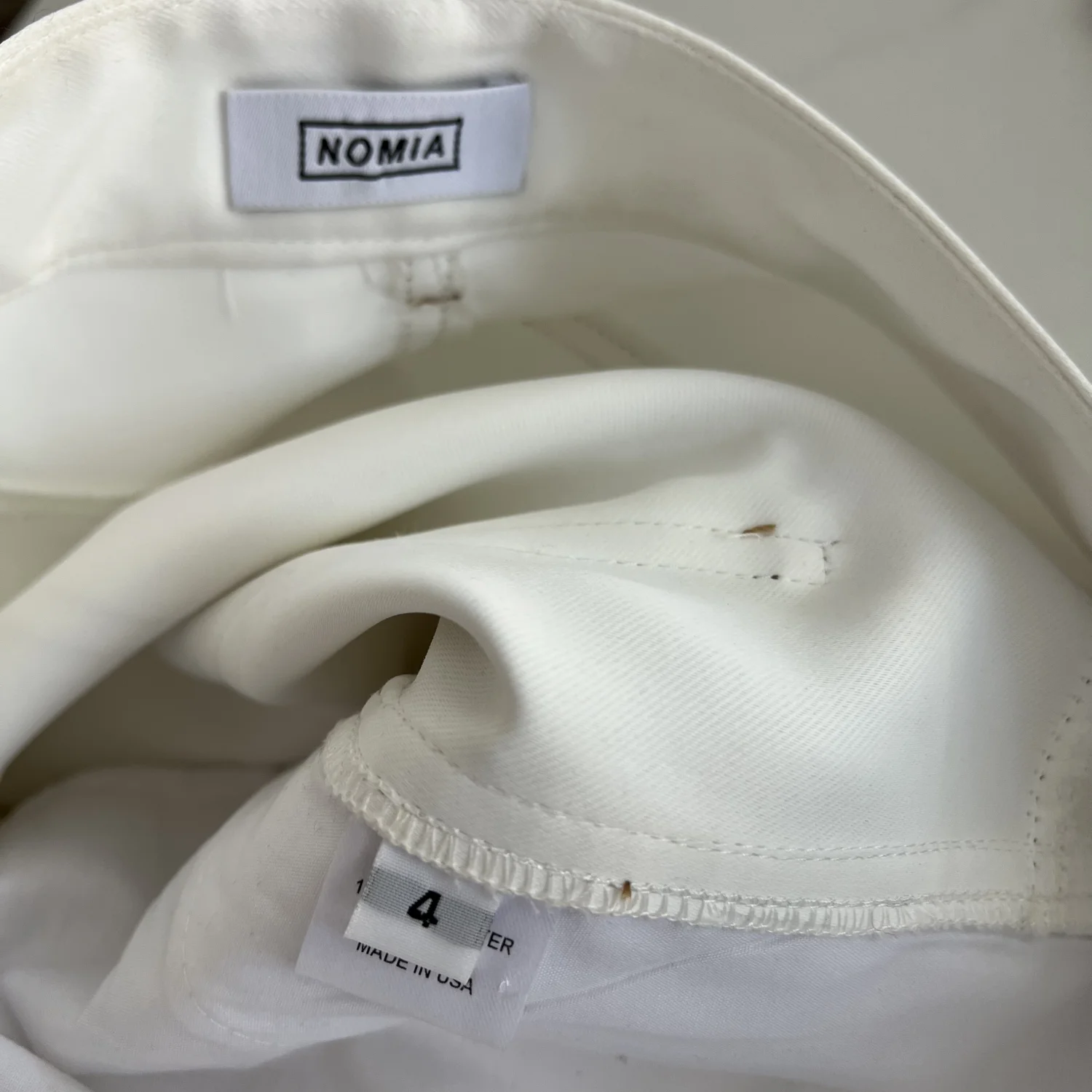 Size 4. Nomia Painter Pants. 100% Polyester. Made in USA. Note the discoloration throughout.