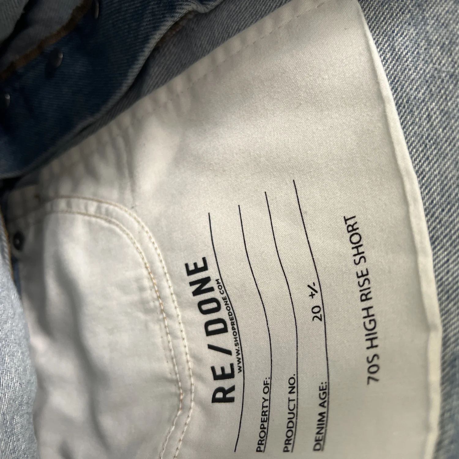 70s high rise short made of vintage denim, by RE/DONE. Leather patch on back. Size 27. Button fly.