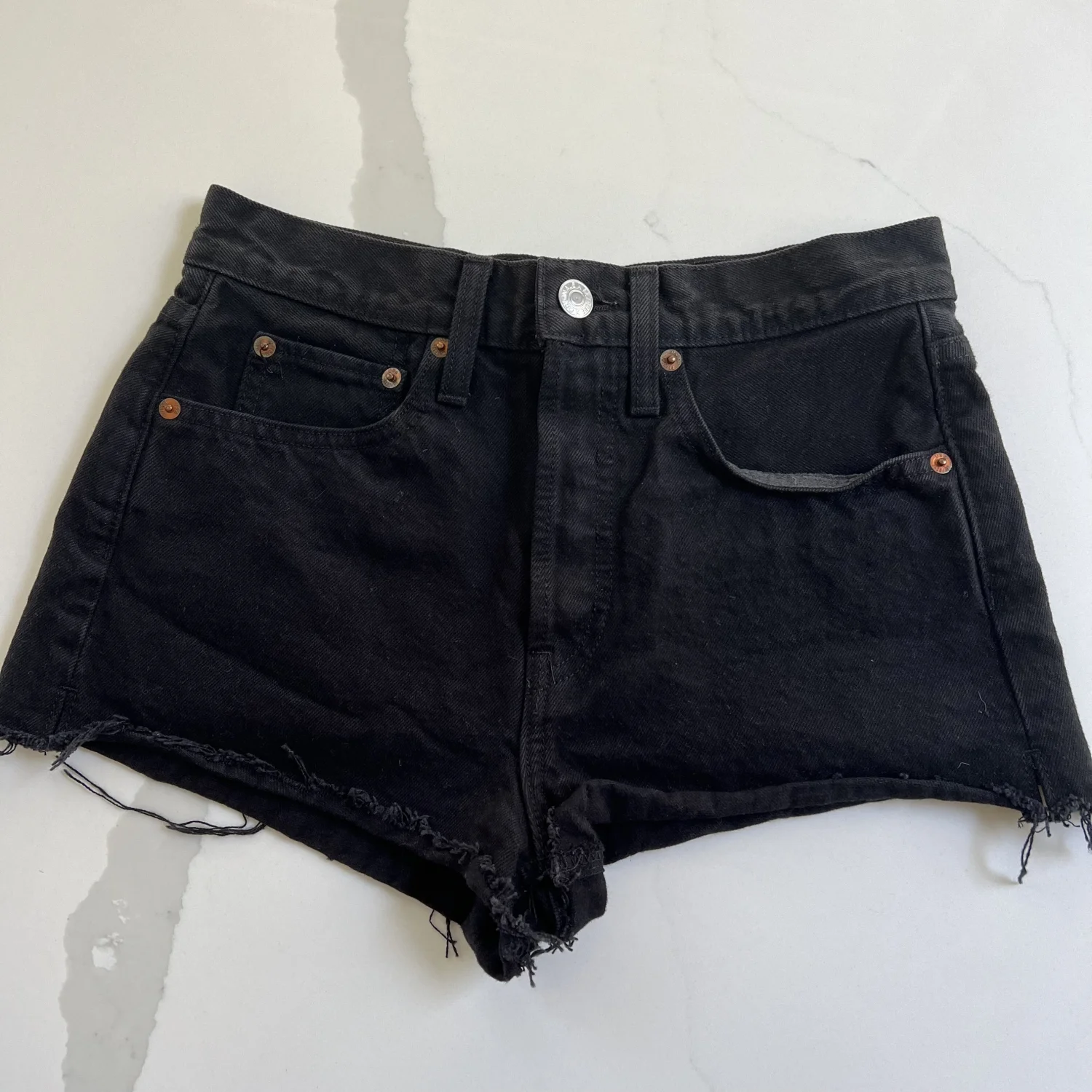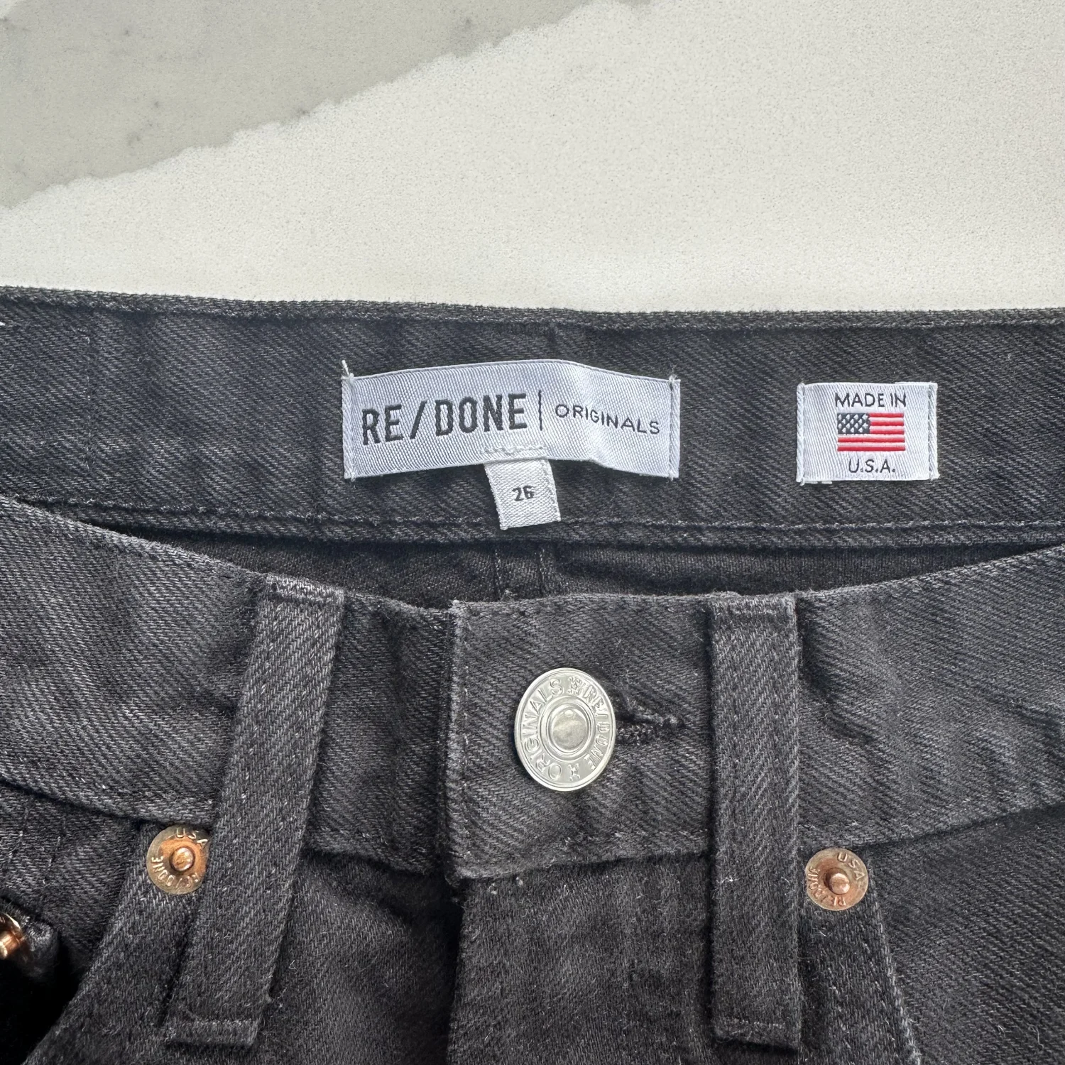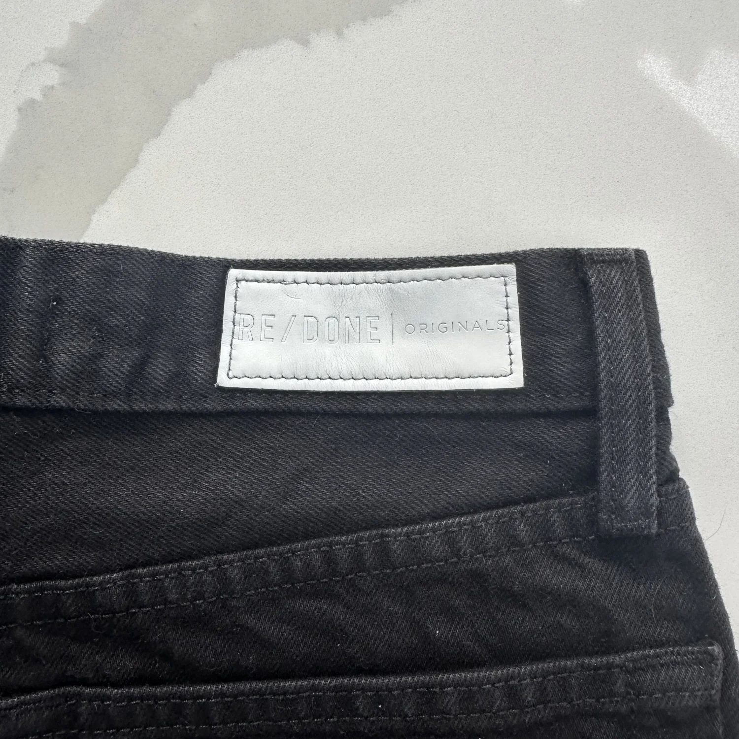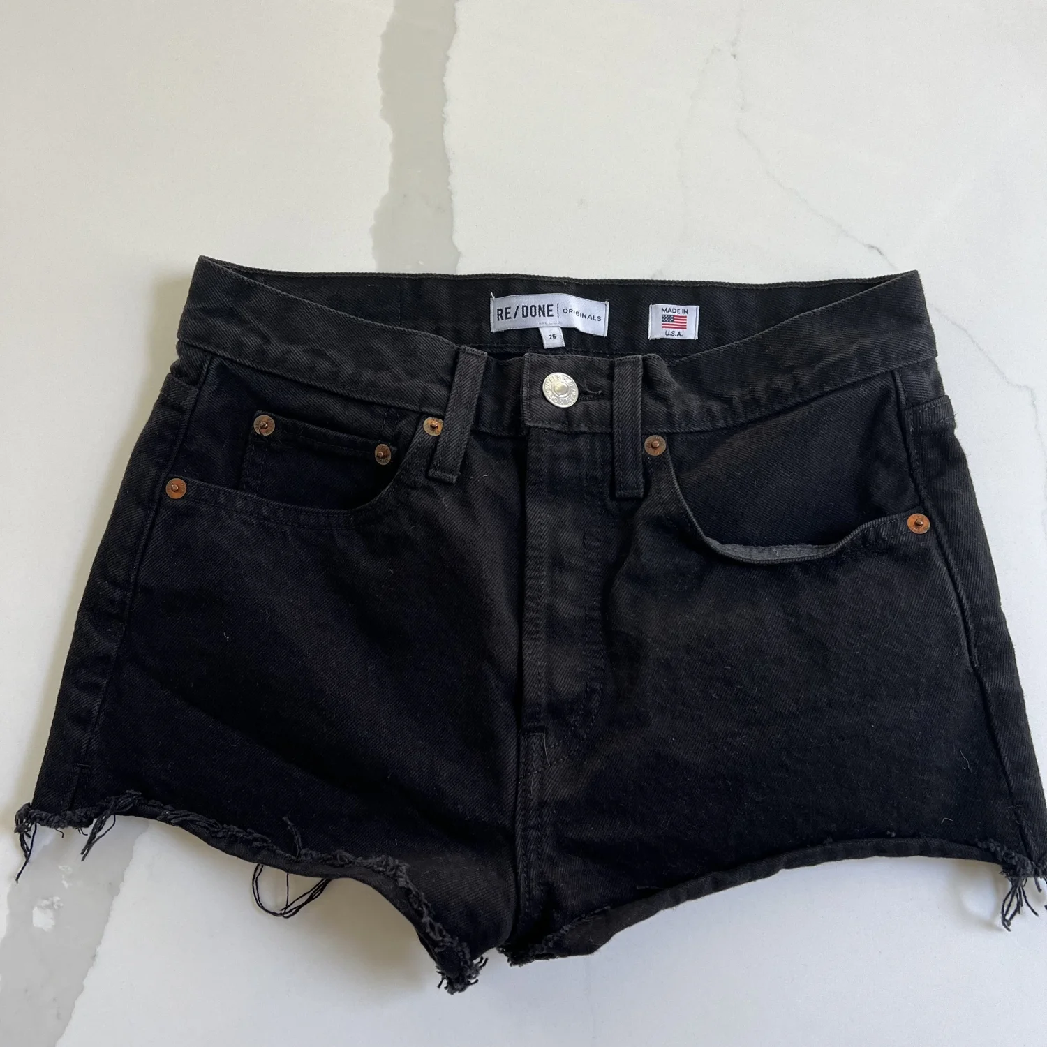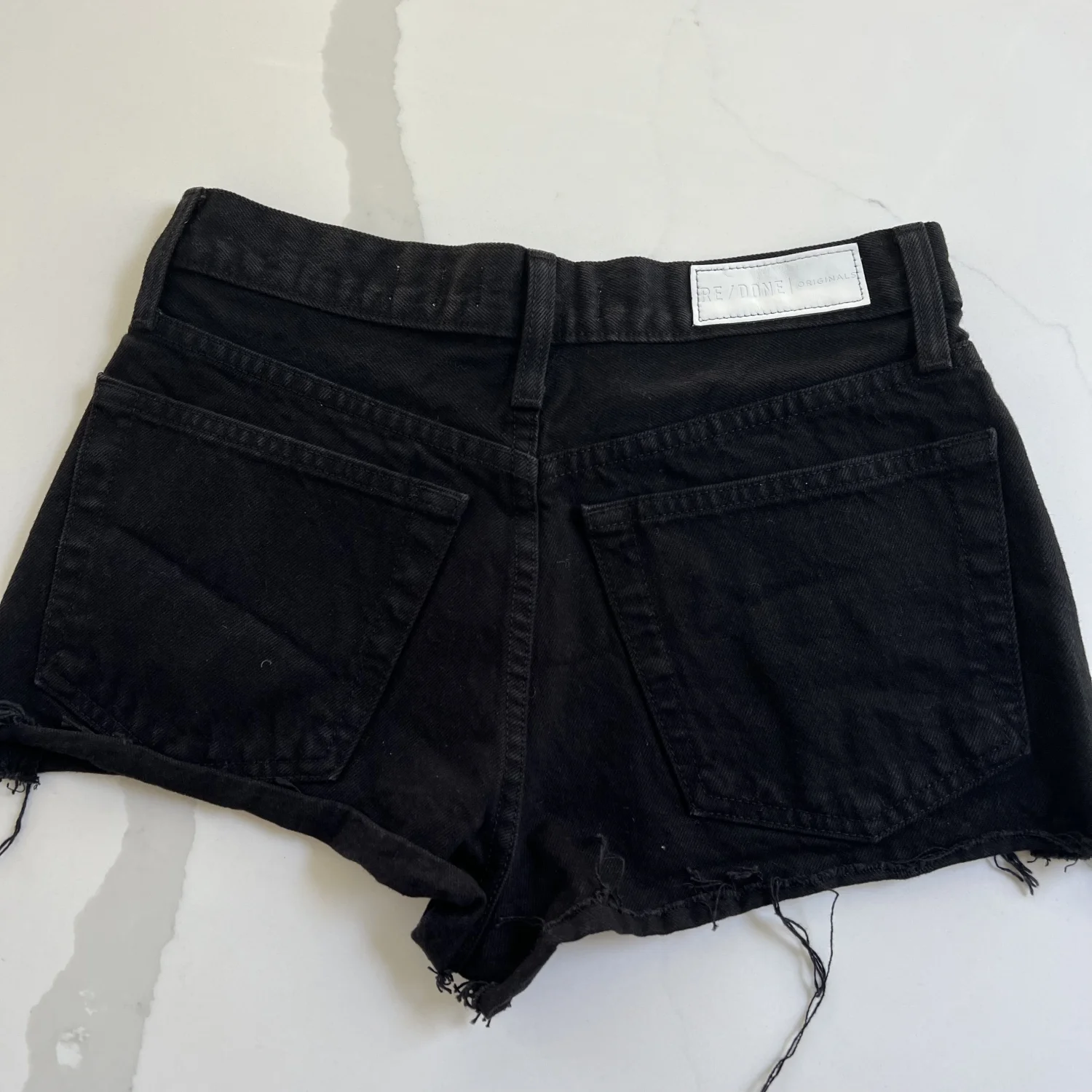 RE/DONE black mid-rise shorts with raw-edge trim, slit pockets, and button closure. Waist: 26” Length: 10-11”