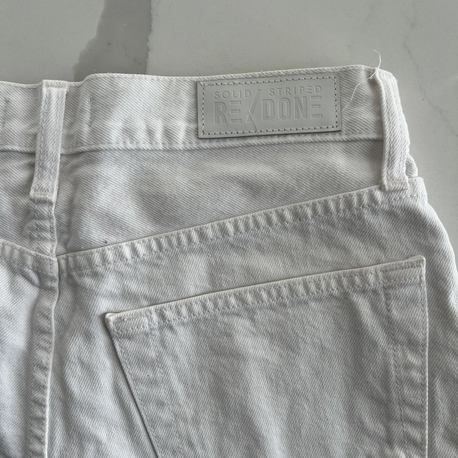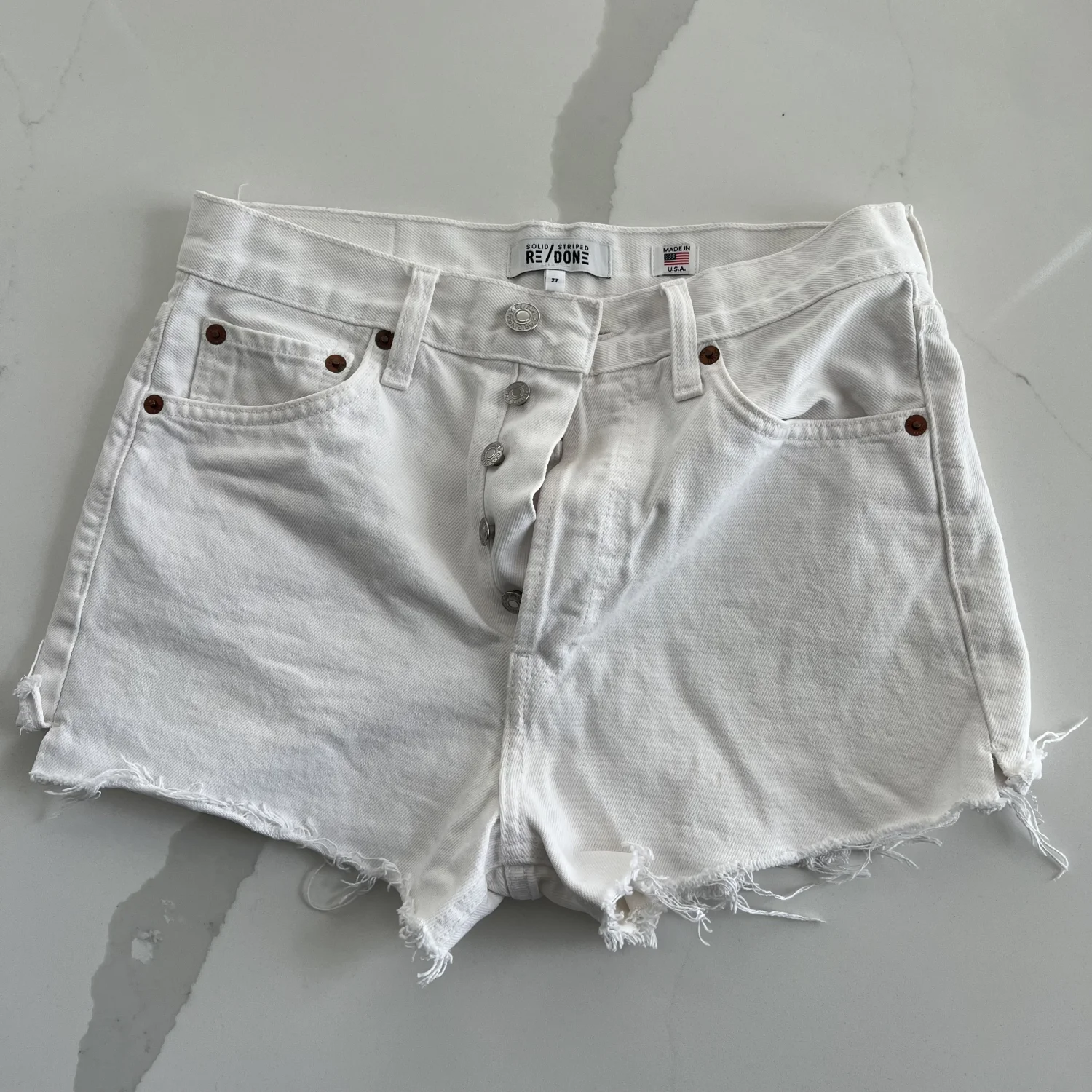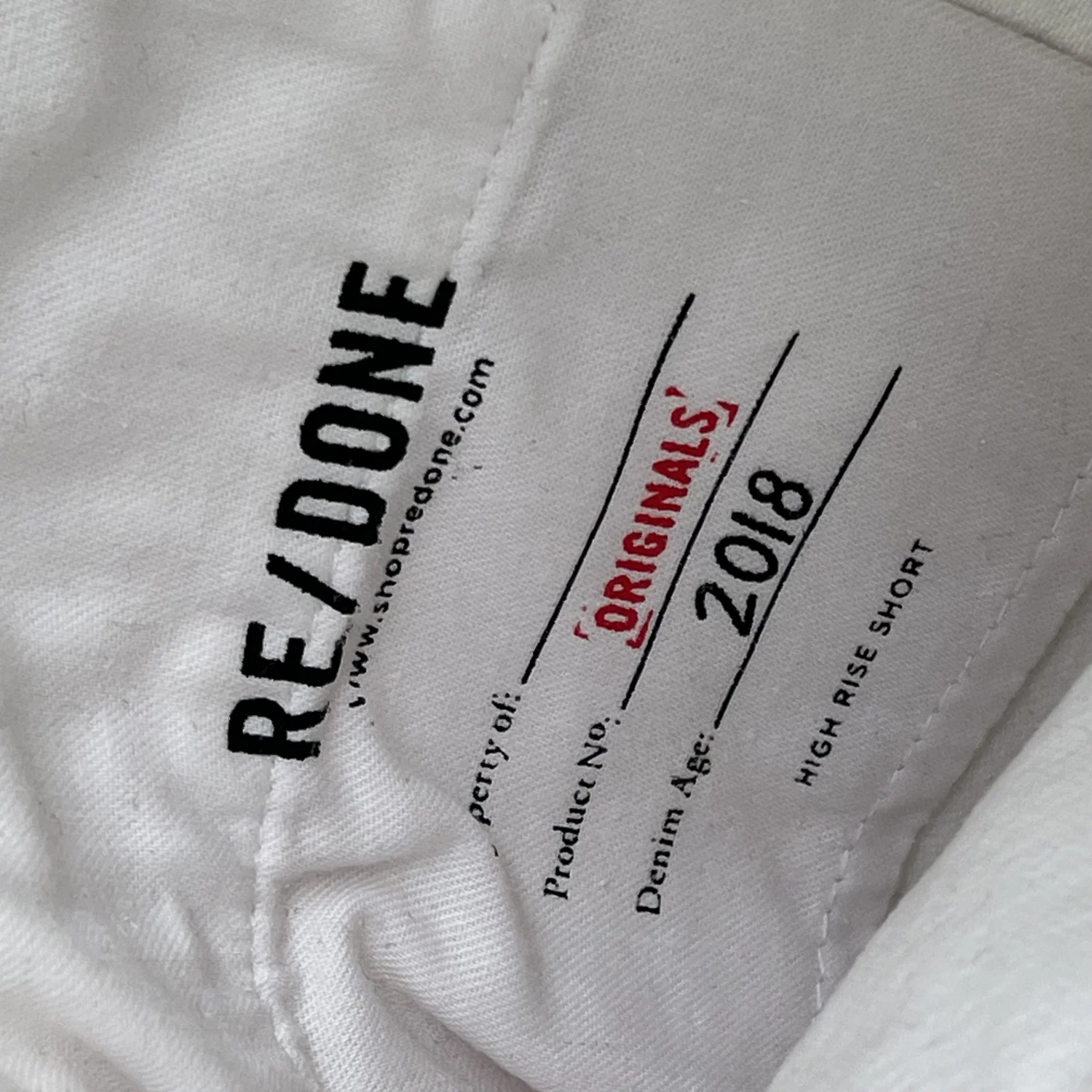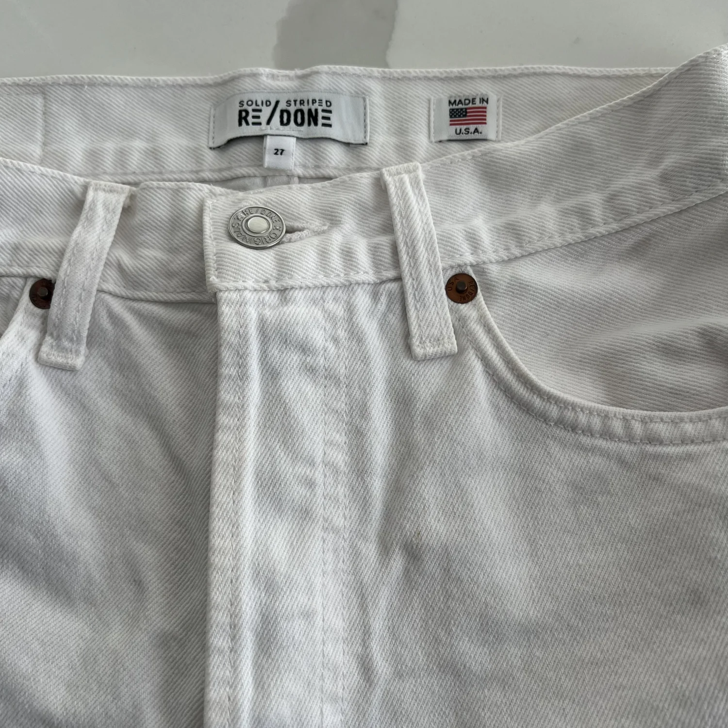 Re/Done x Solid Stripes collab. Sold as is. Some small imperfections pictured. Otherwise great condition. High rise white denim shorts. Super cute pin on back pocket. Leather patch with logo. Button fly.