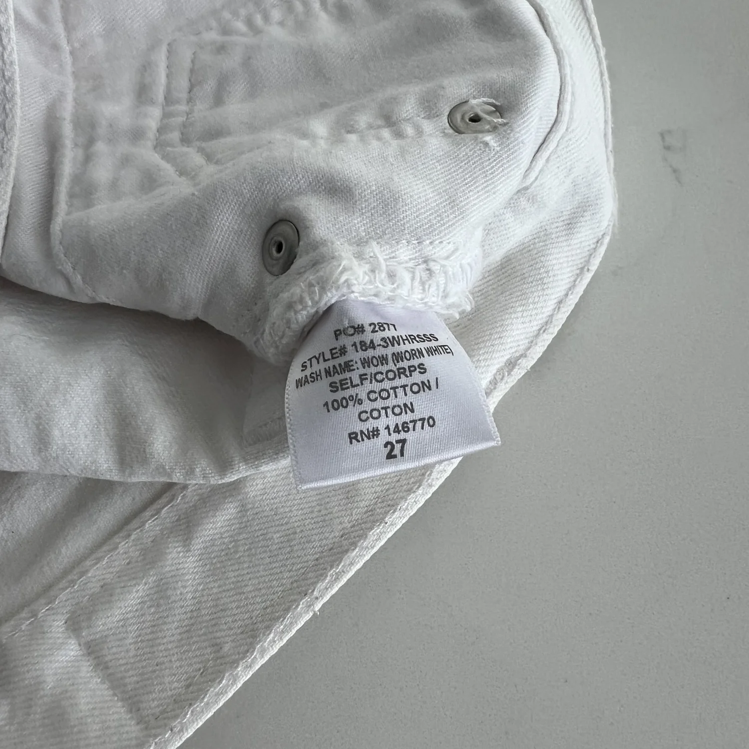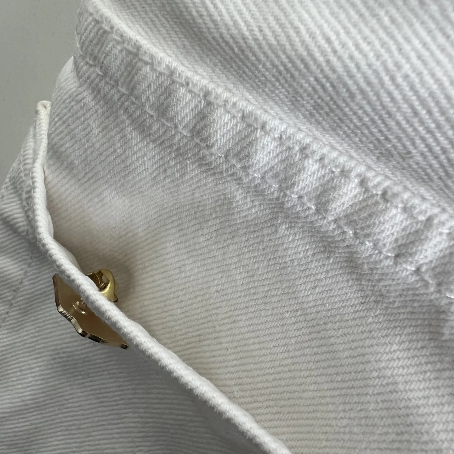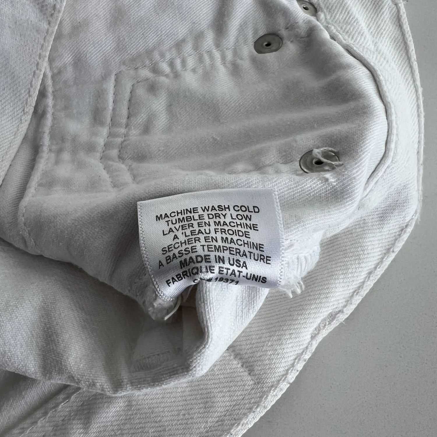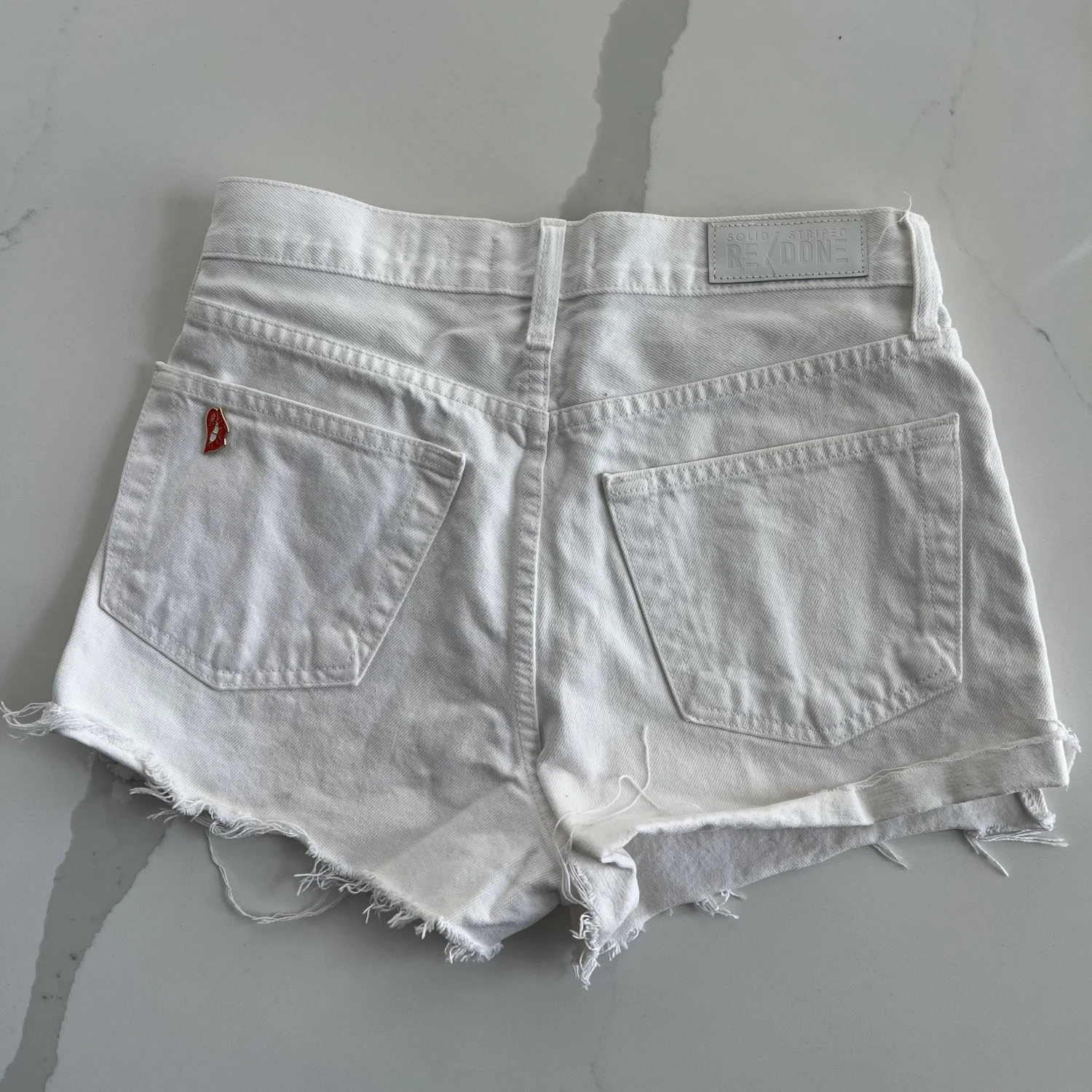 Re/Done x Solid Stripes collab. Sold as is. Some small imperfections pictured. Otherwise great condition. High rise white denim shorts. Super cute pin on back pocket. Leather patch with logo. Button fly.