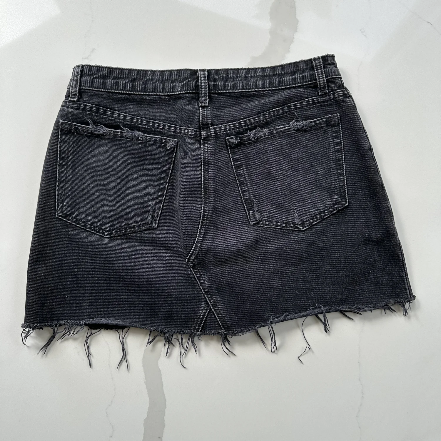Black mini Davidson skirt with raw-edge, studded, distressed accents. Slit pockets + button closure. Waist: 29” Length: 14.25”