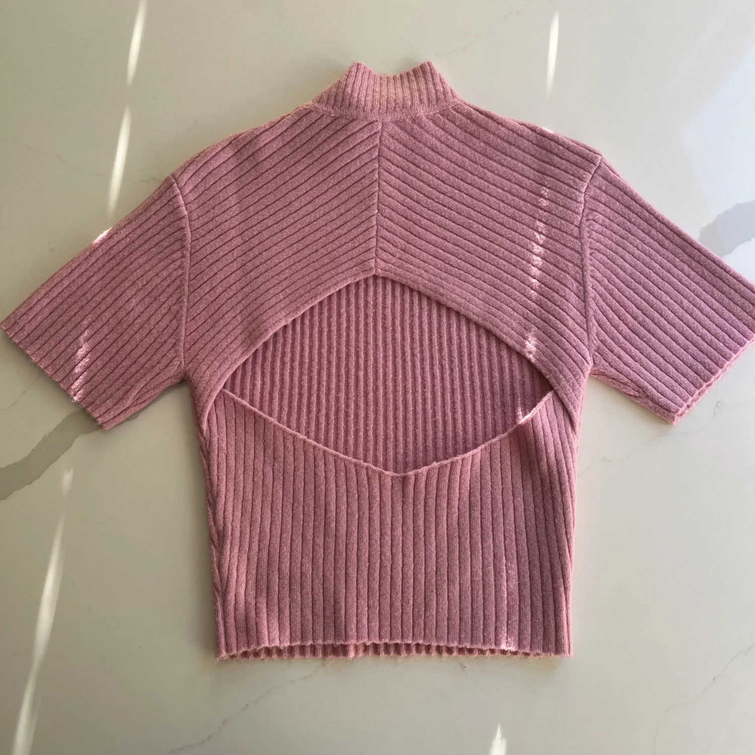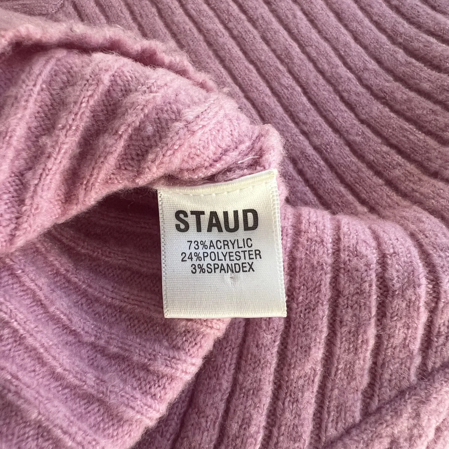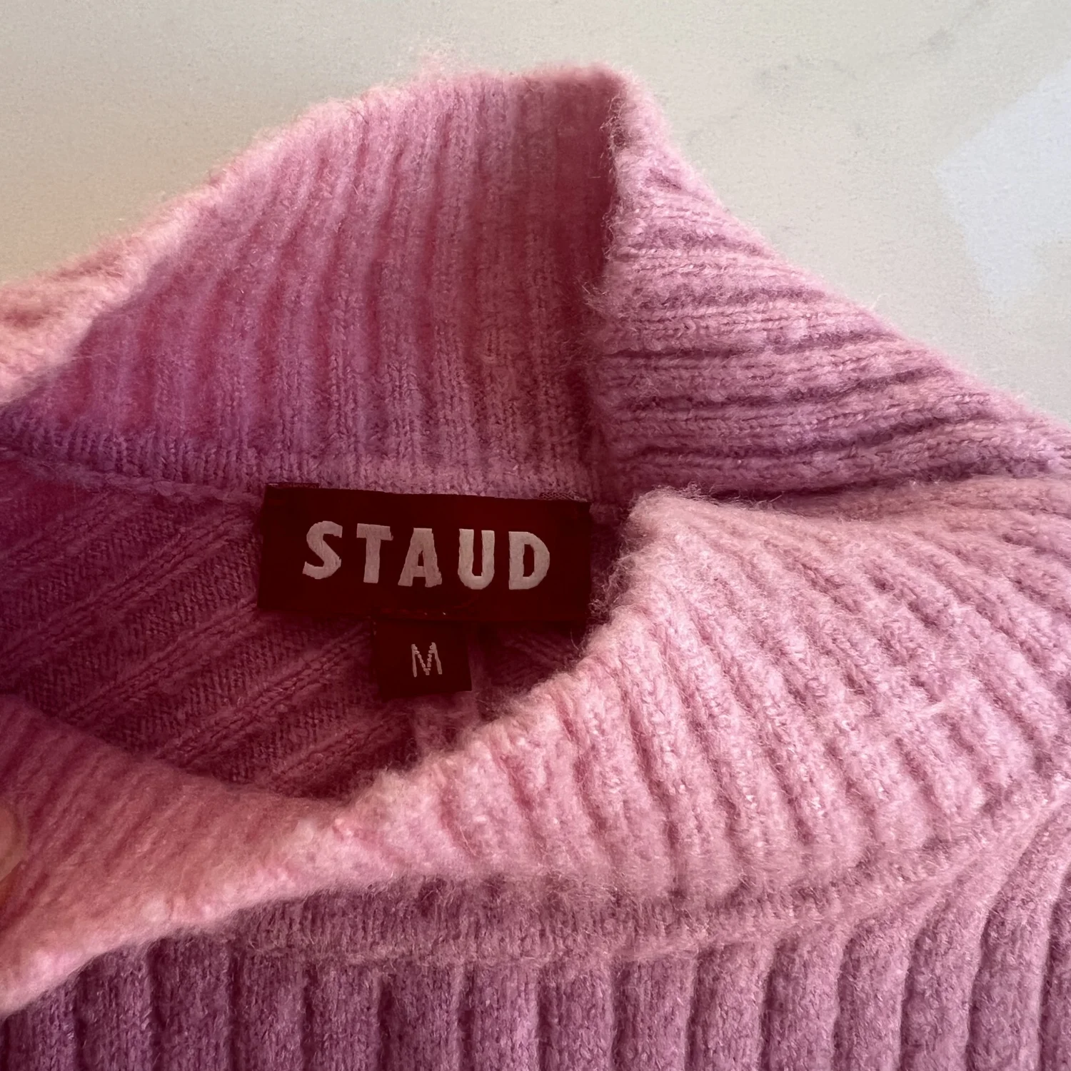 Staud - Claudia Cutout short sleeve Sweater. Bubblegum pink. Slim fit with with short sleeve and mock neck. Cut out / exposed angled back with a slightly cropped fit.
