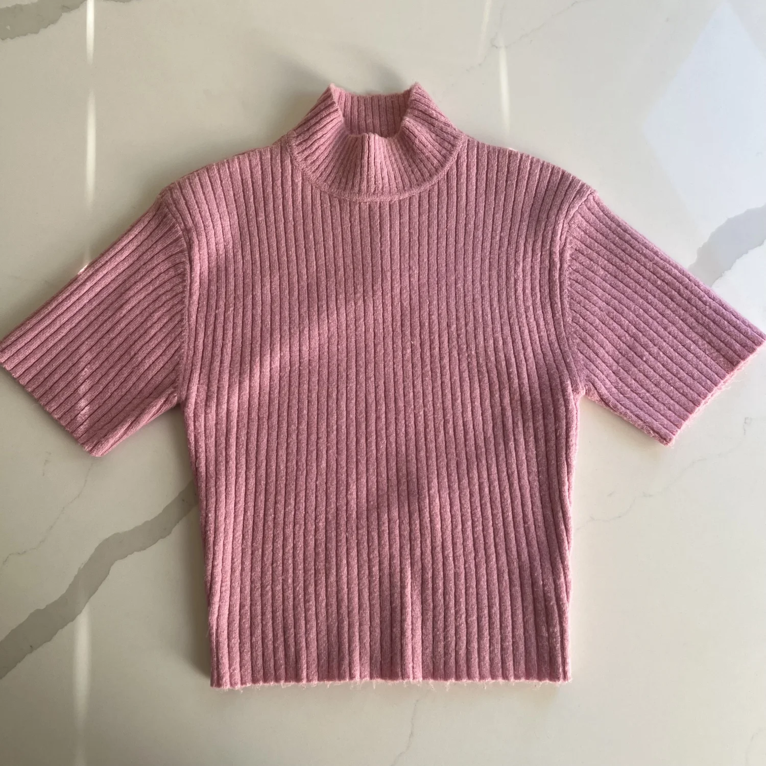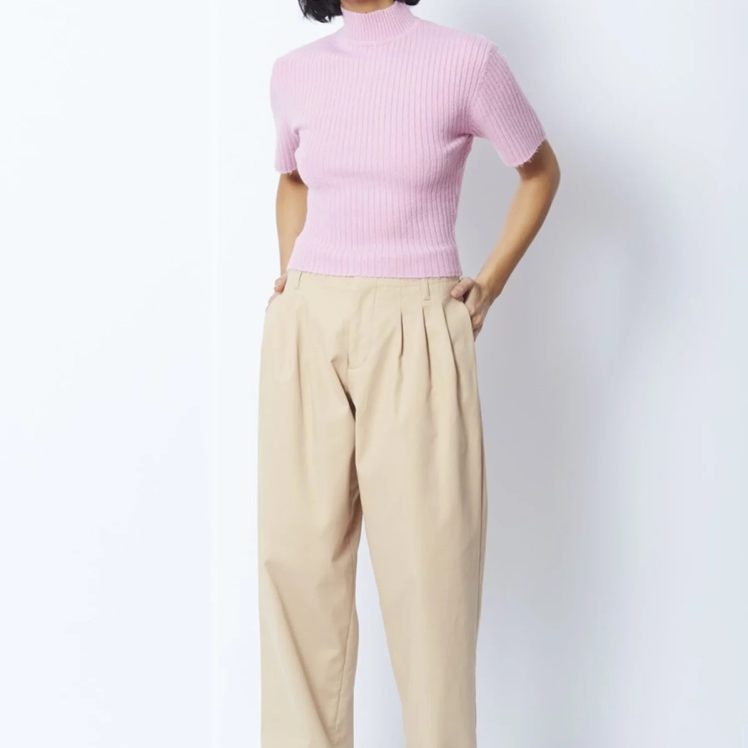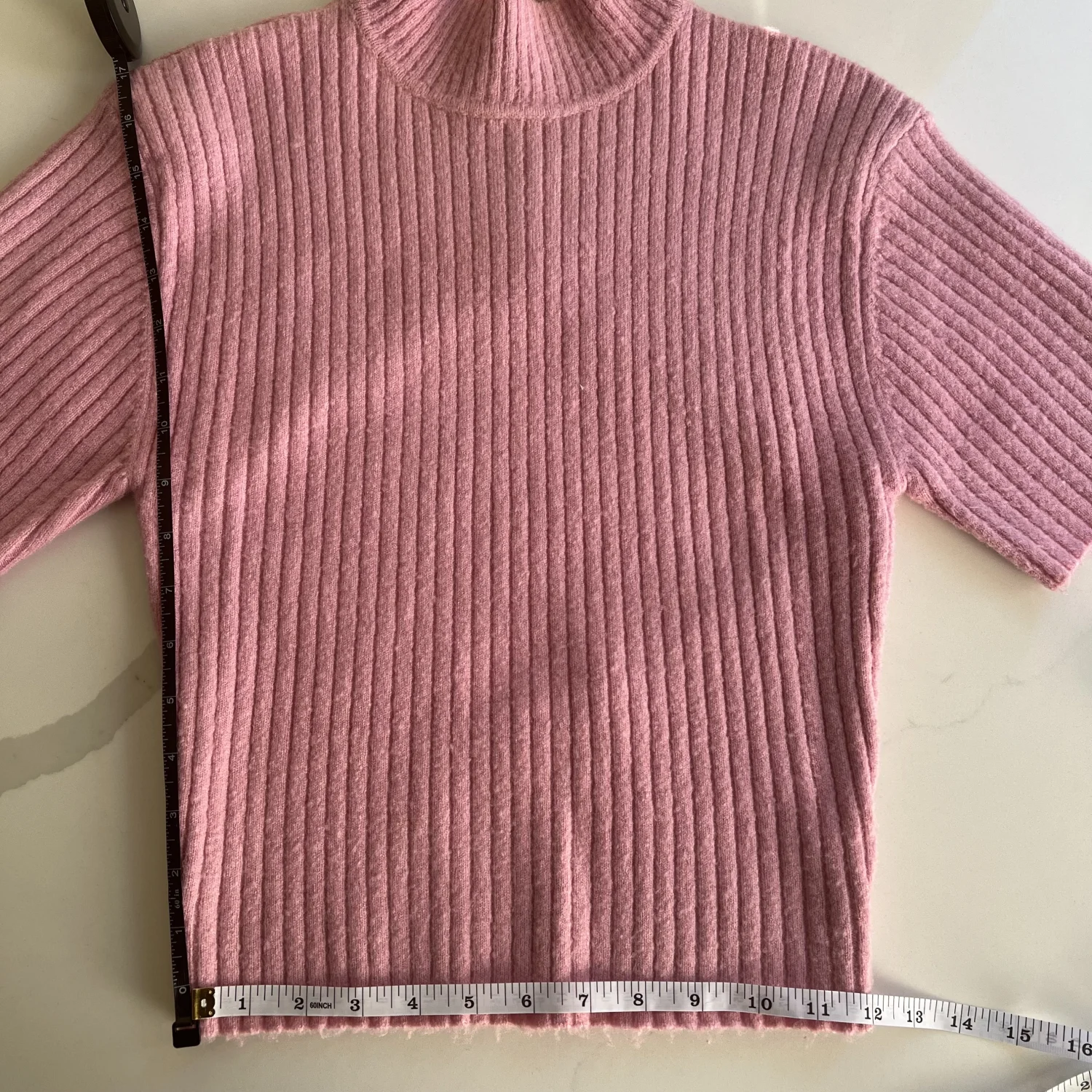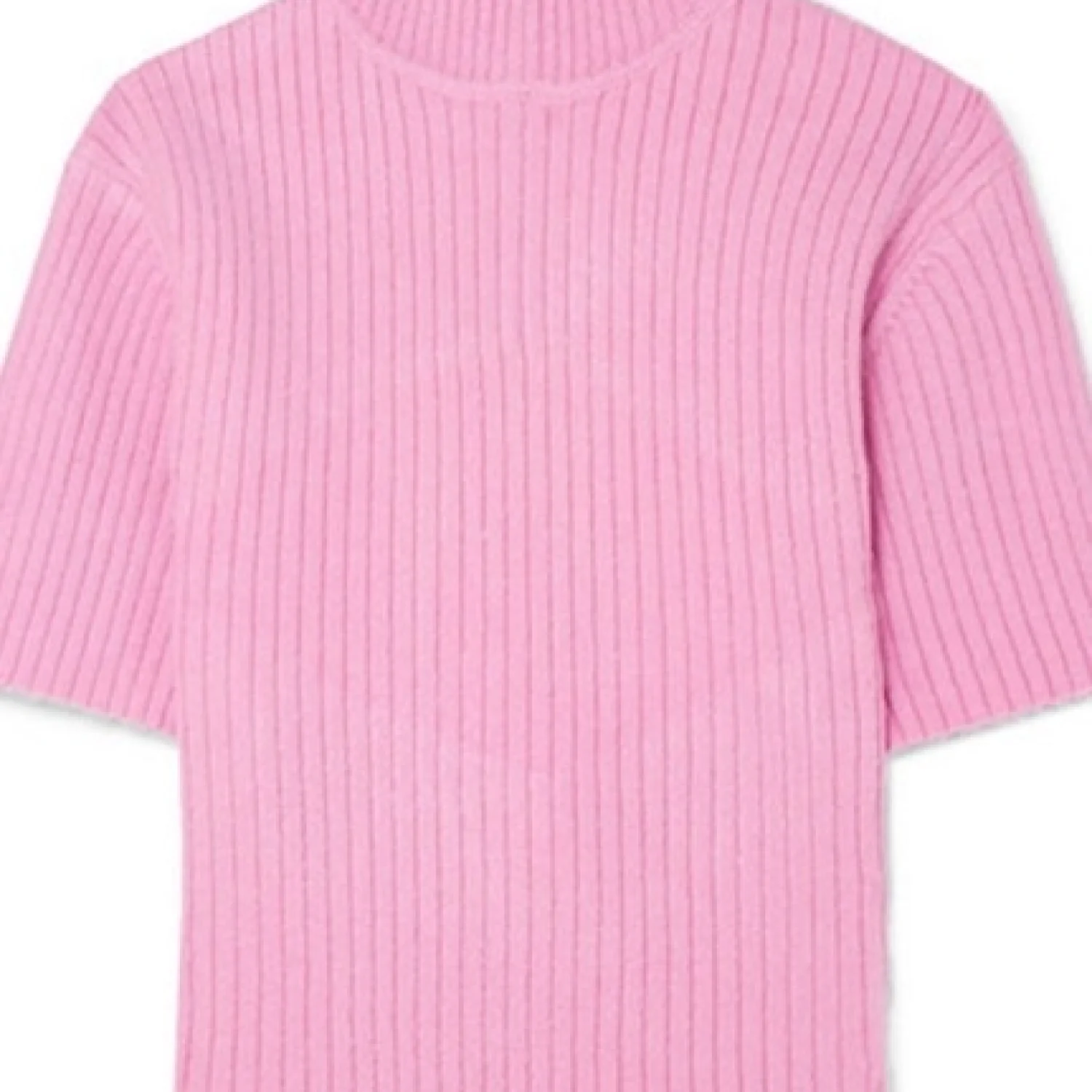 Staud - Claudia Cutout short sleeve Sweater. Bubblegum pink. Slim fit with with short sleeve and mock neck. Cut out / exposed angled back with a slightly cropped fit.