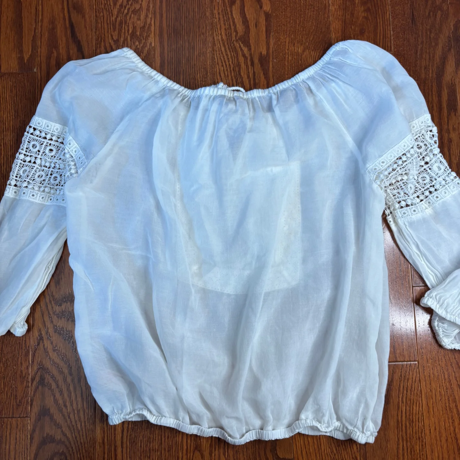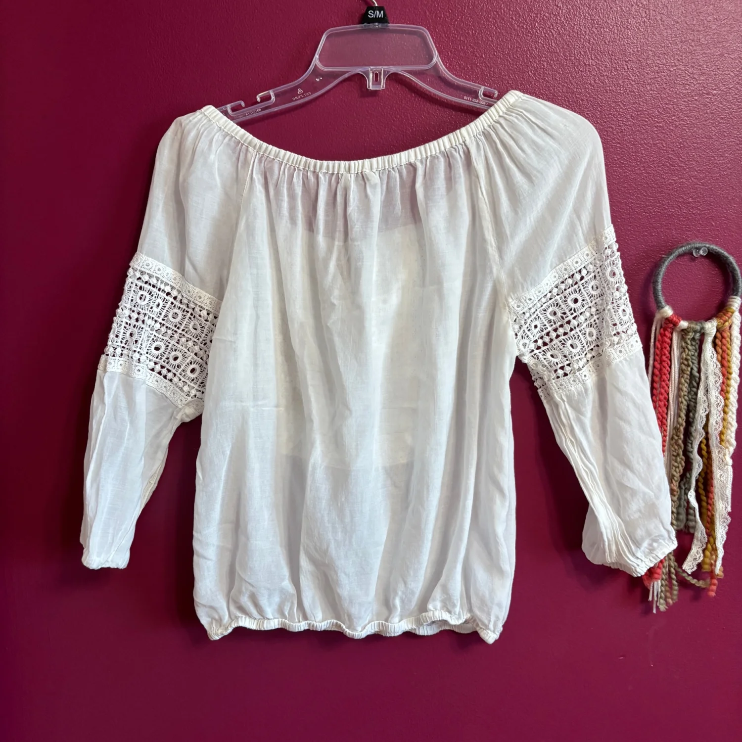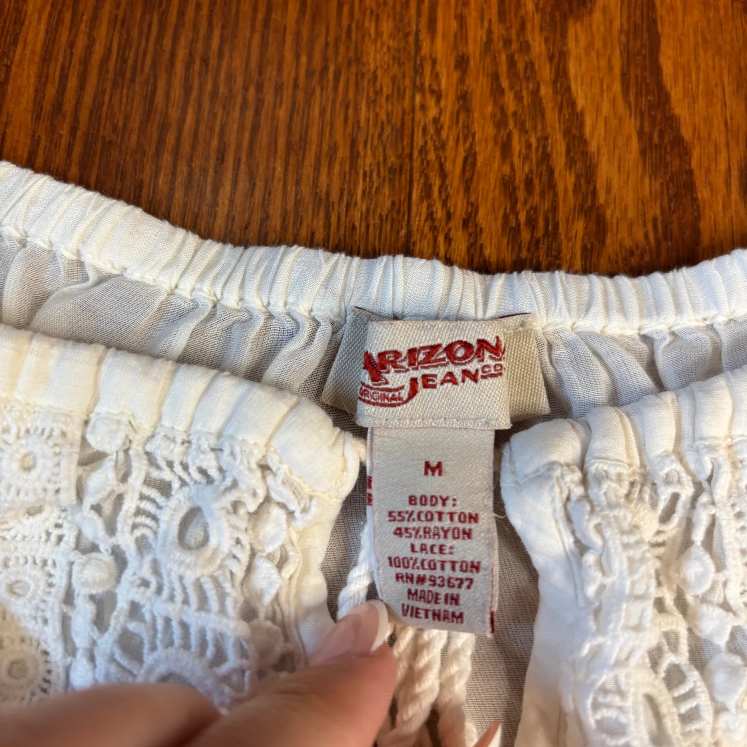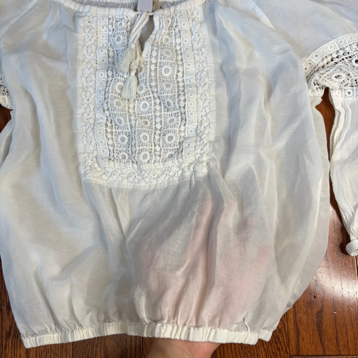 Arizona white medium blouse See-through thin lightweight material Cotton and rayon materials Lace details This item is a white off-the-shoulder blouse featuring detailed crochet lace panels on the chest and sleeves, styled with long, loose sleeves and a cinched bottom. Boho, coquette, cottage core, coastal grandmother, fairycore, 70s revival