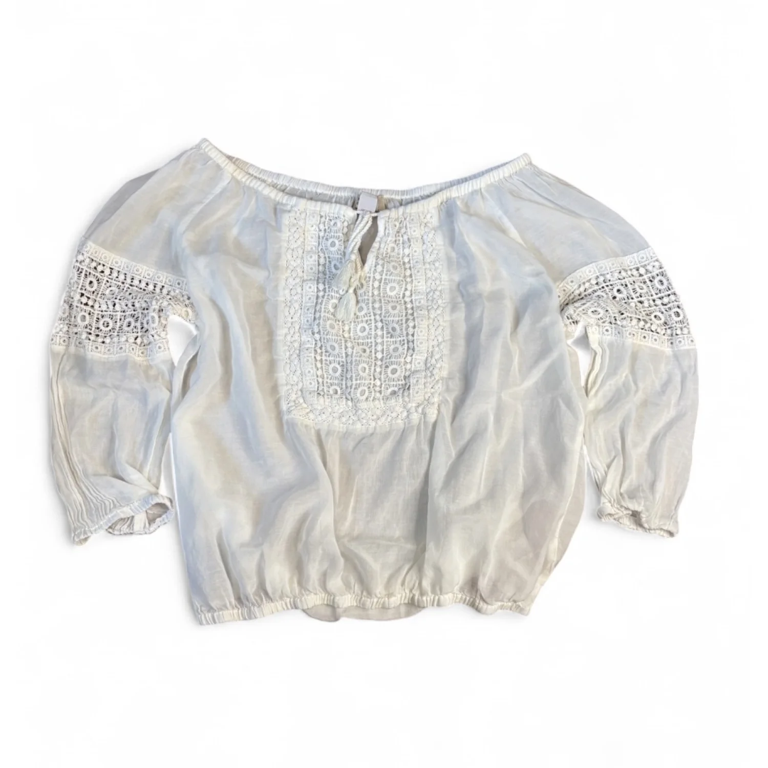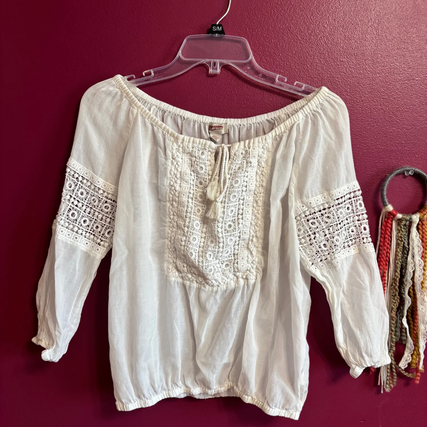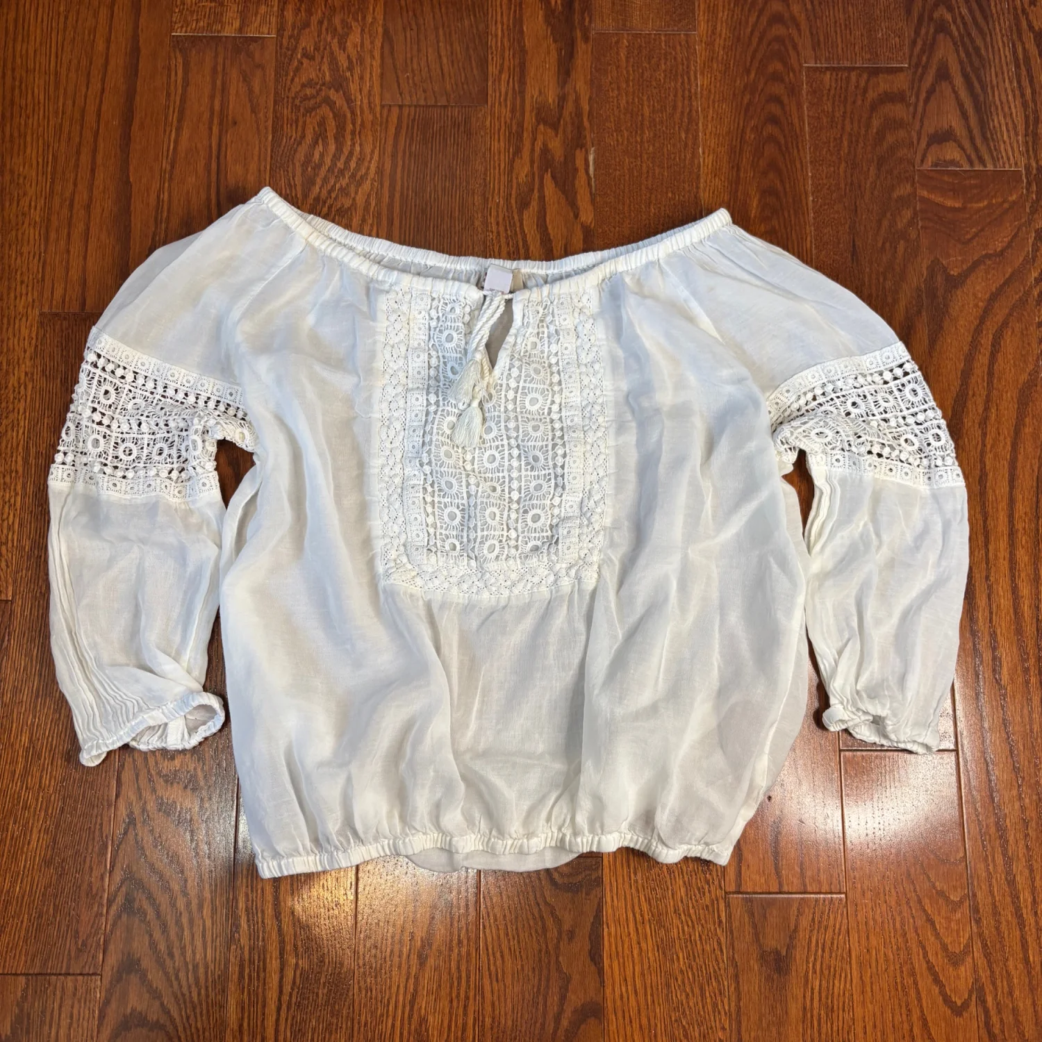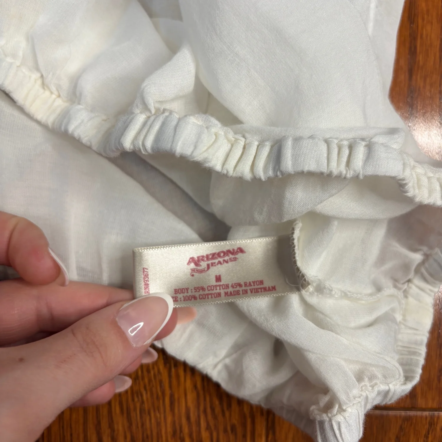 Arizona white medium blouse See-through thin lightweight material Cotton and rayon materials Lace details This item is a white off-the-shoulder blouse featuring detailed crochet lace panels on the chest and sleeves, styled with long, loose sleeves and a cinched bottom. Boho, coquette, cottage core, coastal grandmother, fairycore, 70s revival