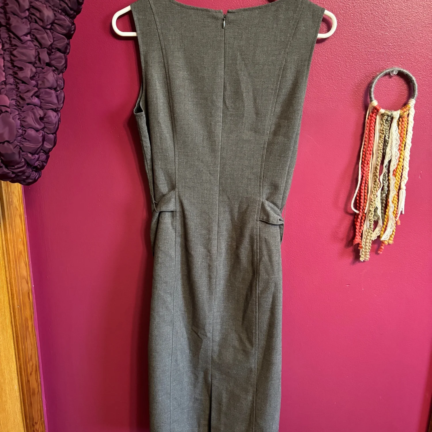 Axcess sleeveless, charcoal gray sheath dress. A notable design element is the decorative chain-link detail across the front waistline. Size small Pit to pit is about 17.5 inches Pit down is about 29 inches Great condition Business casual, office siren, corporate core, 90s, minimalist, preppy. Polyester, rayon, spandex