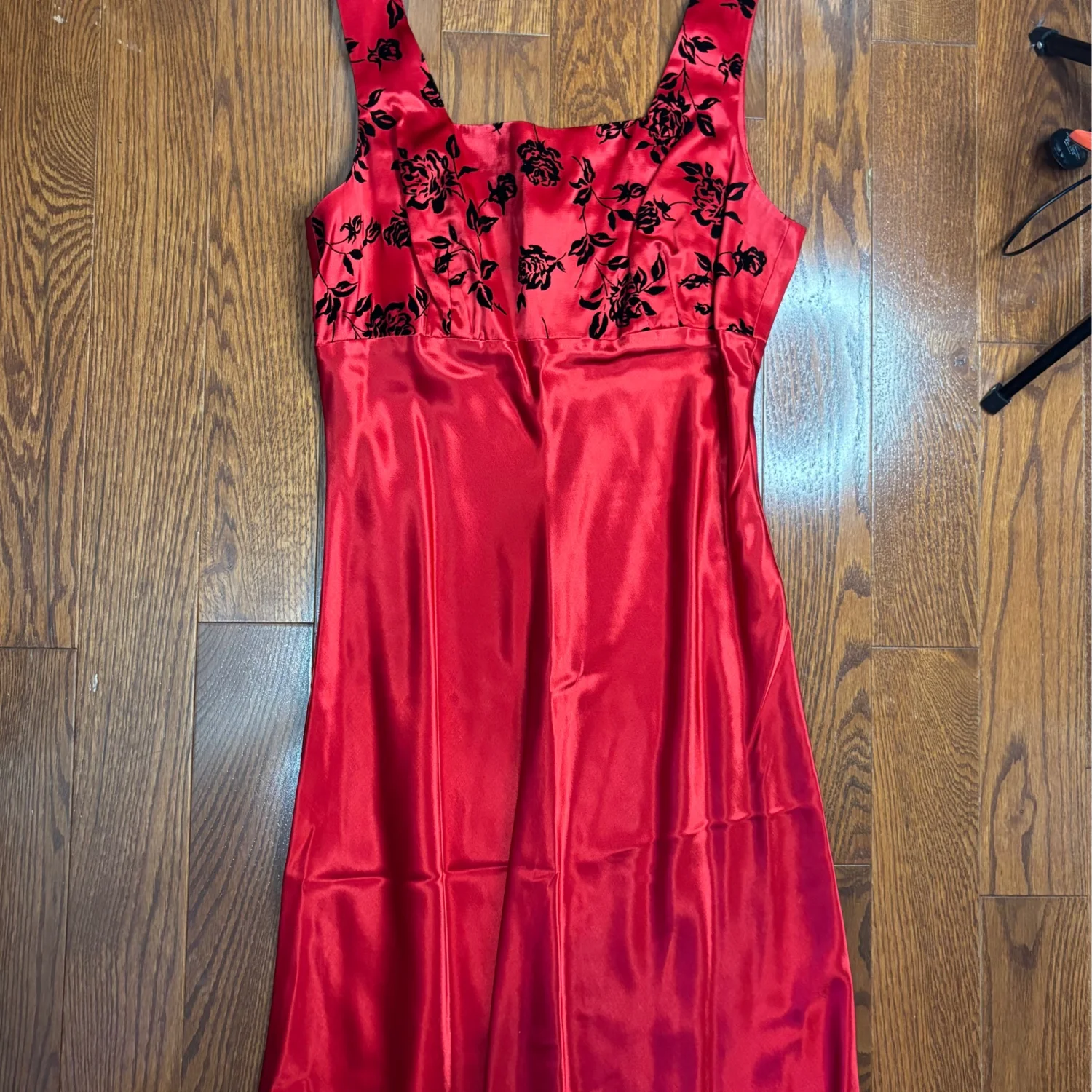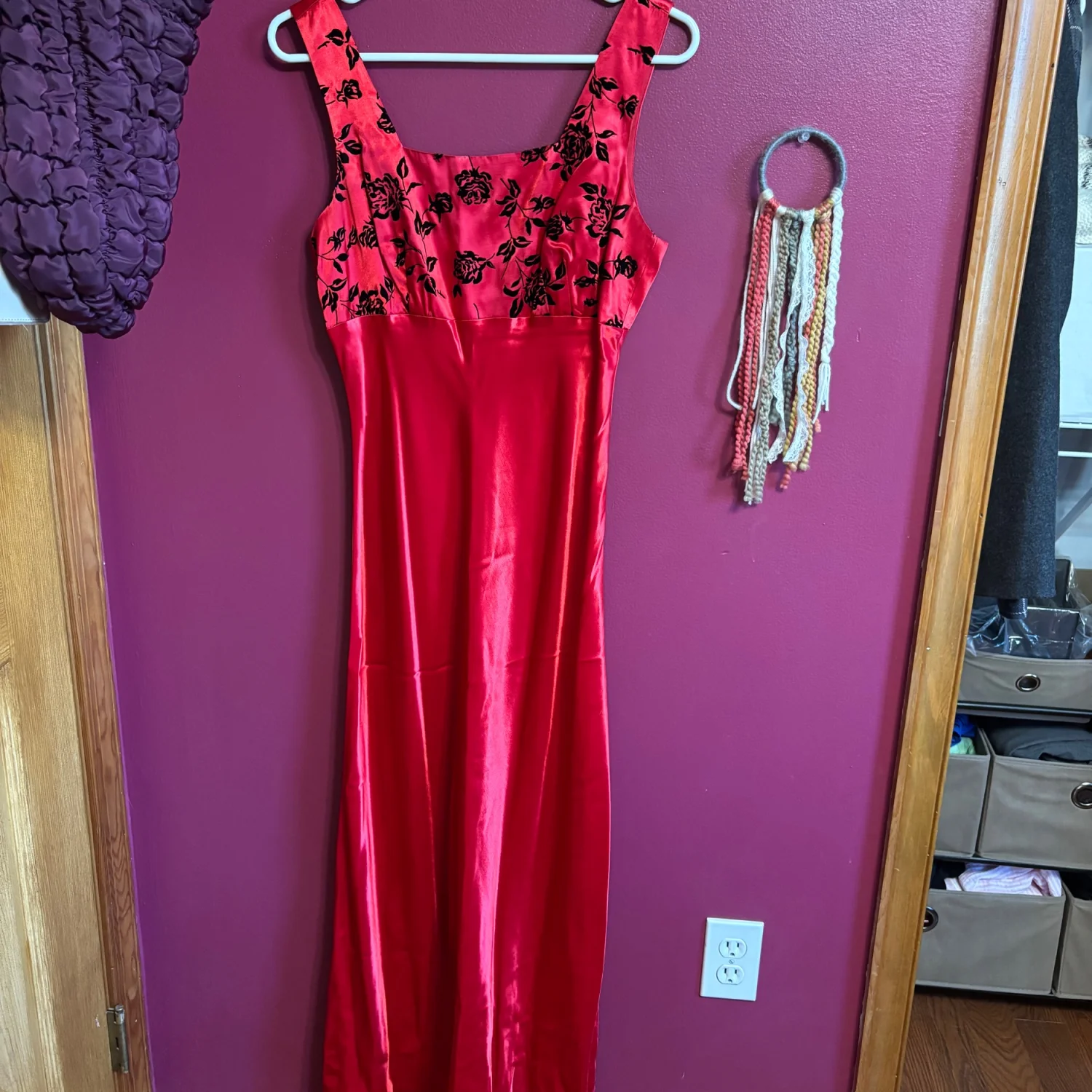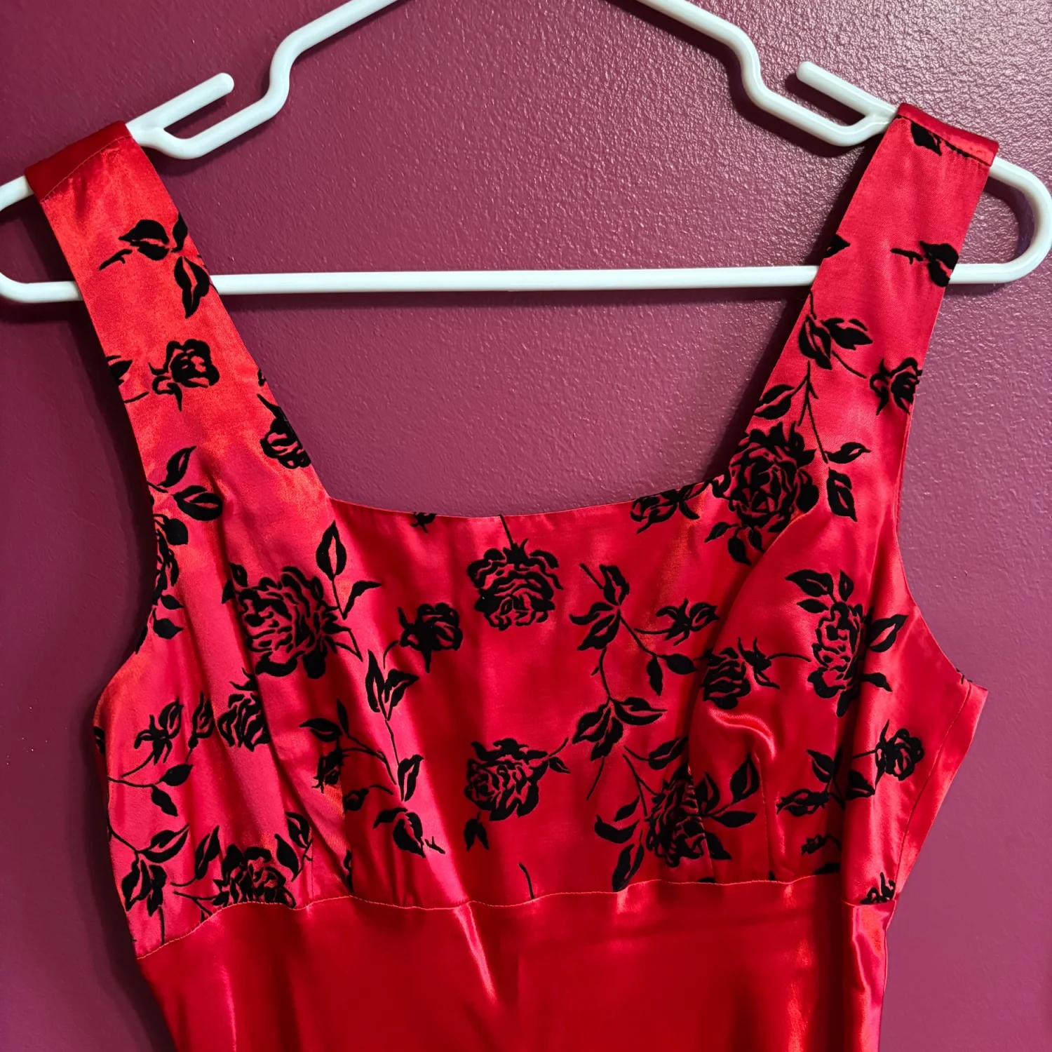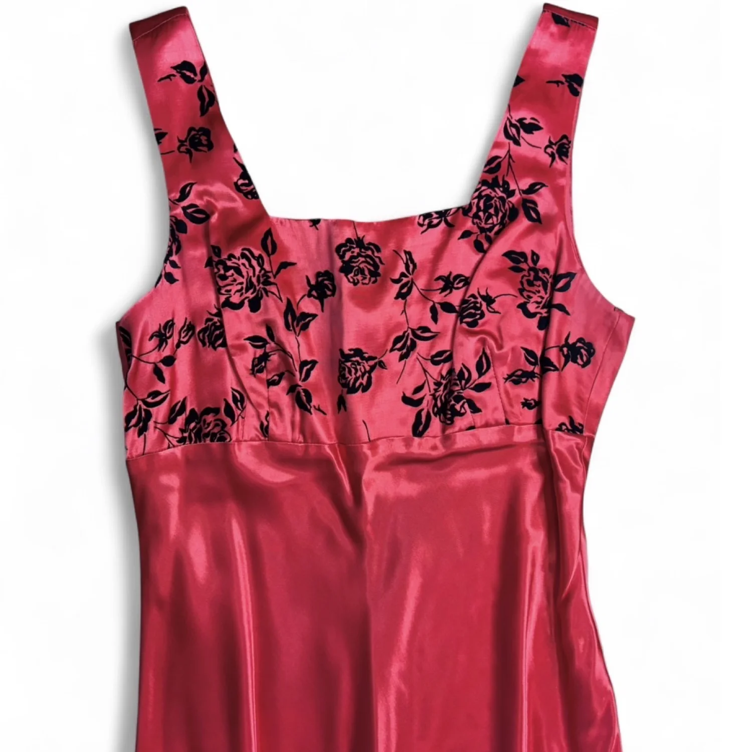 Be smart vintage Y2K red satin gown with black floral details sis 9/10