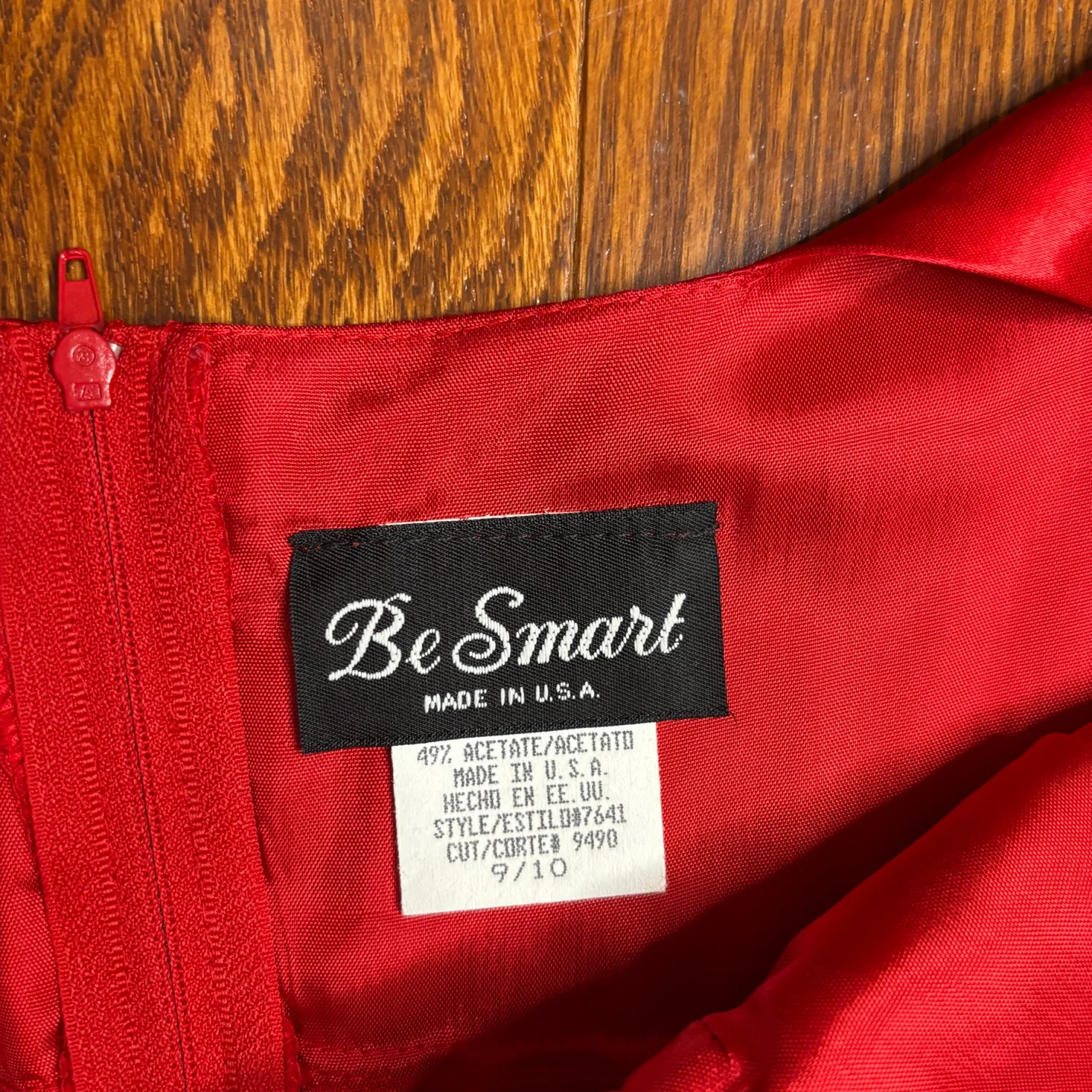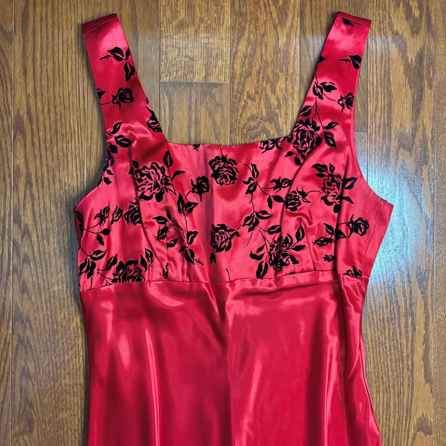 This red satin gown with black velvet rose detailing is a vintage piece from the brand Be Smart, a label well-known for its 1990s and early 2000s formalwear. Red silky satin body with velvet black rose patterns. 90s, Y2K era, dark romance, whimsigoth, vintage goth Size 9/10 pit to pit about 15 inches and pit down is about 48 inches long Great condition Rayon and acetate