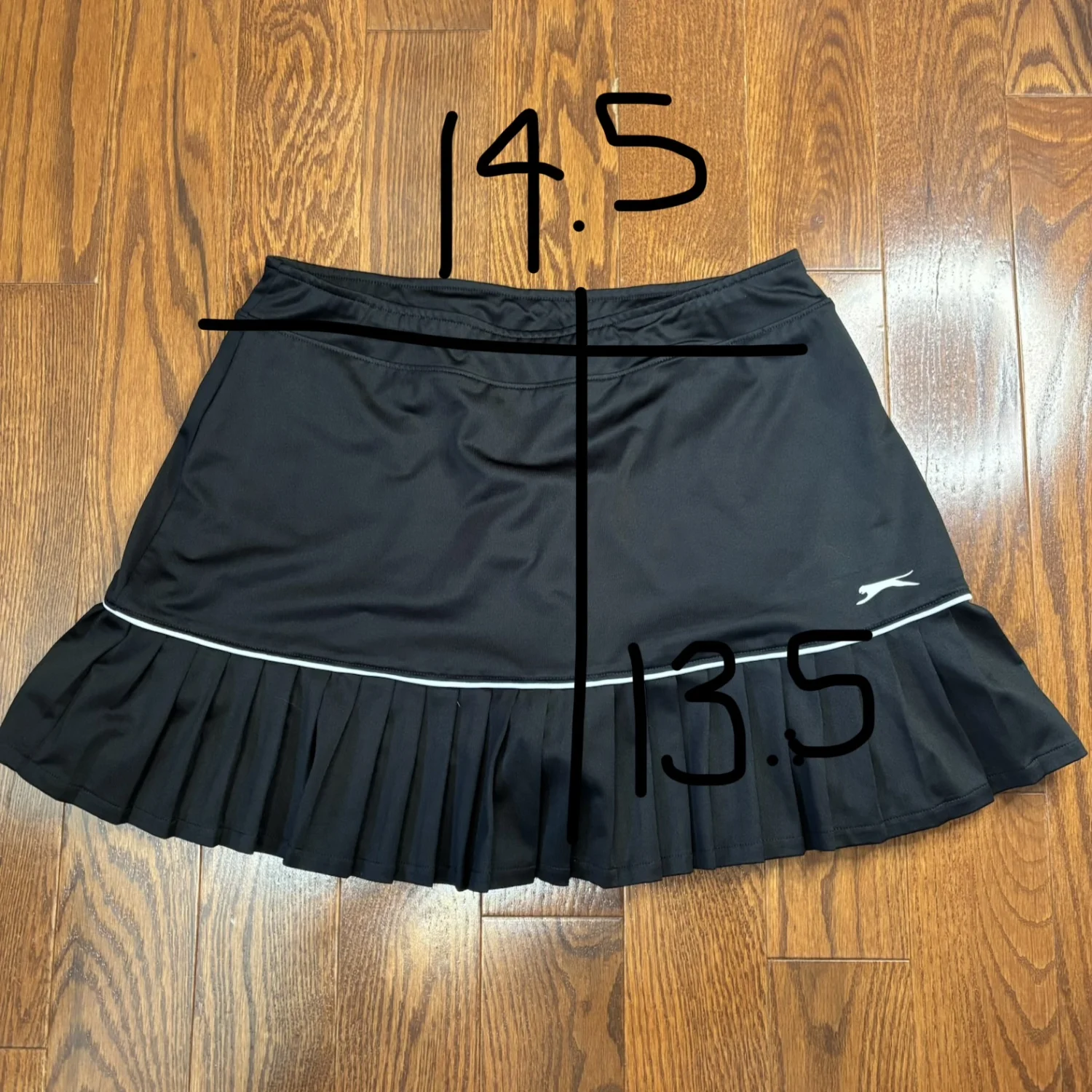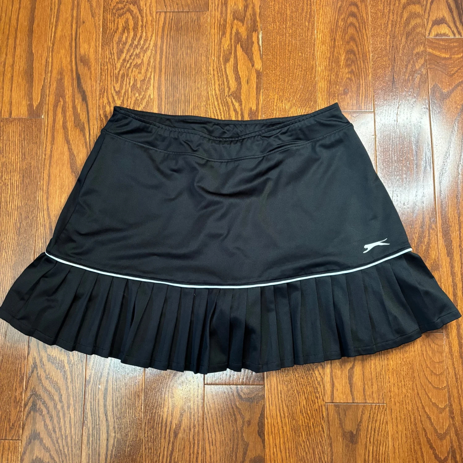 black Slazenger pleated golf skort with white stripe size small Shorts underneath Stretchy Waist about 14.5 inches Length about 13.5 inches Great condition Golf girly, athleisure, athletic, workout, golf core, tennis core, old money aesthetic