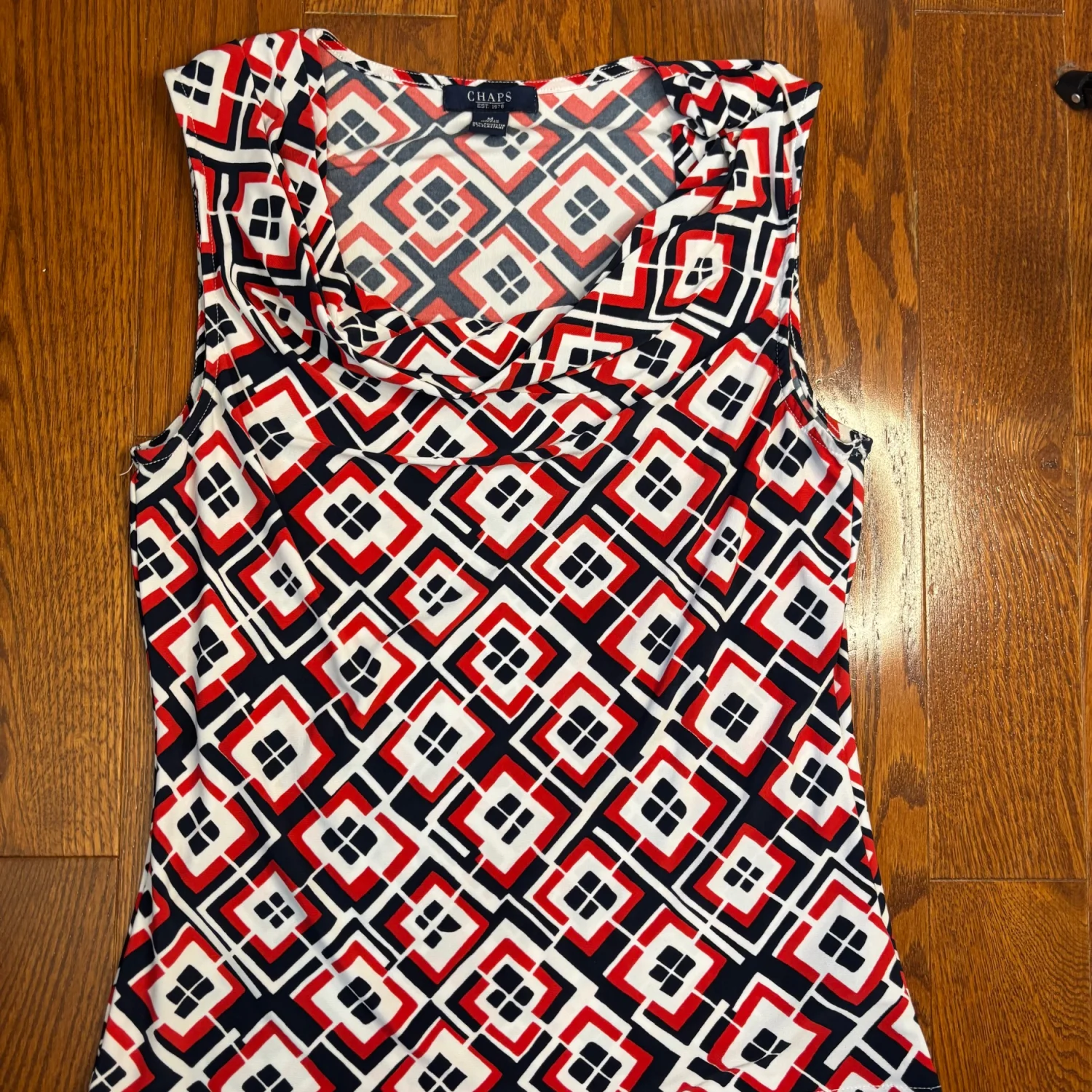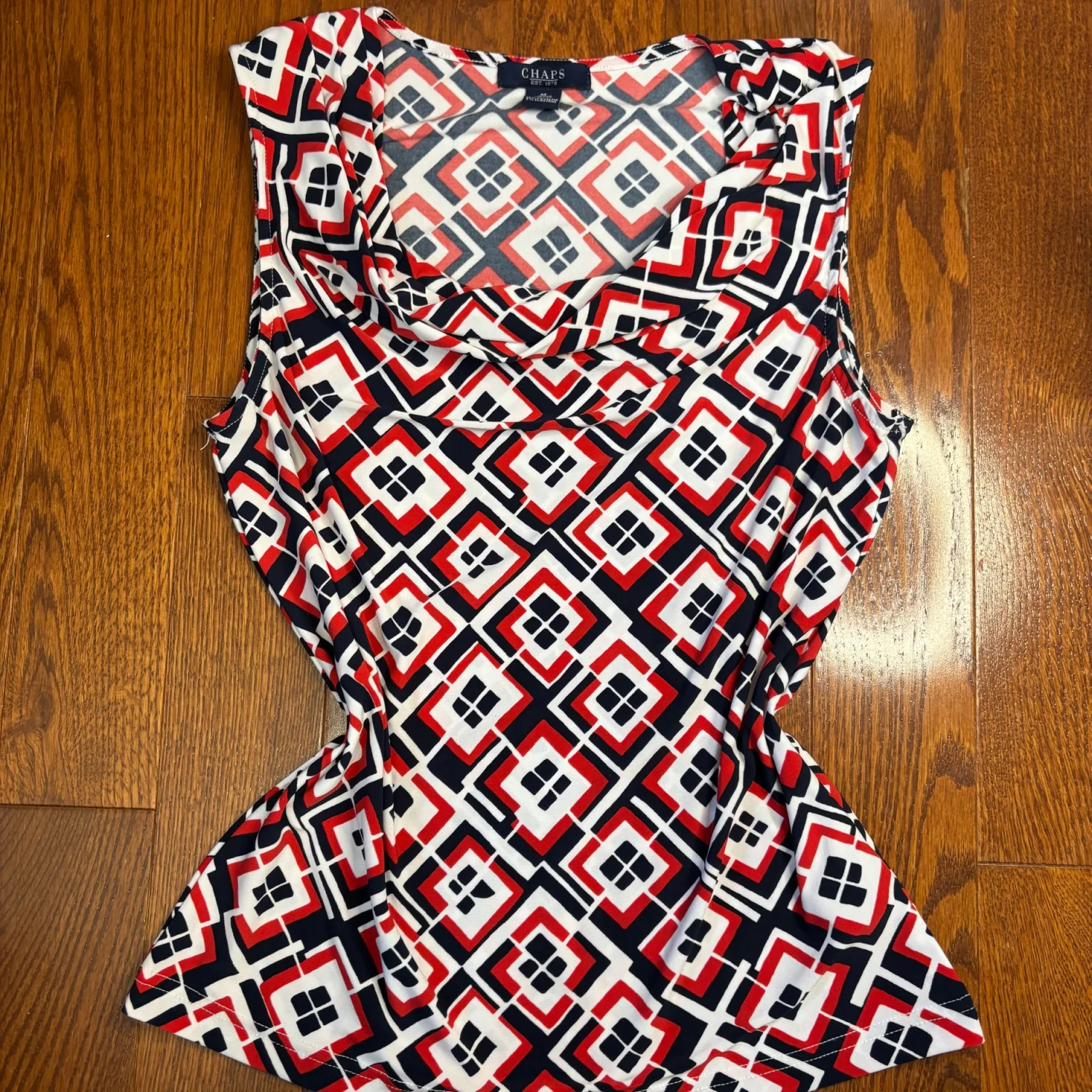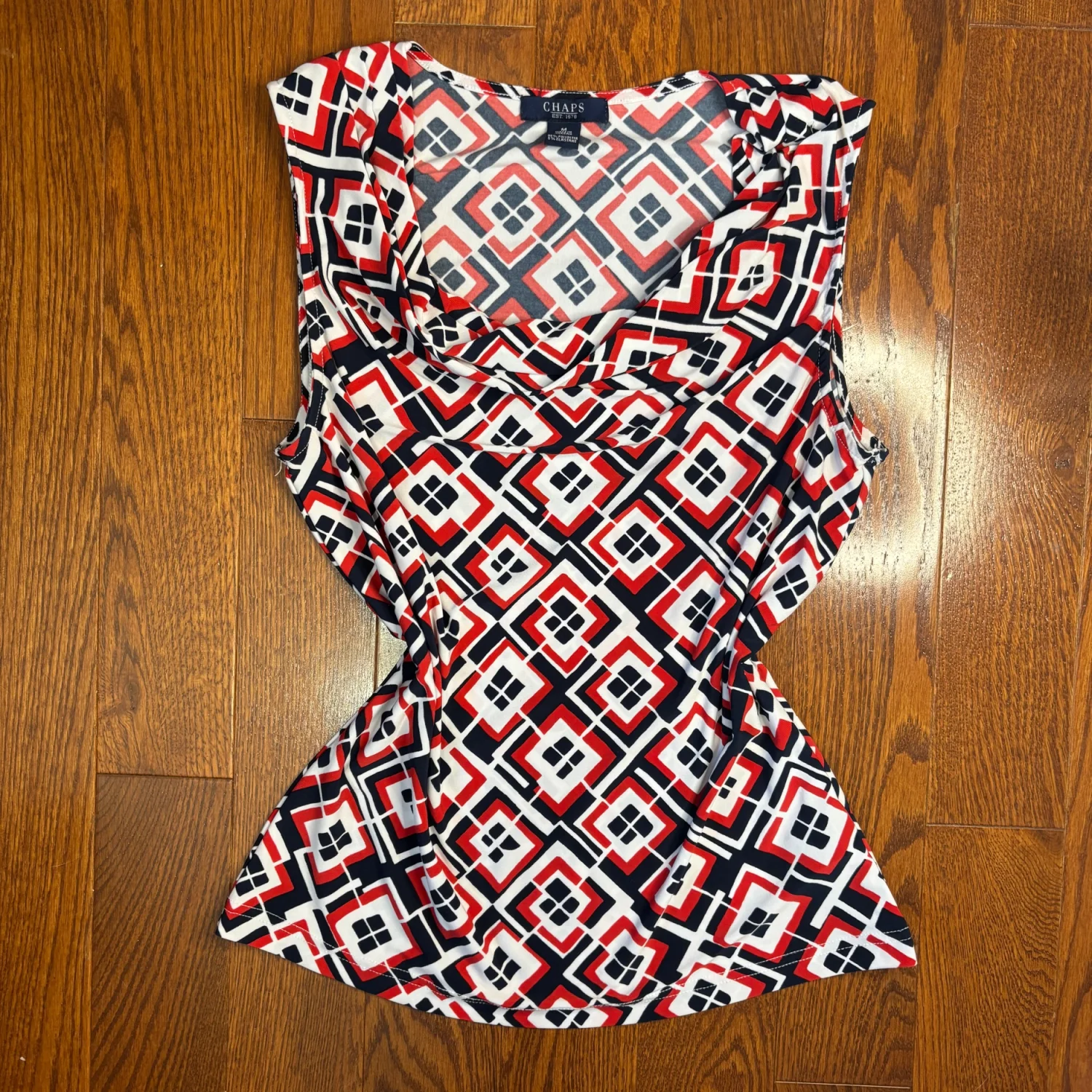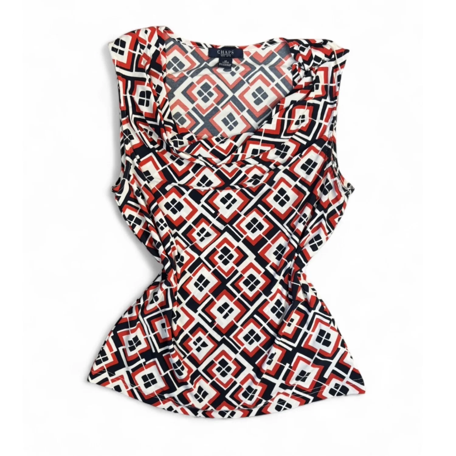 This image shows a Chaps draped-front scoop neck sleeveless pullover top featuring a red, white, and navy geometric print. Size medium Great condition Summer, business casual, stretchy, polyester and elastane