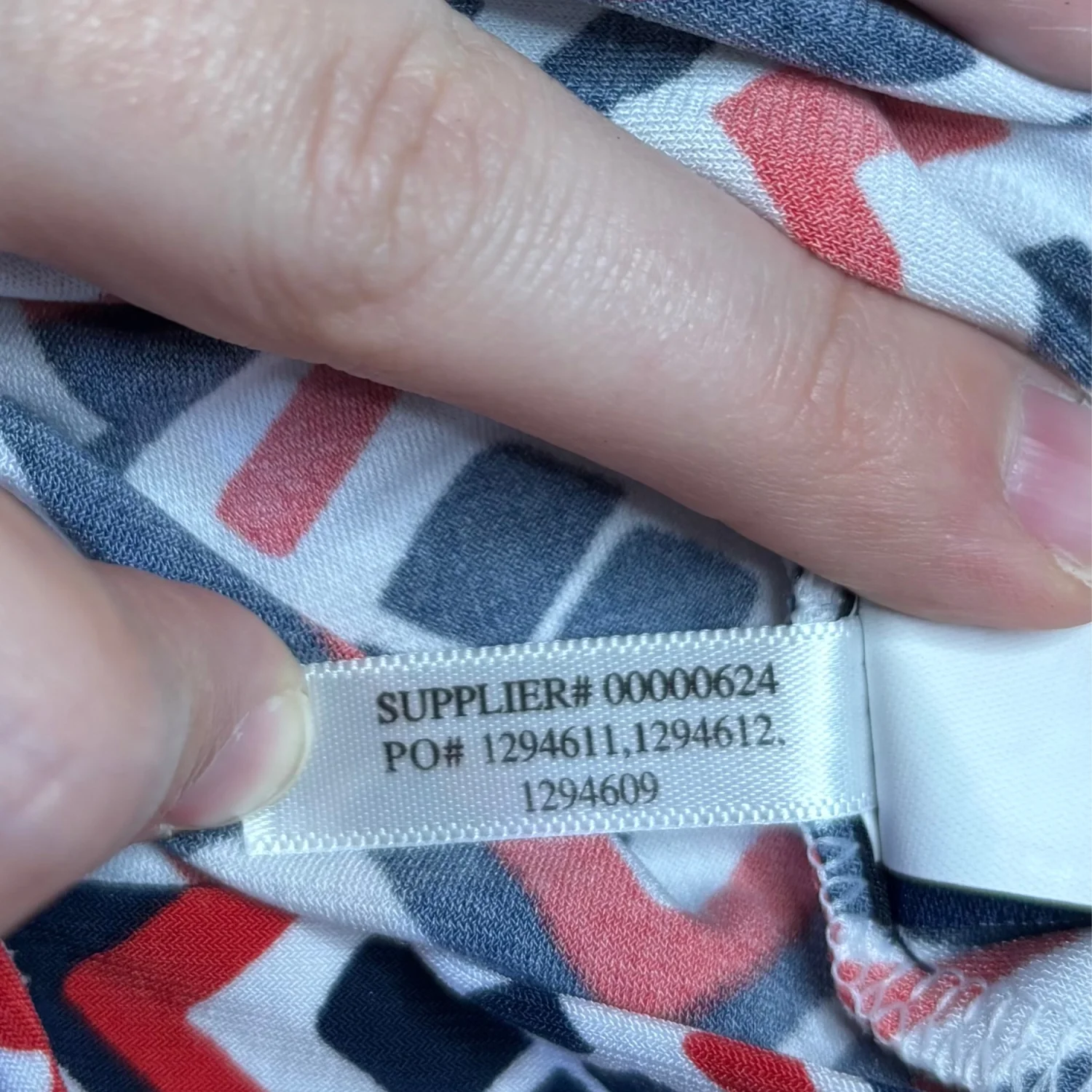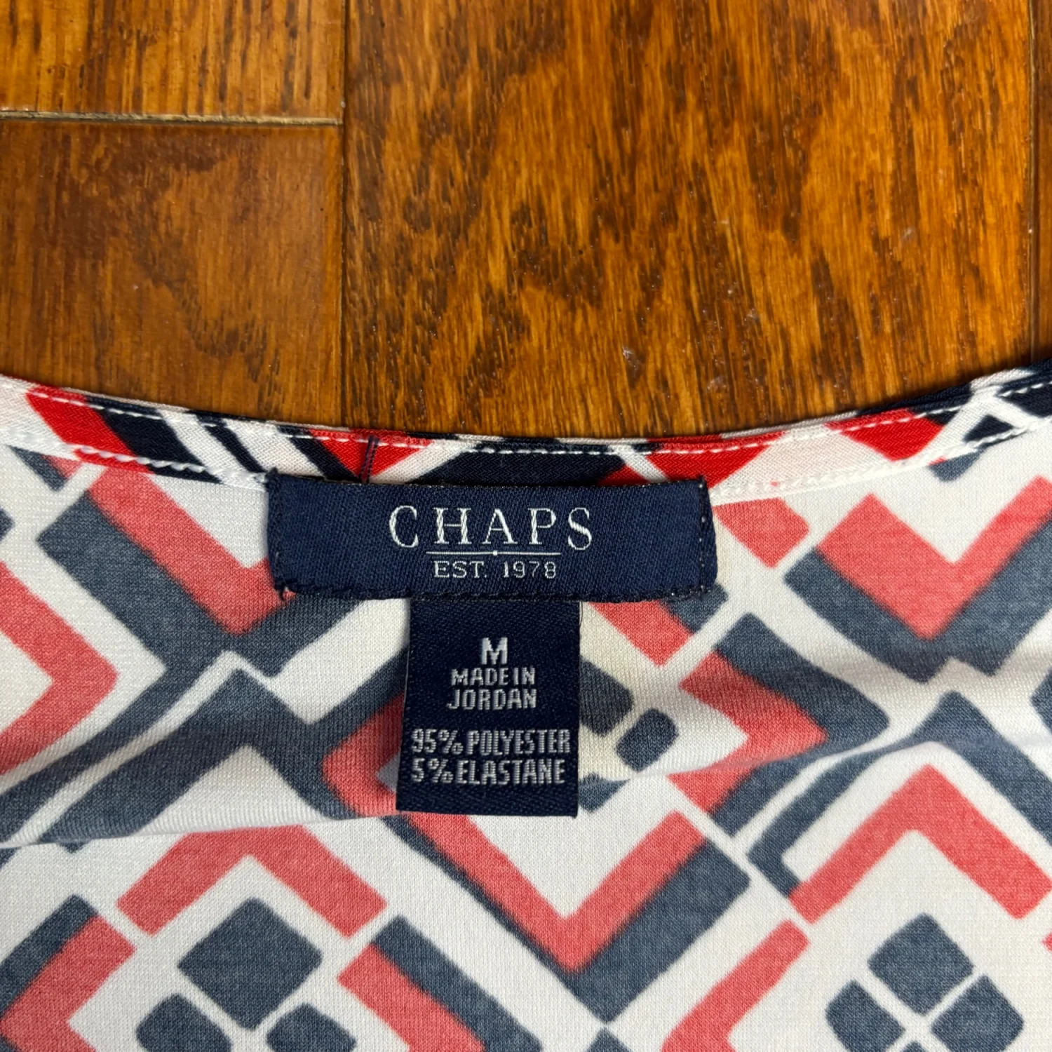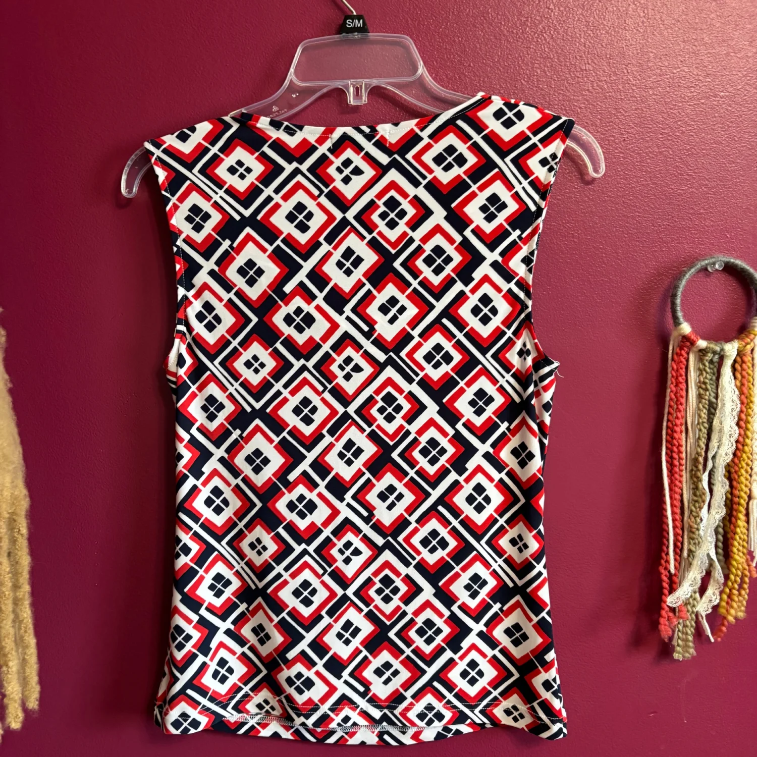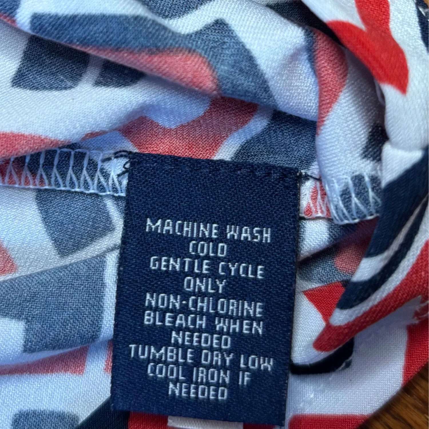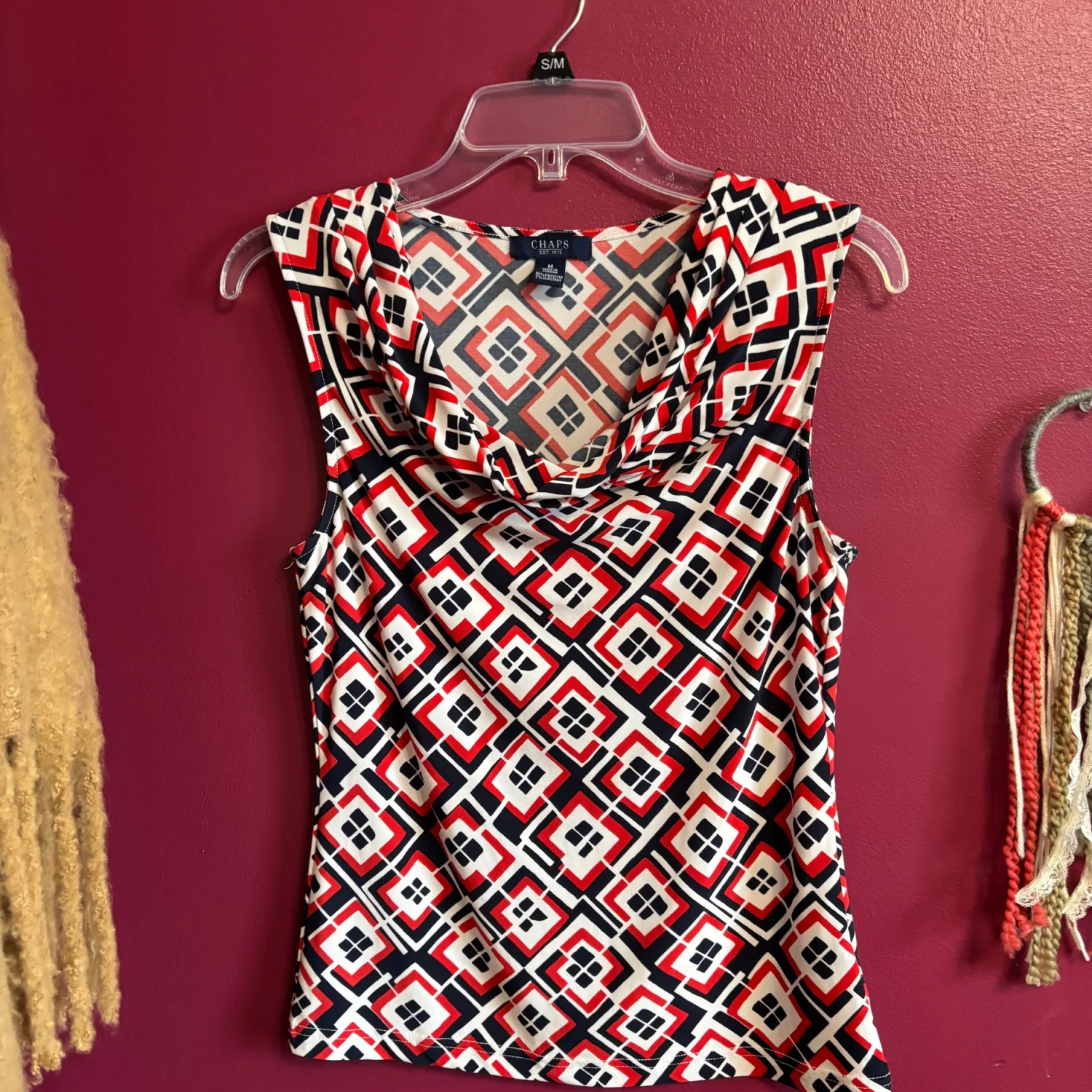 This image shows a Chaps draped-front scoop neck sleeveless pullover top featuring a red, white, and navy geometric print. Size medium Great condition Summer, business casual, stretchy, polyester and elastane