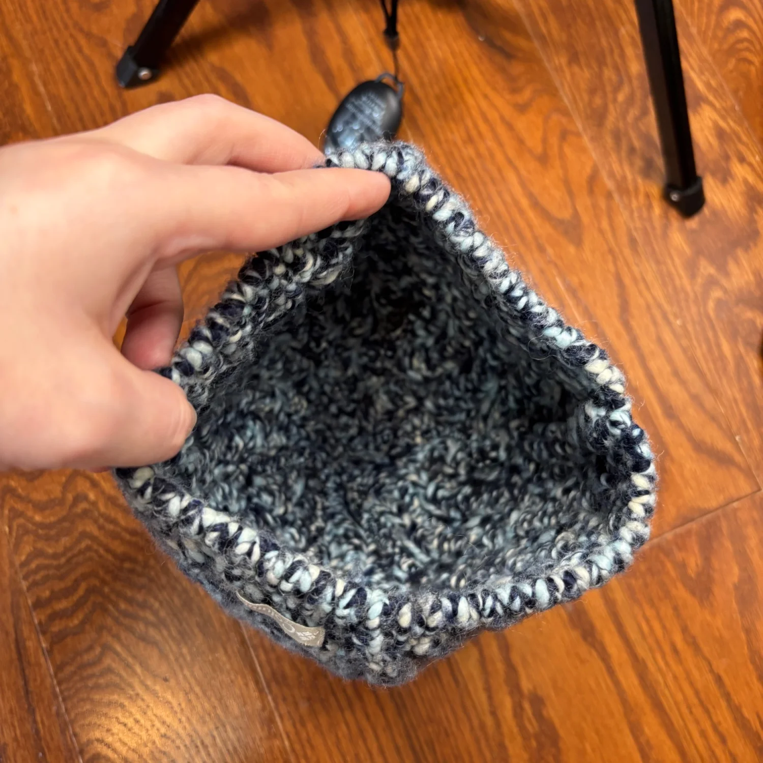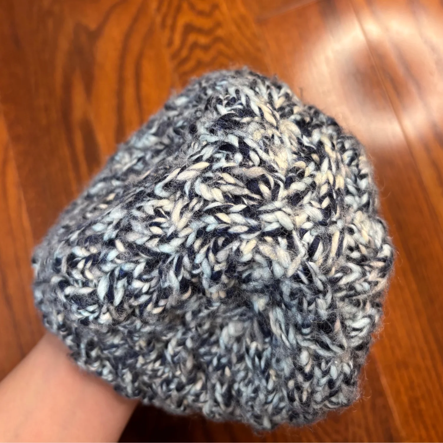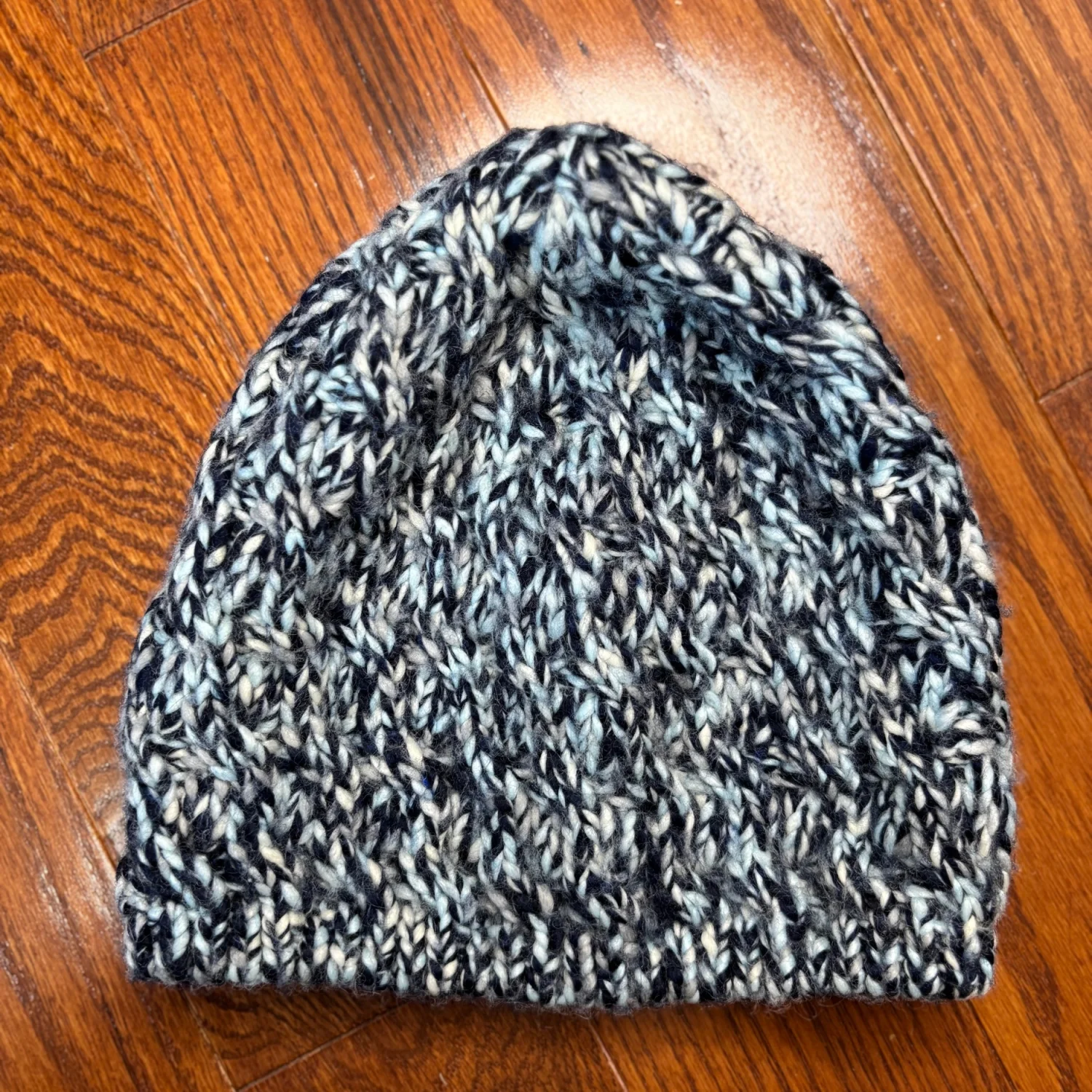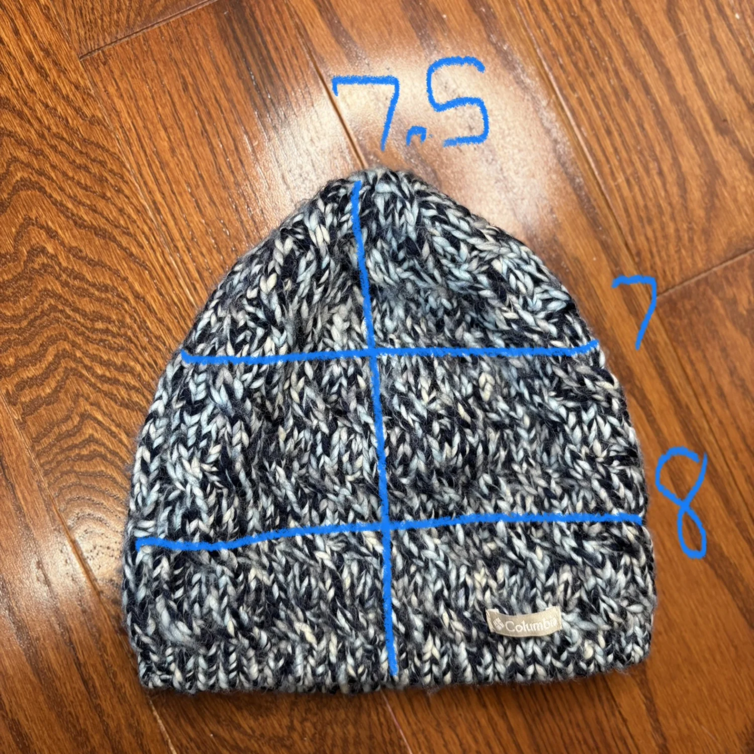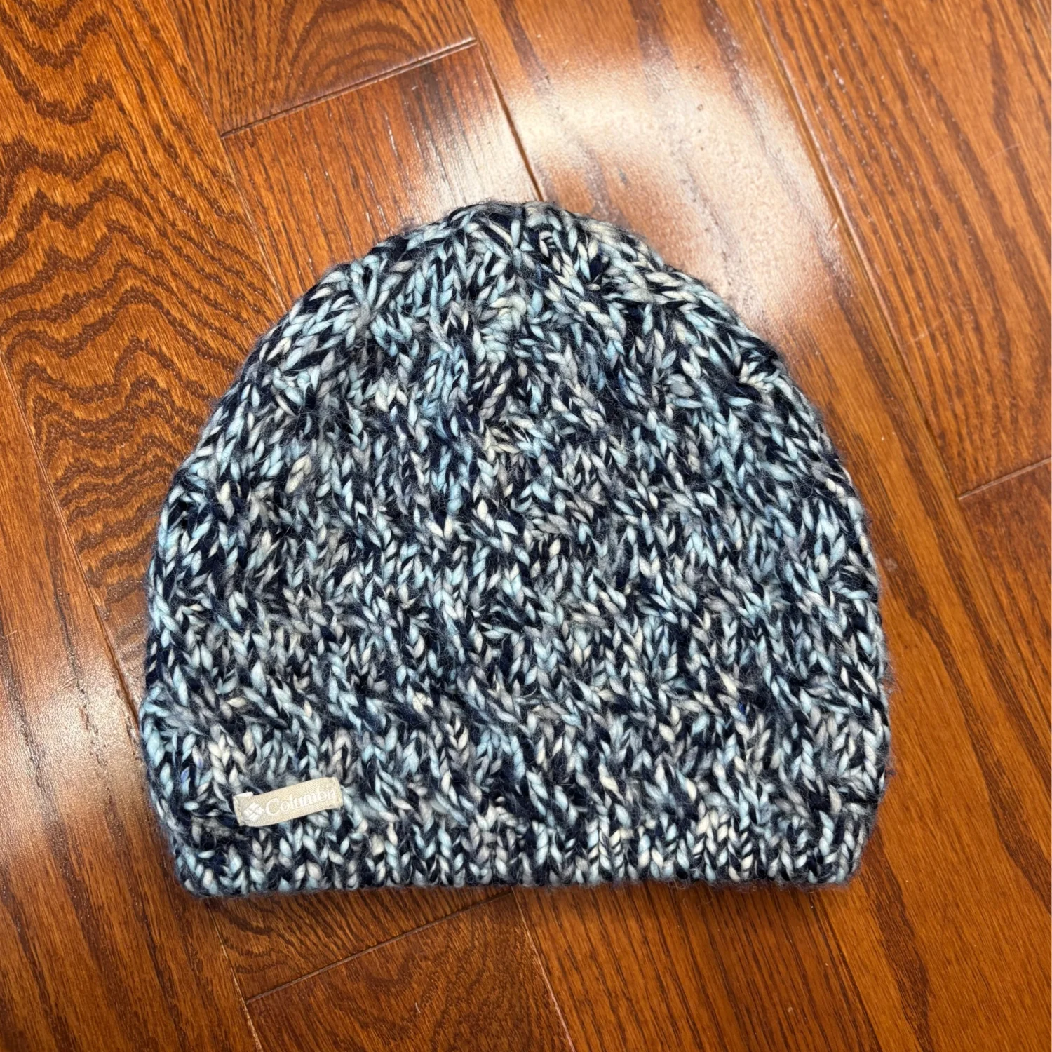 Columbia Women’s knit beanie featuring a multi-tonal, "marled" or "flecked" pattern in shades of blue, white, and black. A small, rectangular Columbia logo tag in a light cream is sewn onto the lower left side of the brim, providing a subtle contrast to the dark knit. It has a standard beanie silhouette with a rounded crown. The bottom edge is finished with a rib-knit border In great used condition Across about 7-8 inches Top to bottom about 7.5 inches