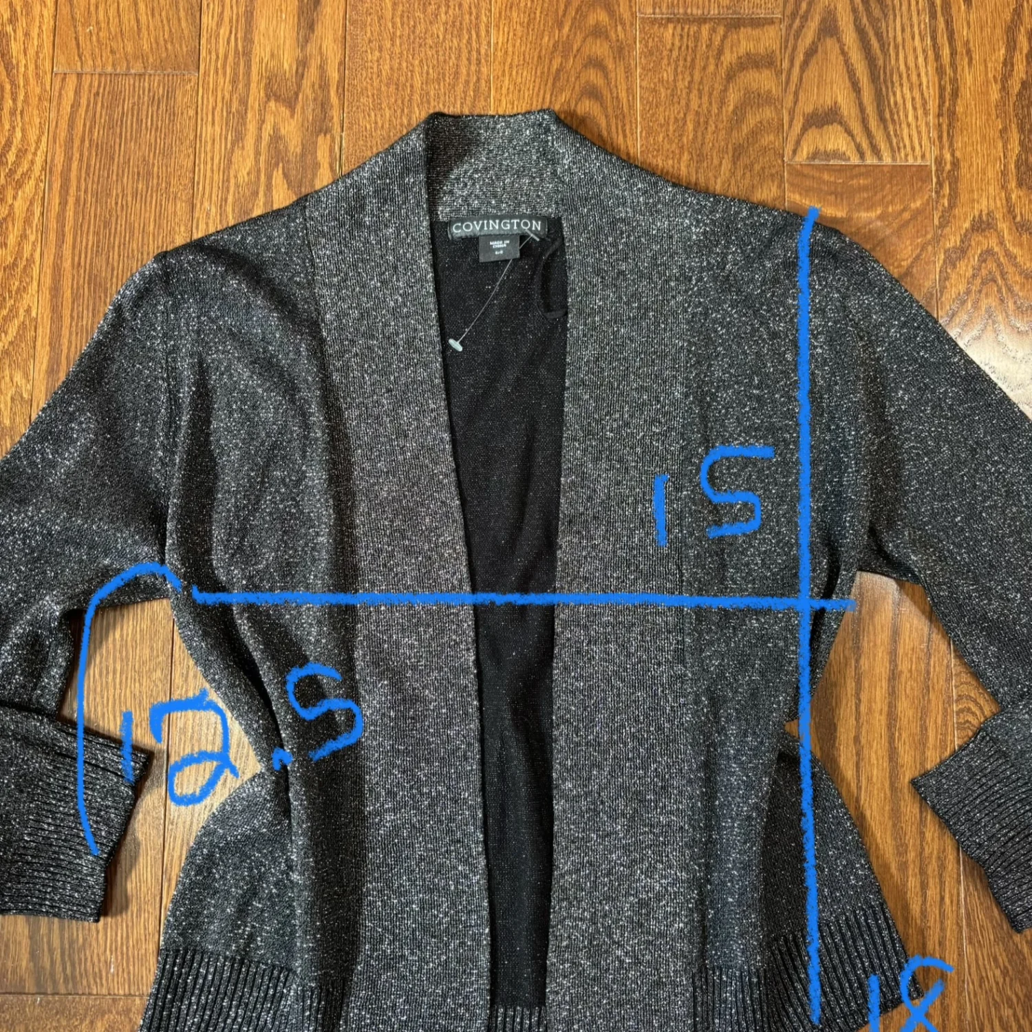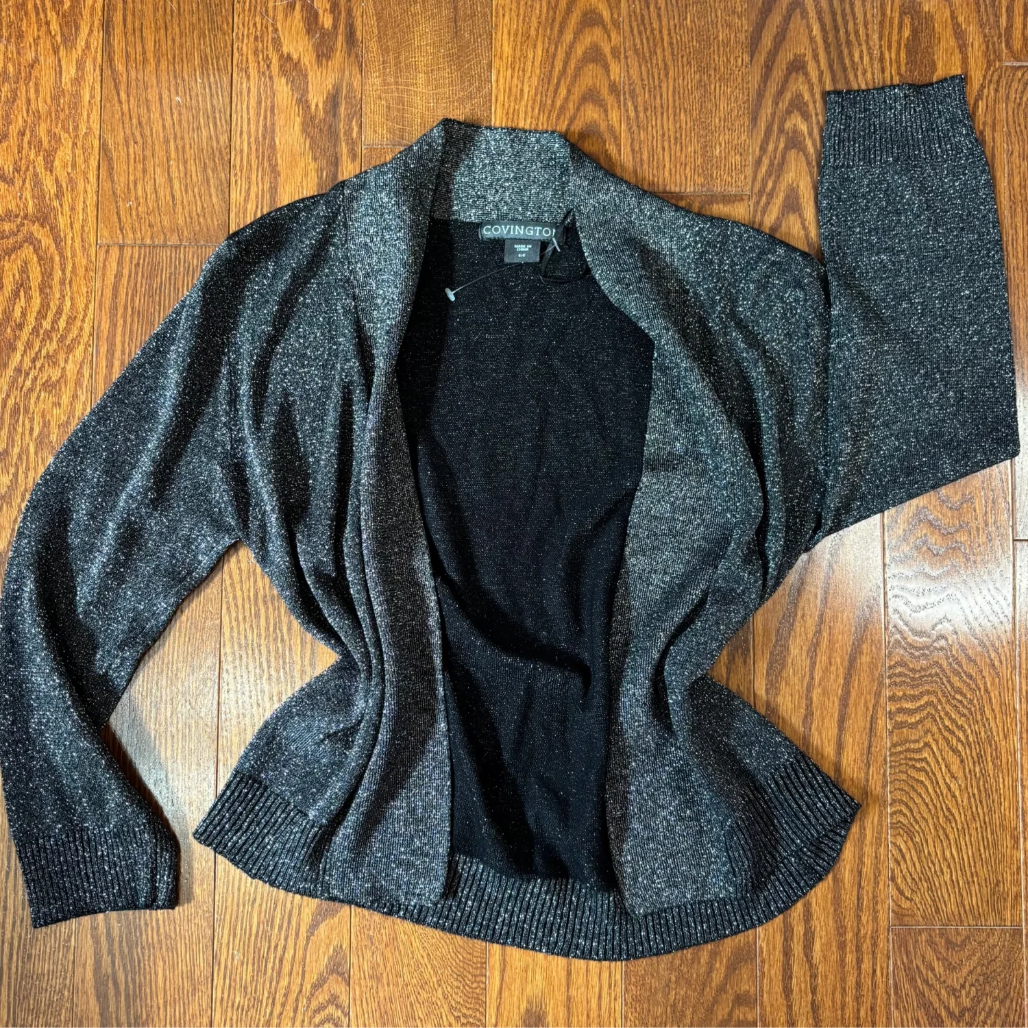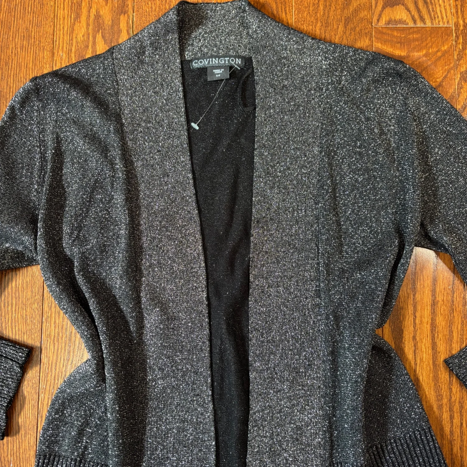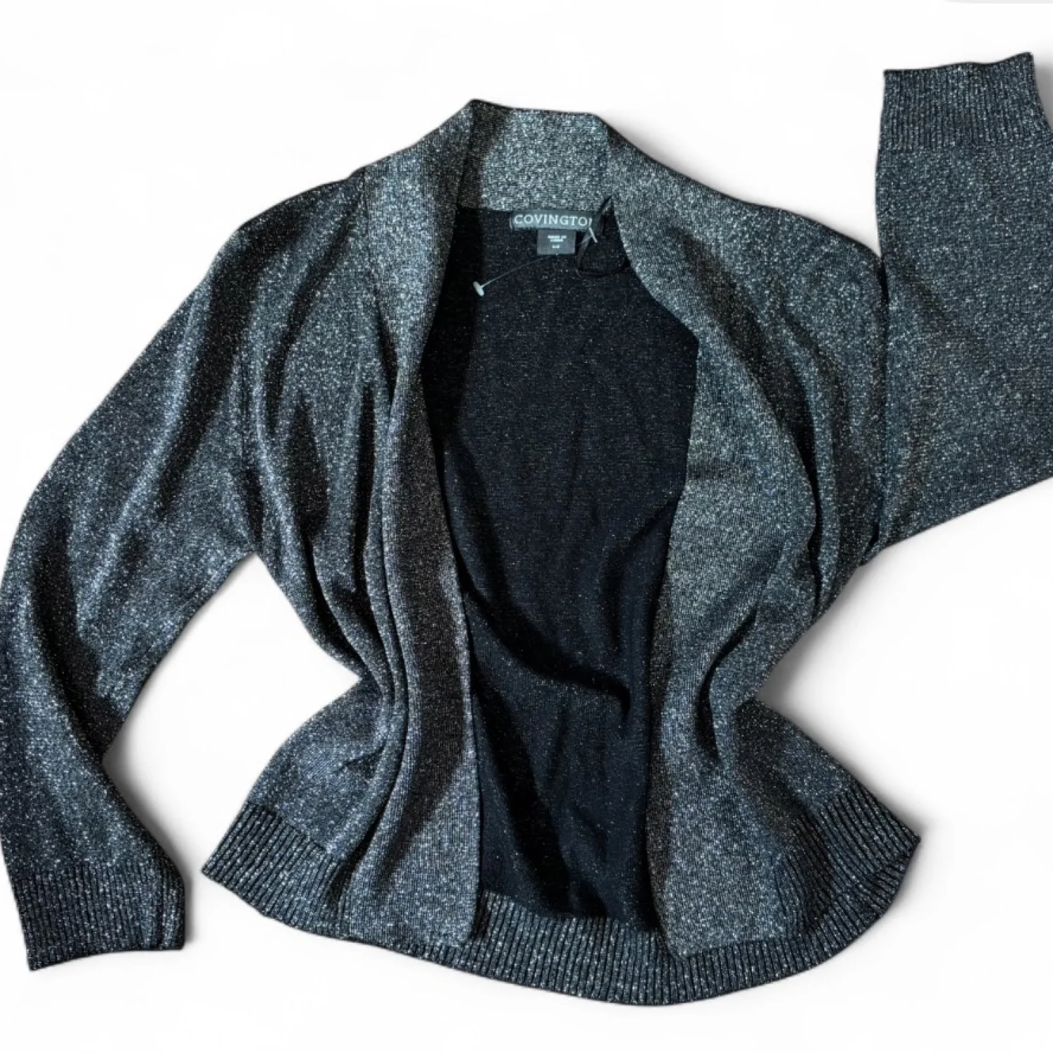 Covington Women’s open-front cardigan is a versatile layering piece designed with a shimmering, glittery, metallic aesthetic, lightweight, comes with extra threads, and is a size small with quarter sleeves. Rayon, polyester, metallic materials. Pit to pit is 15 inches Arm about 12.5 inches Shoulder down is 18 inches In great condition Office siren, y2k revival, evening core, party glam,