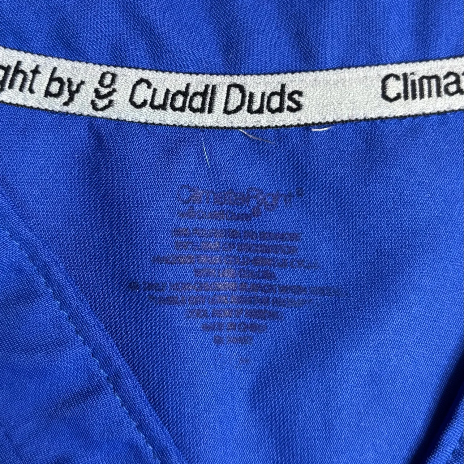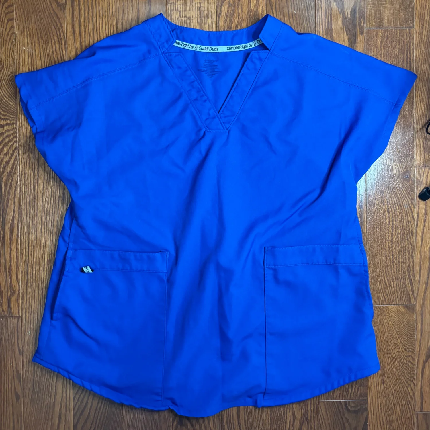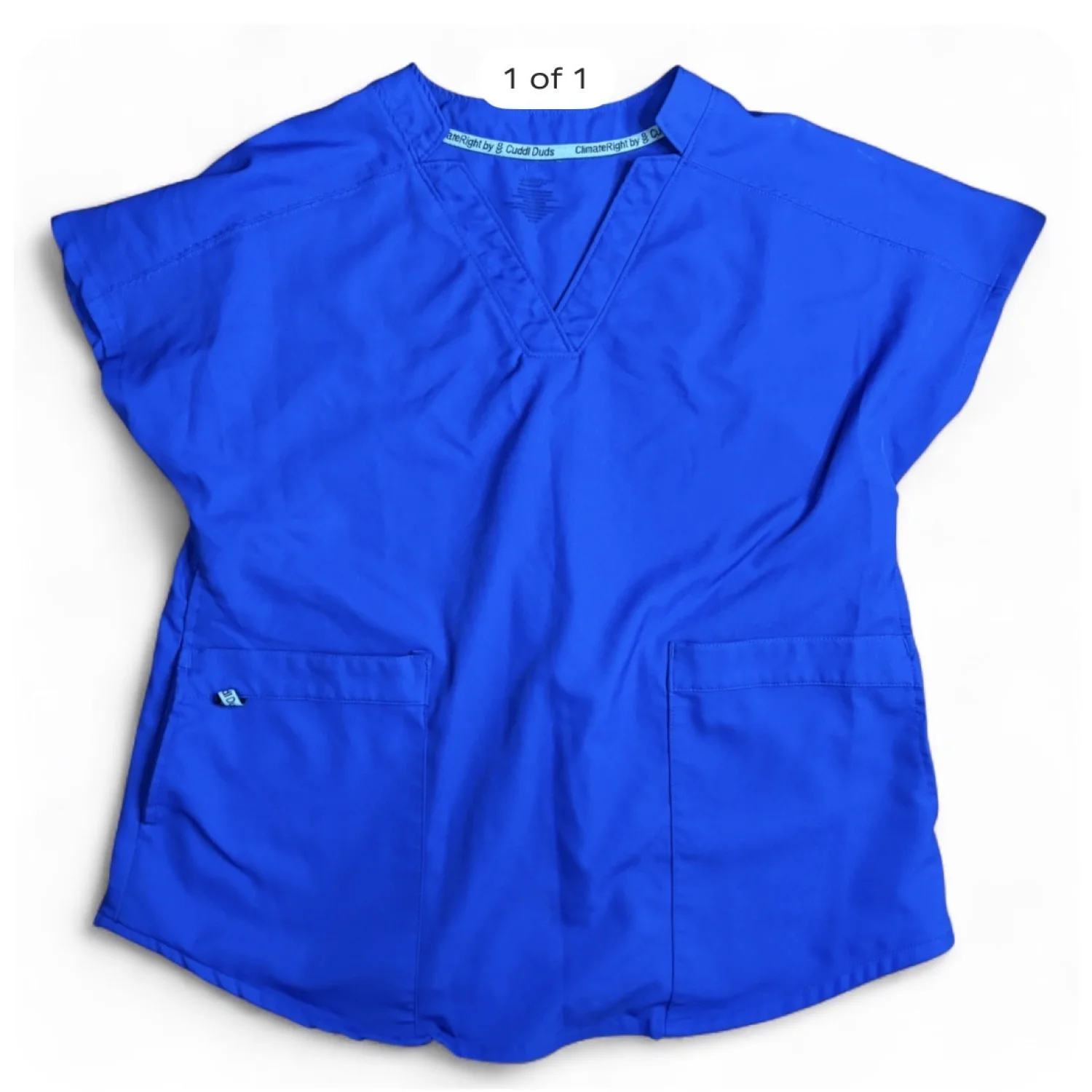 ClimateRight by Cuddl Duds women's short-sleeved scrub top in royal/ metro blue. Size small but fits very oversized Pit to pit about 20 inches Pit down about 12 inches V neck, double pockets Fits a medium probably best Other wise comfortable and in great condition