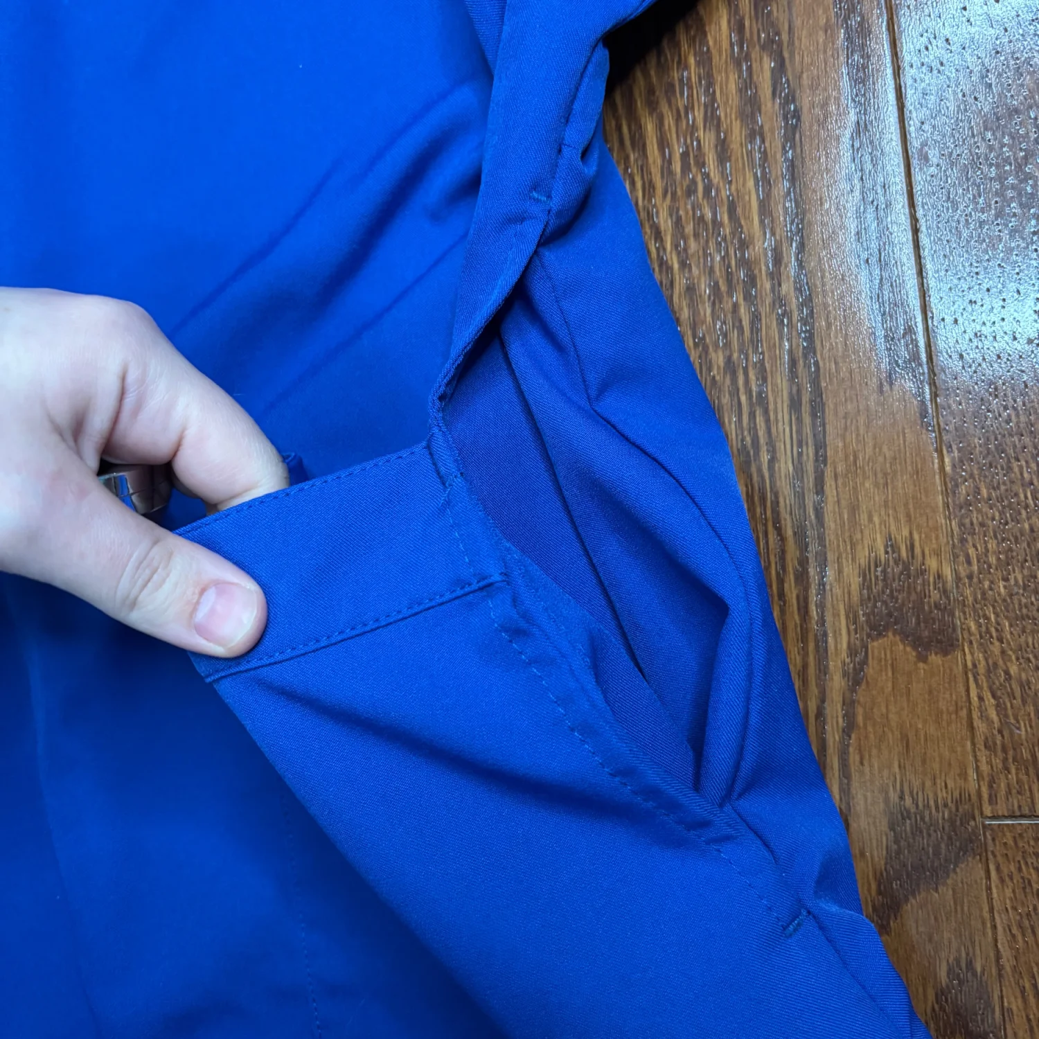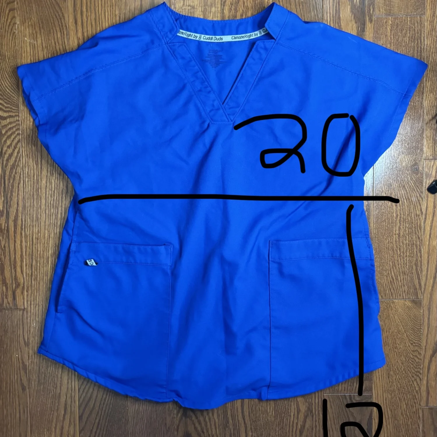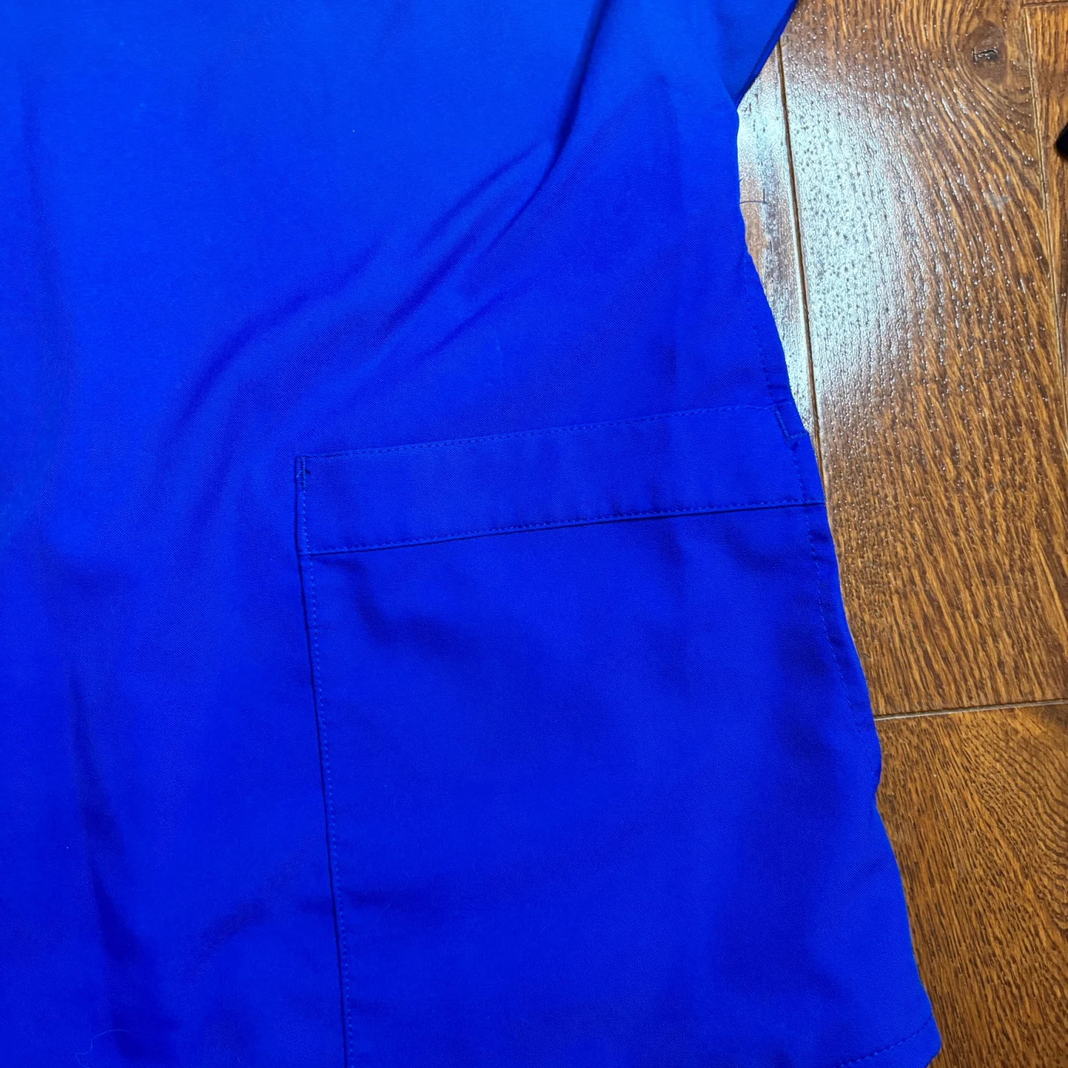 ClimateRight by Cuddl Duds women's short-sleeved scrub top in royal/ metro blue. Size small but fits very oversized Pit to pit about 20 inches Pit down about 12 inches V neck, double pockets Fits a medium probably best Other wise comfortable and in great condition