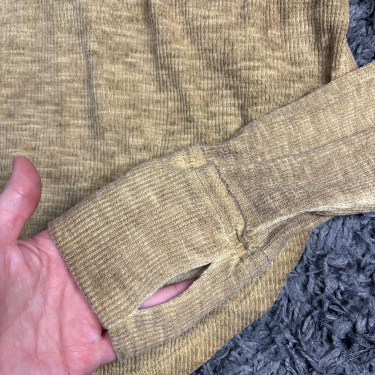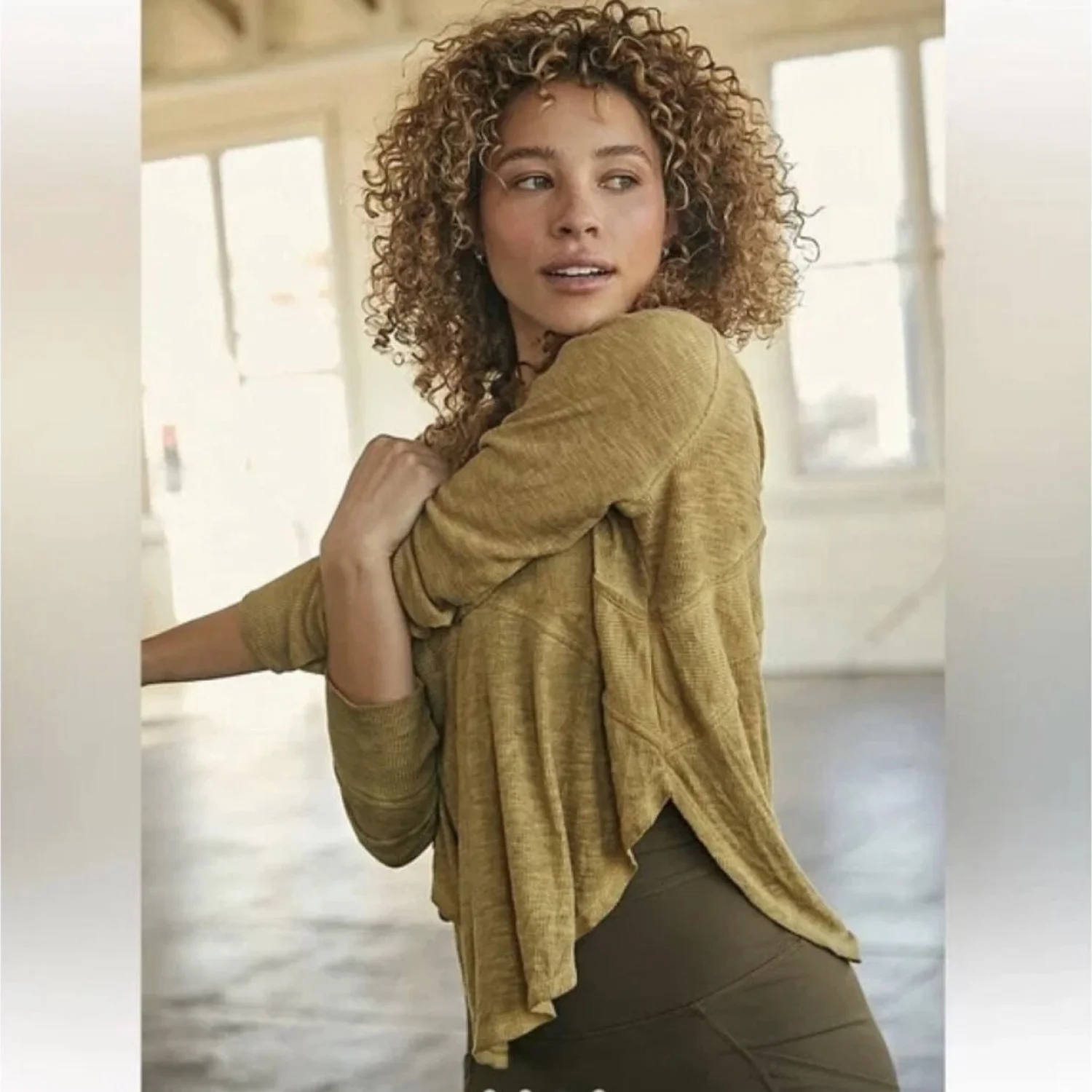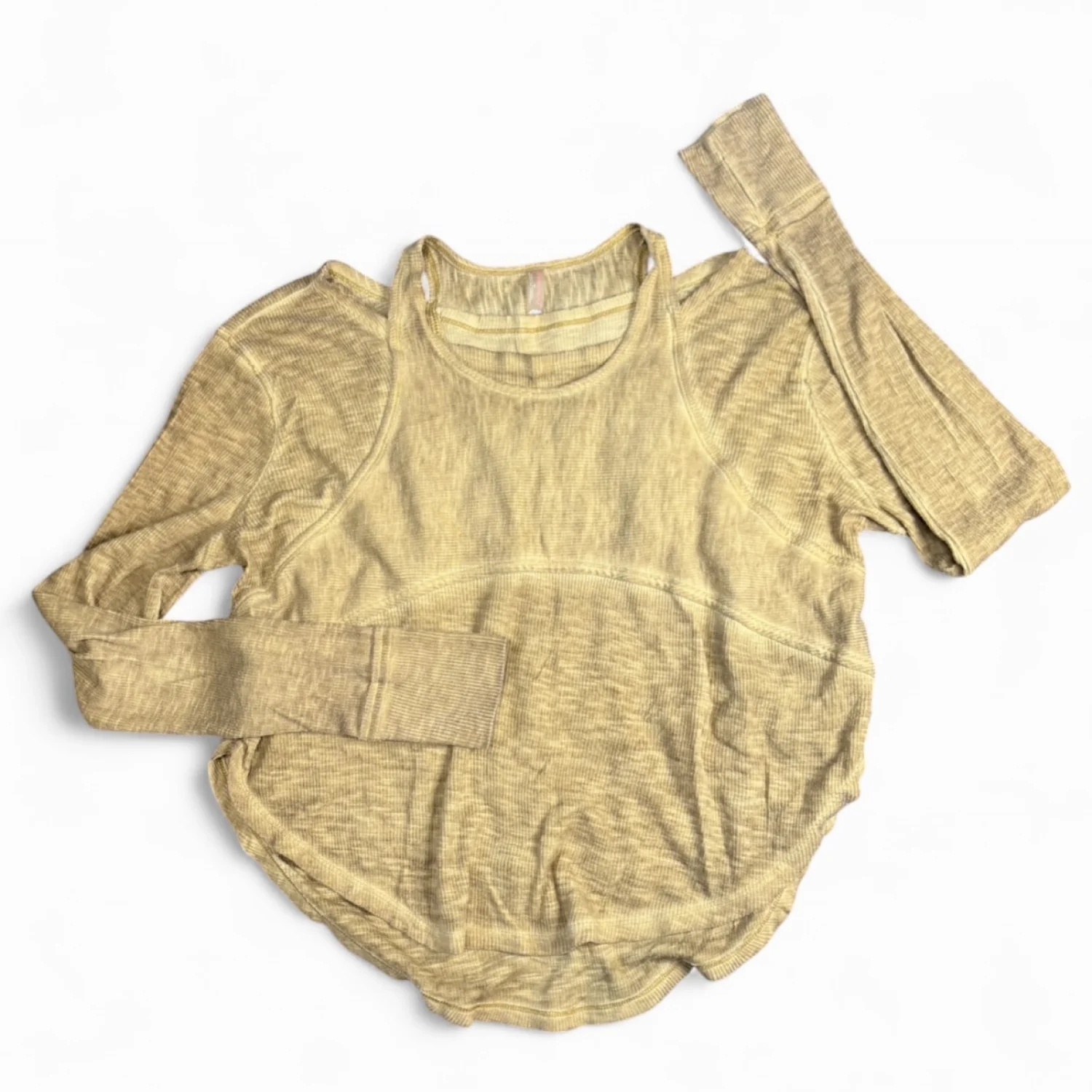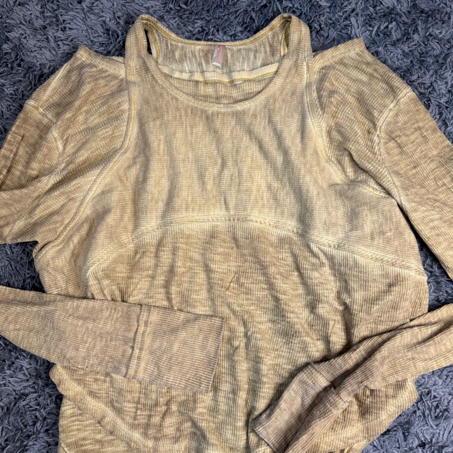 This long-sleeved shirt is the Zenith Tee (or Zenith Cut Out Tee) from the FP Movement line by Free People Size XS A lightweight, drapey, and slightly sheer long-sleeved top. It features a unique double neckline and a faux-tank top layered under the main ribbed fabric, creating a "cut-out" effect. Includes thumbhole cuffs and a ribbed fabrication made from a blend of polyester and viscose. Alchemy Gold or a marled yellow color.