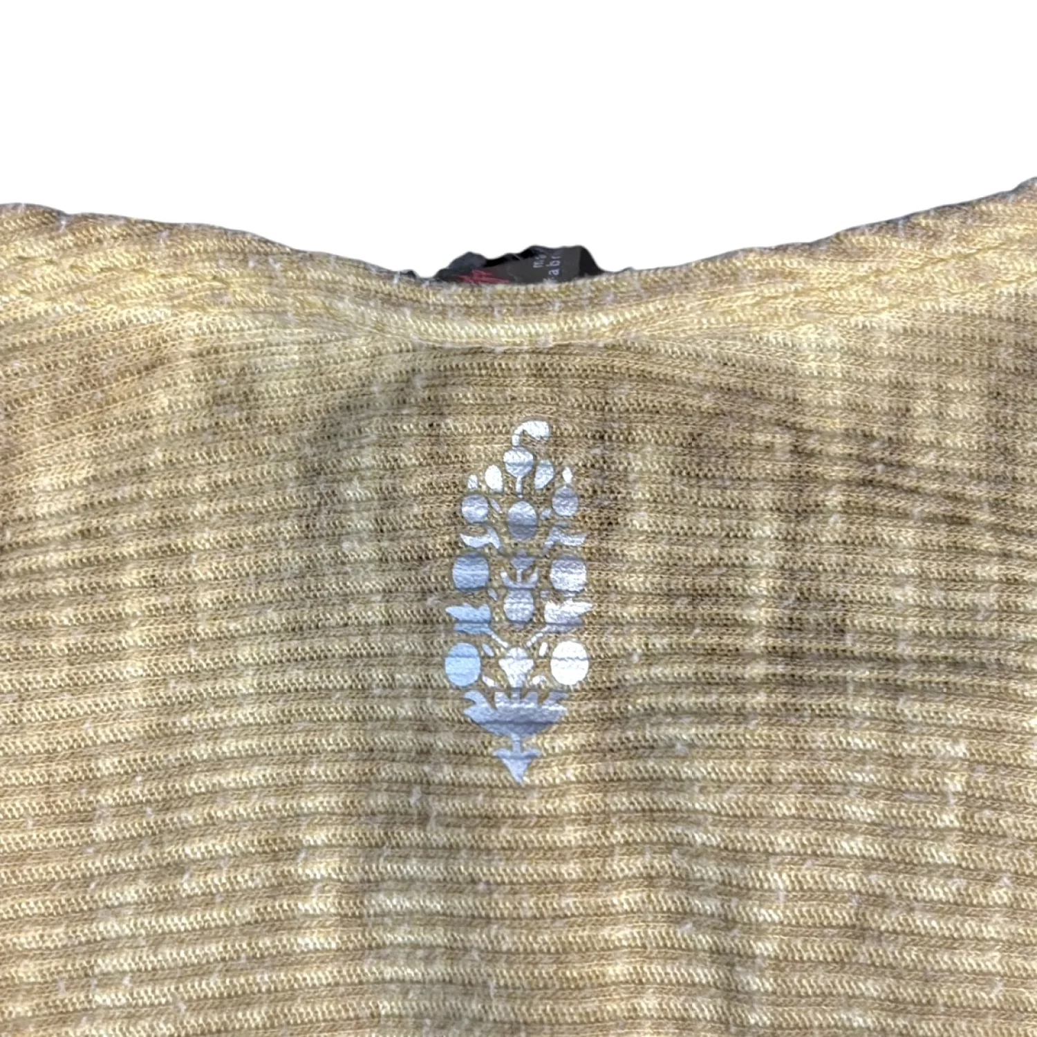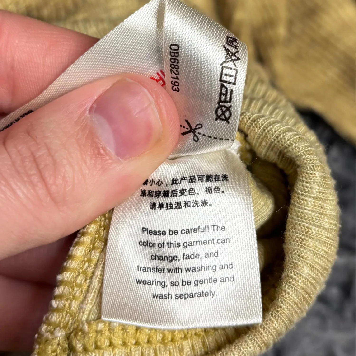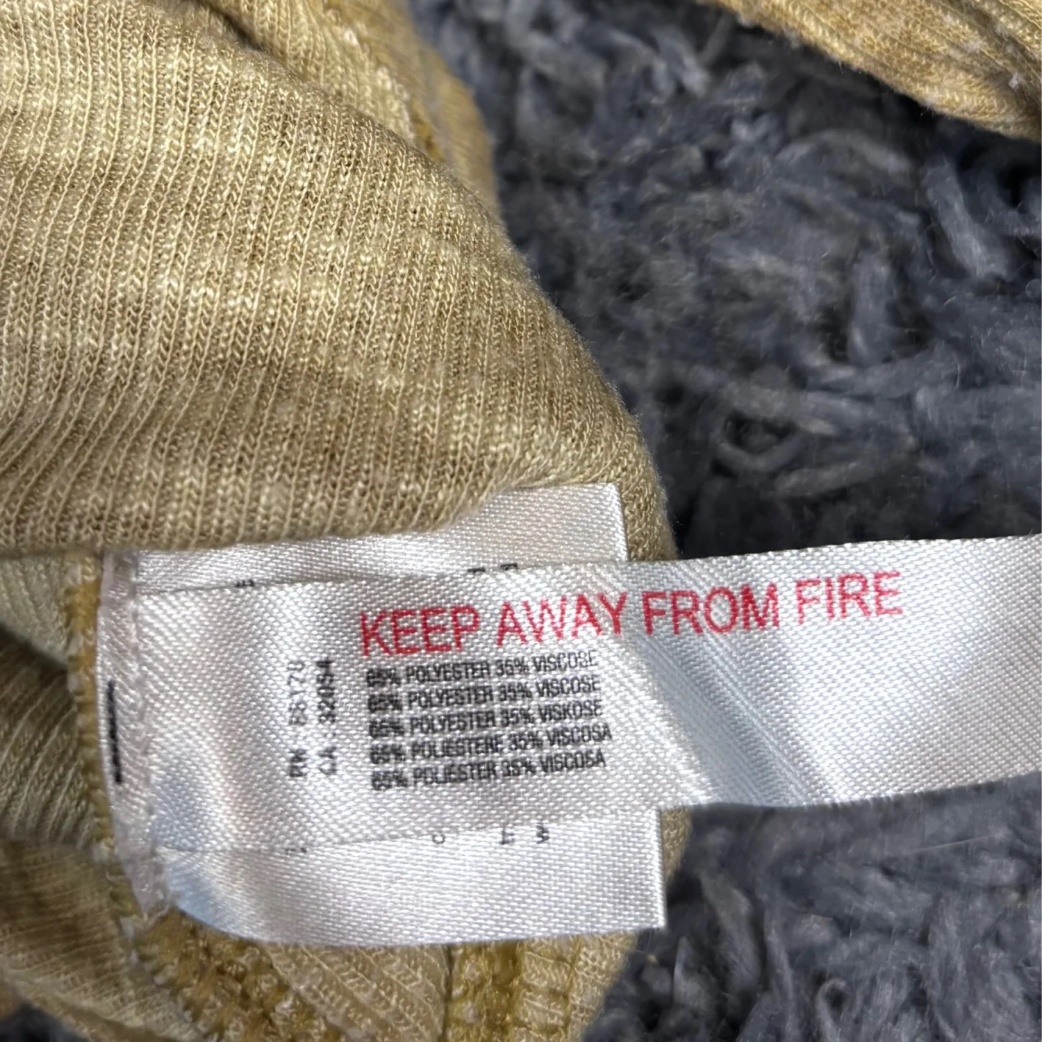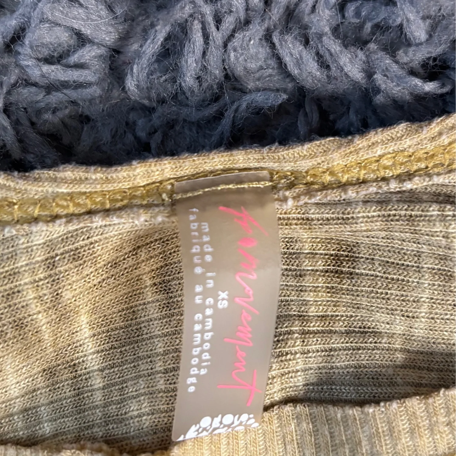 This long-sleeved shirt is the Zenith Tee (or Zenith Cut Out Tee) from the FP Movement line by Free People Size XS A lightweight, drapey, and slightly sheer long-sleeved top. It features a unique double neckline and a faux-tank top layered under the main ribbed fabric, creating a "cut-out" effect. Includes thumbhole cuffs and a ribbed fabrication made from a blend of polyester and viscose. Alchemy Gold or a marled yellow color.
