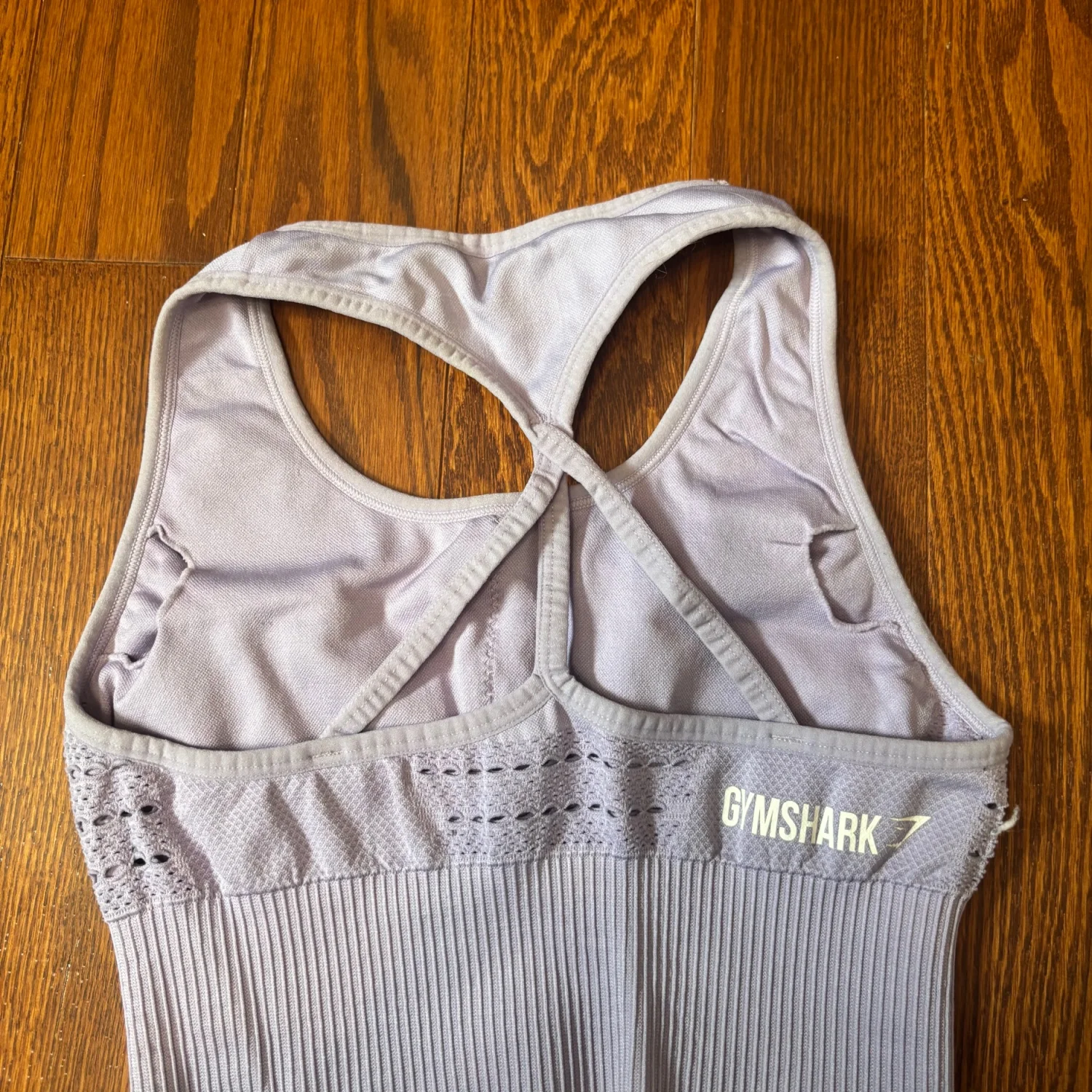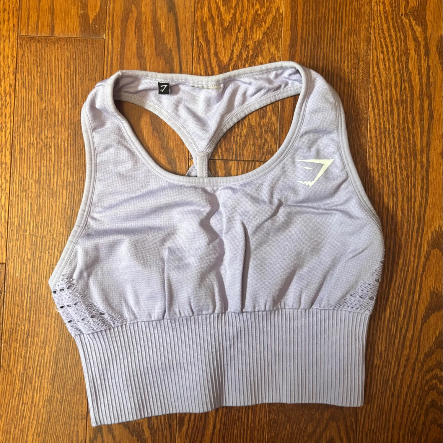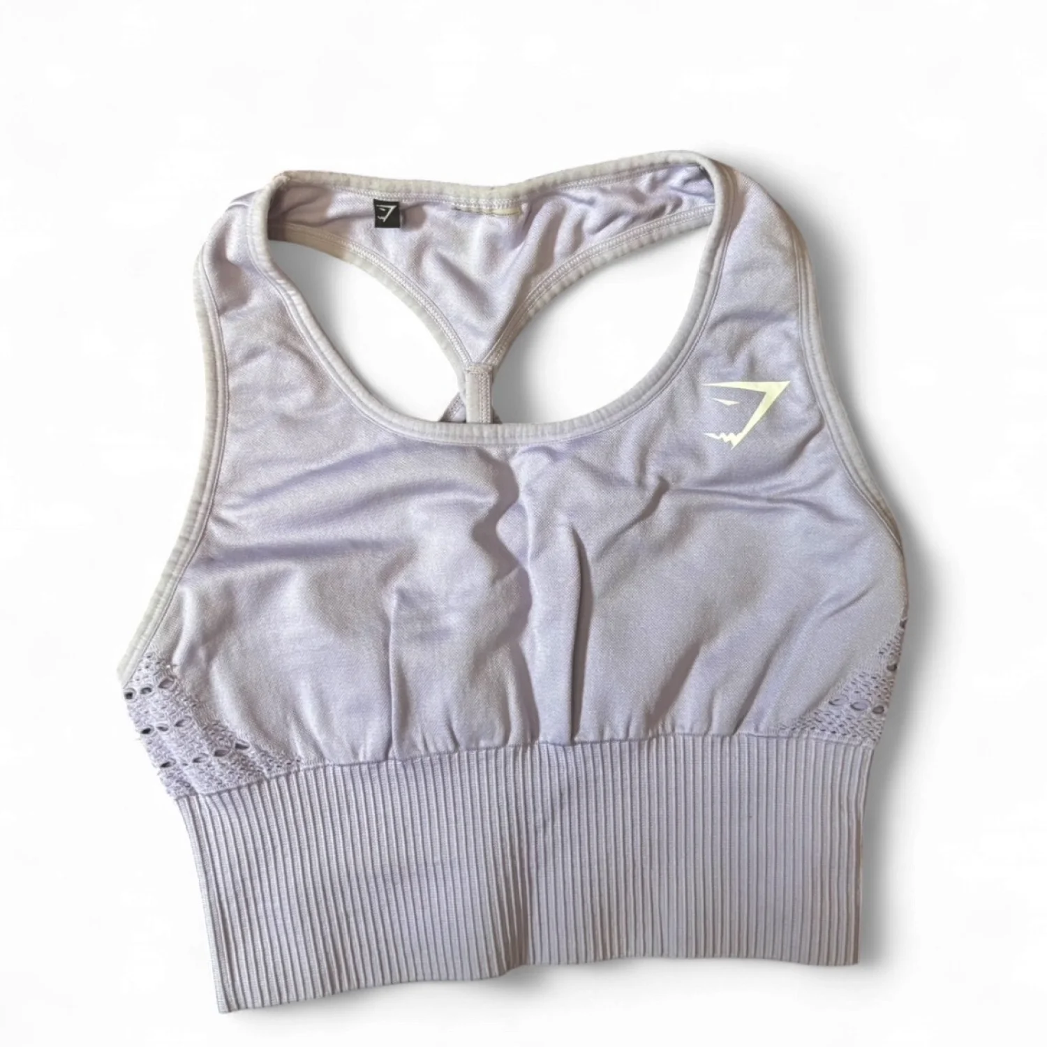 This image shows a Gymshark Energy Seamless crop top sports bra in a pastel lilac color. Size xs/s Cups aren’t included in photos but can be added upon request In great used condition Athleisure, clean girl aesthetic, performance core