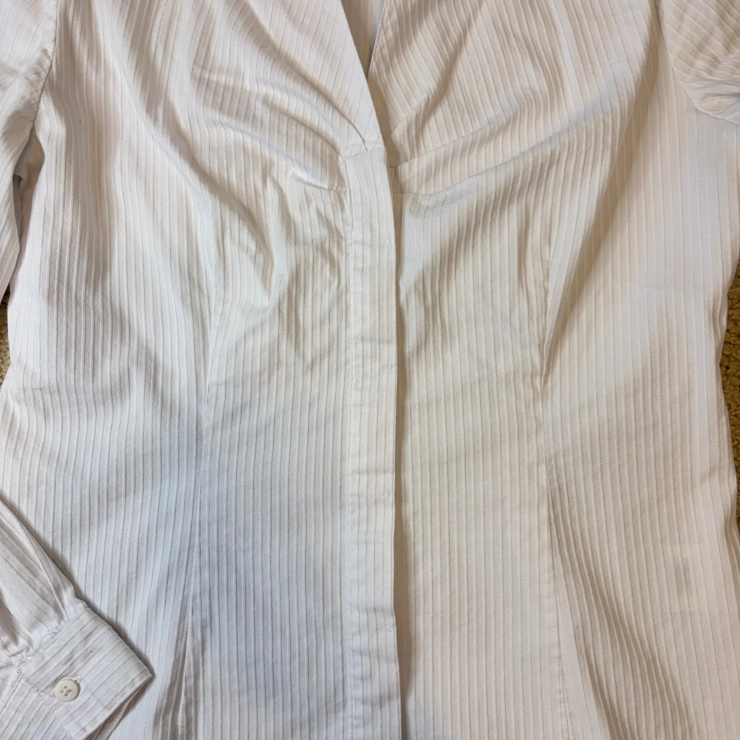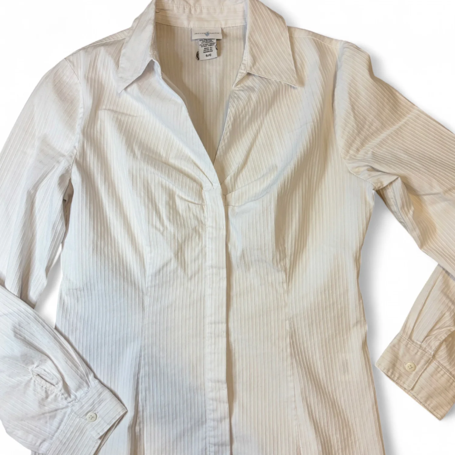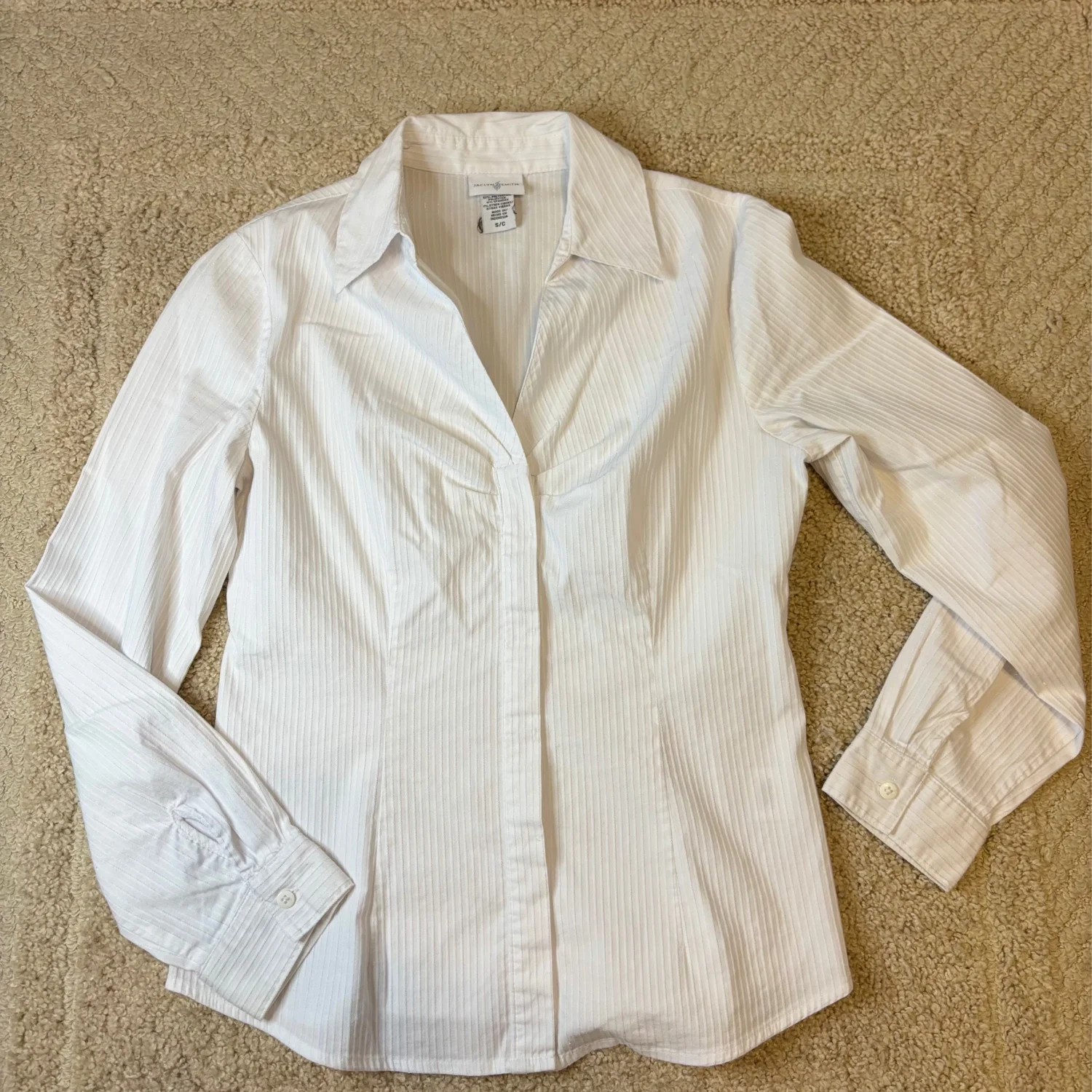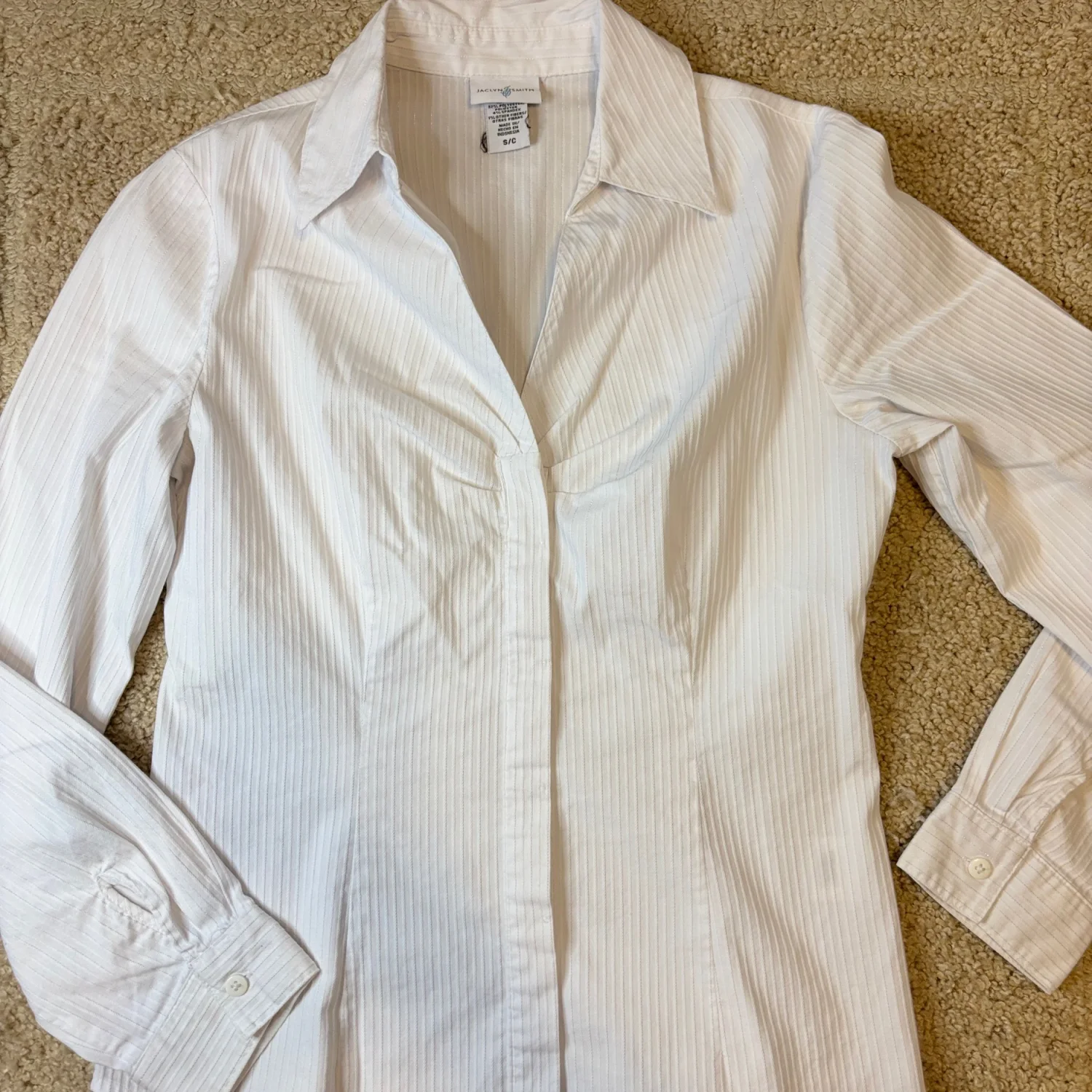 Jaclyn Smith white tailored long sleeve button down blouse with vertical shiny toned stripes Buttoned cuffs Great condition Small Cotton/ polyester/ spandex Pit to pit about 16.5 inches Pit down about 14 inches Arms about 17 inches
