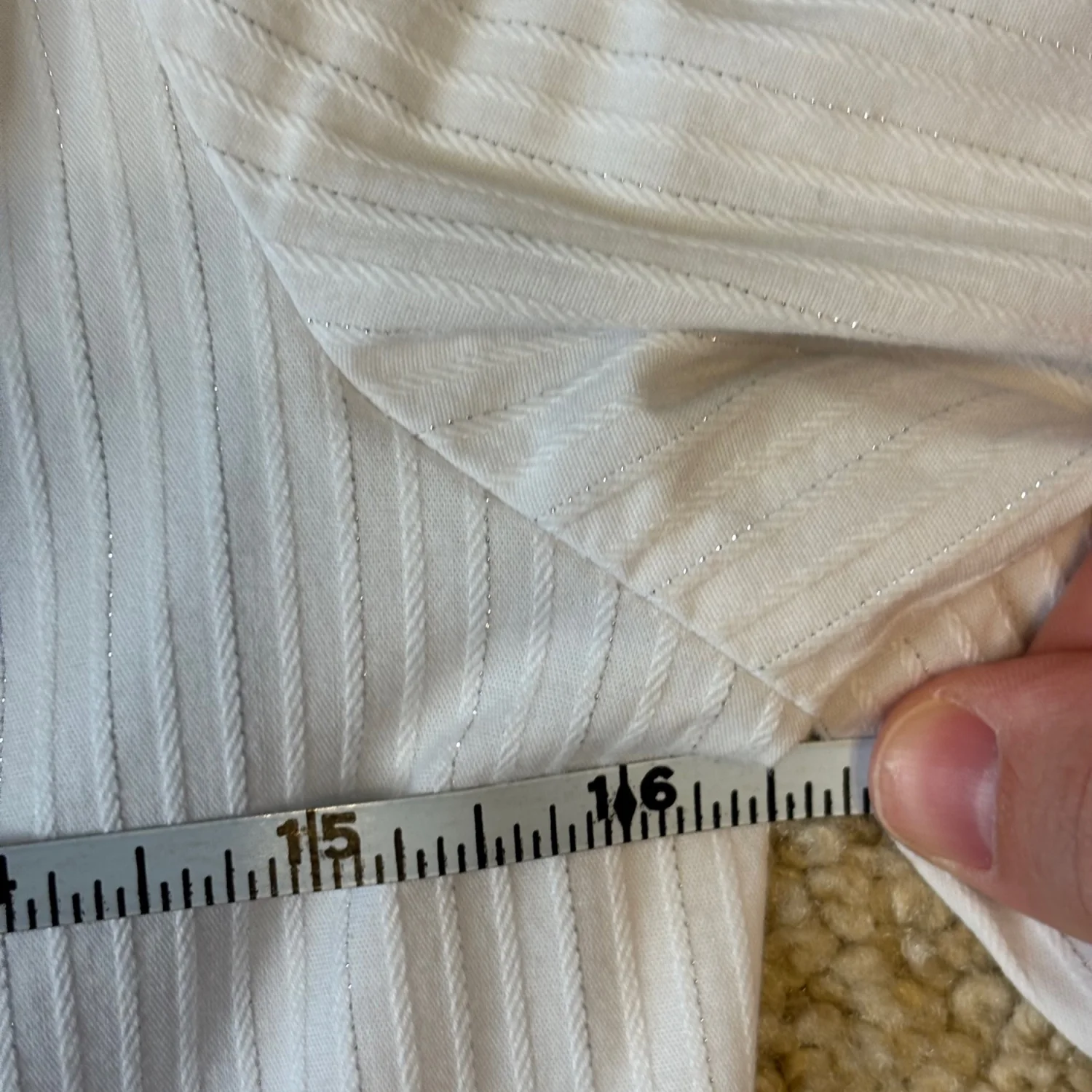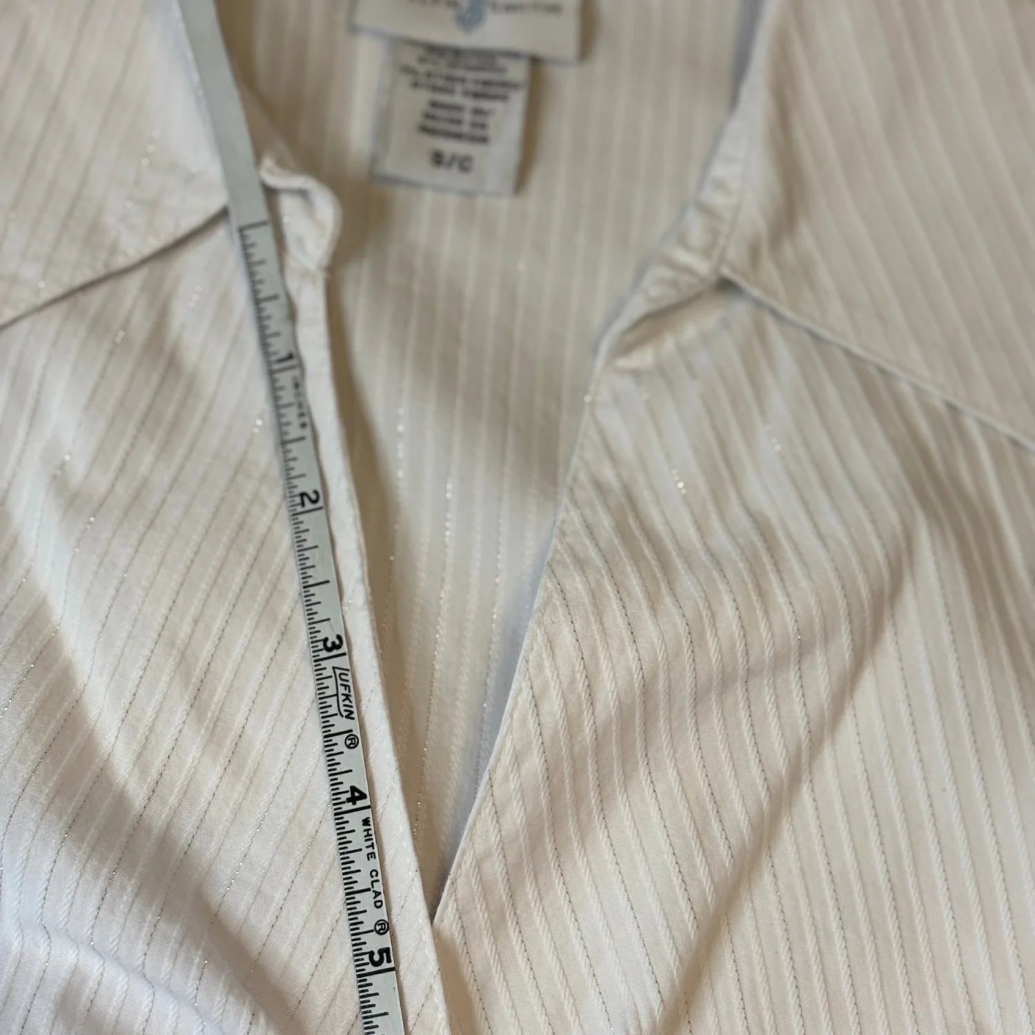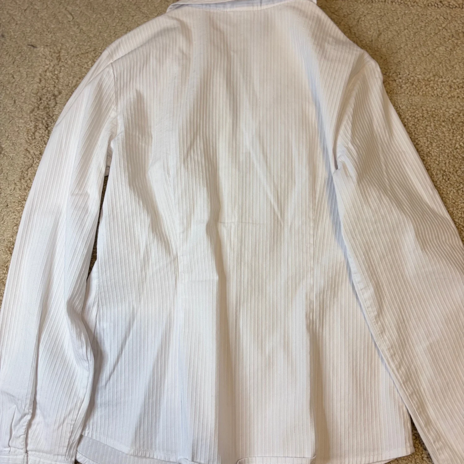 Jaclyn Smith white tailored long sleeve button down blouse with vertical shiny toned stripes Buttoned cuffs Great condition Small Cotton/ polyester/ spandex Pit to pit about 16.5 inches Pit down about 14 inches Arms about 17 inches