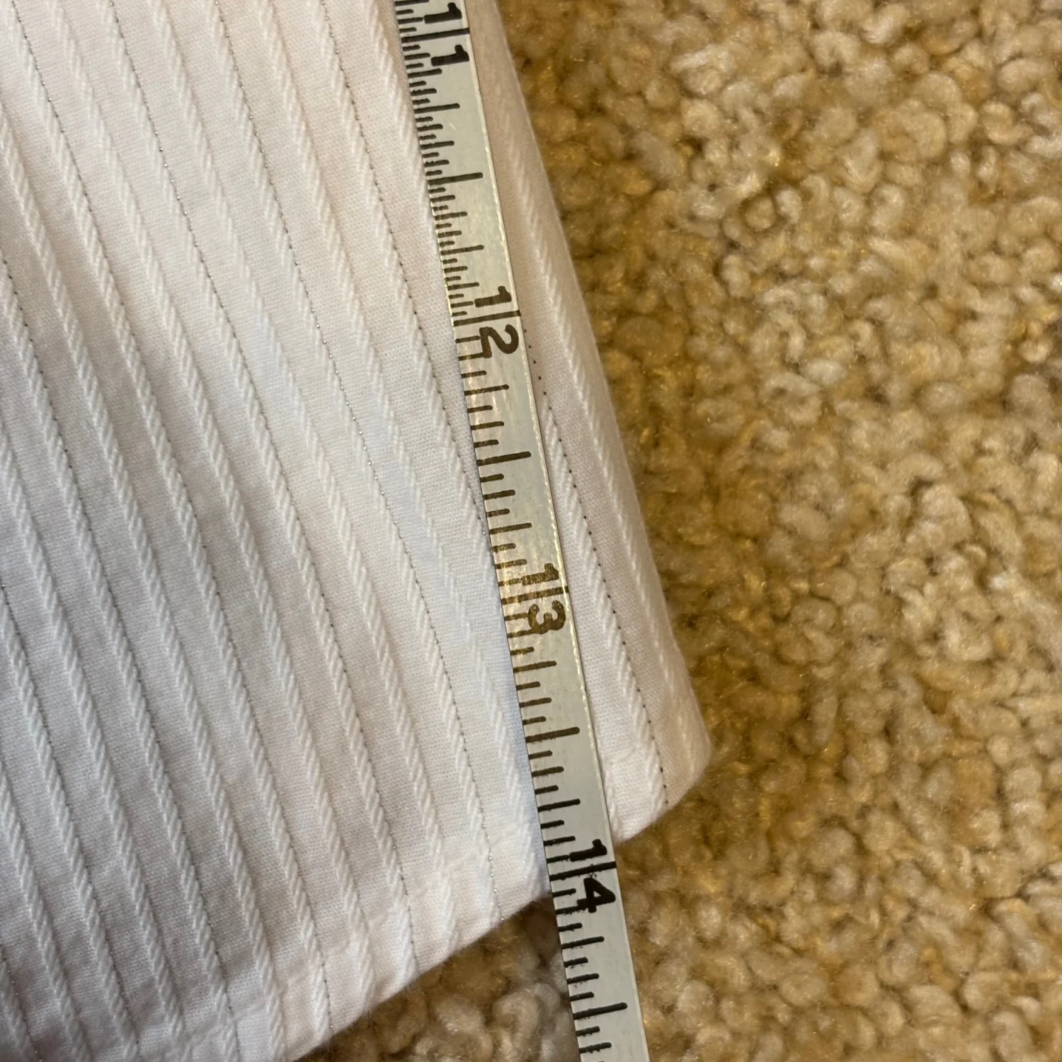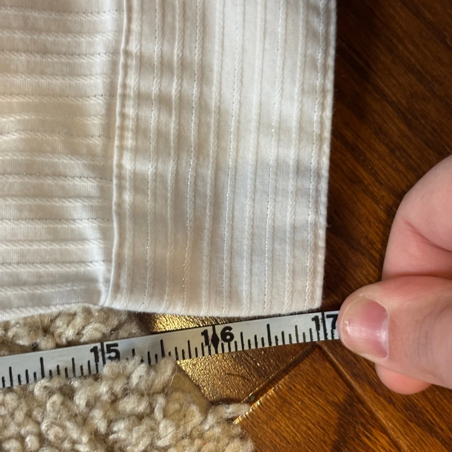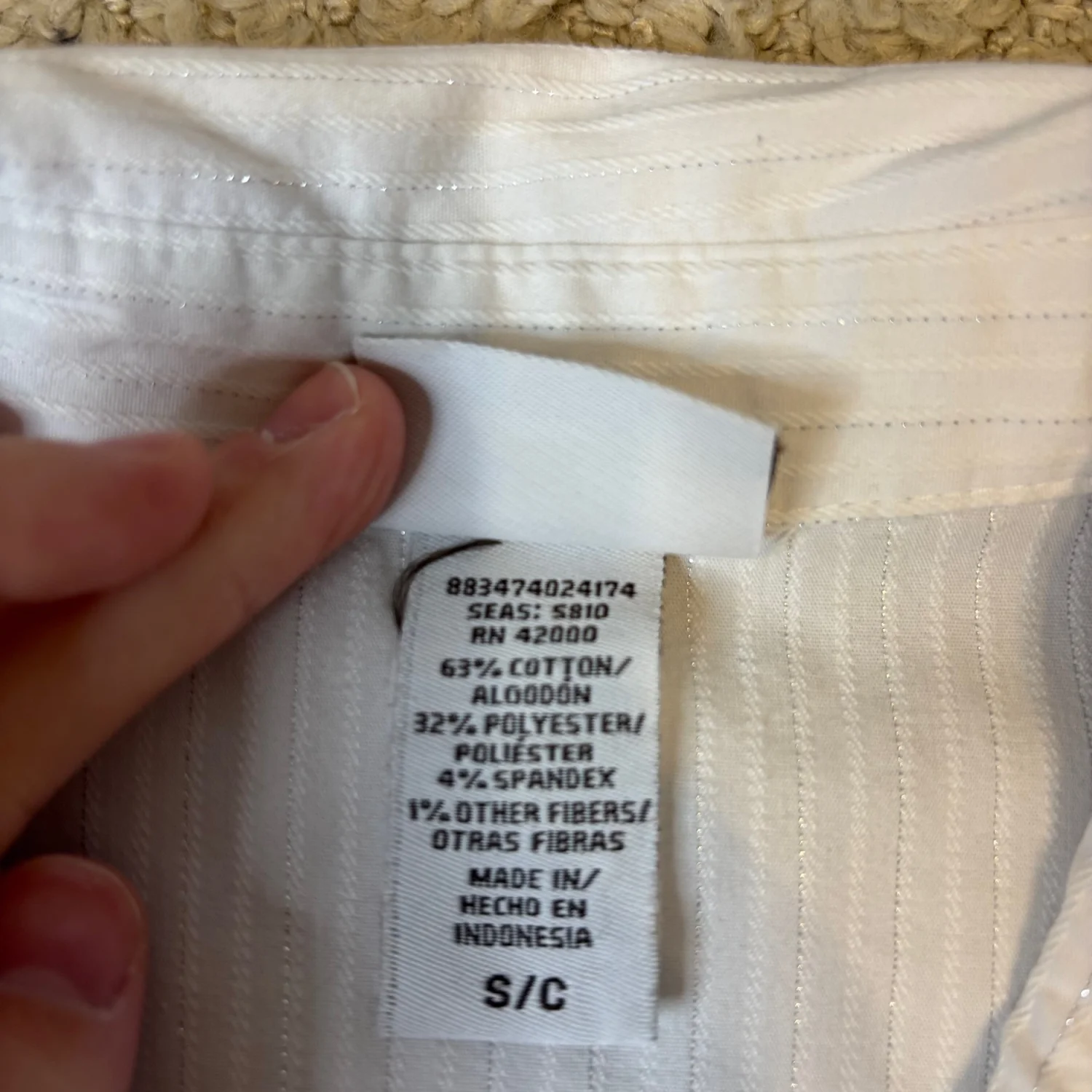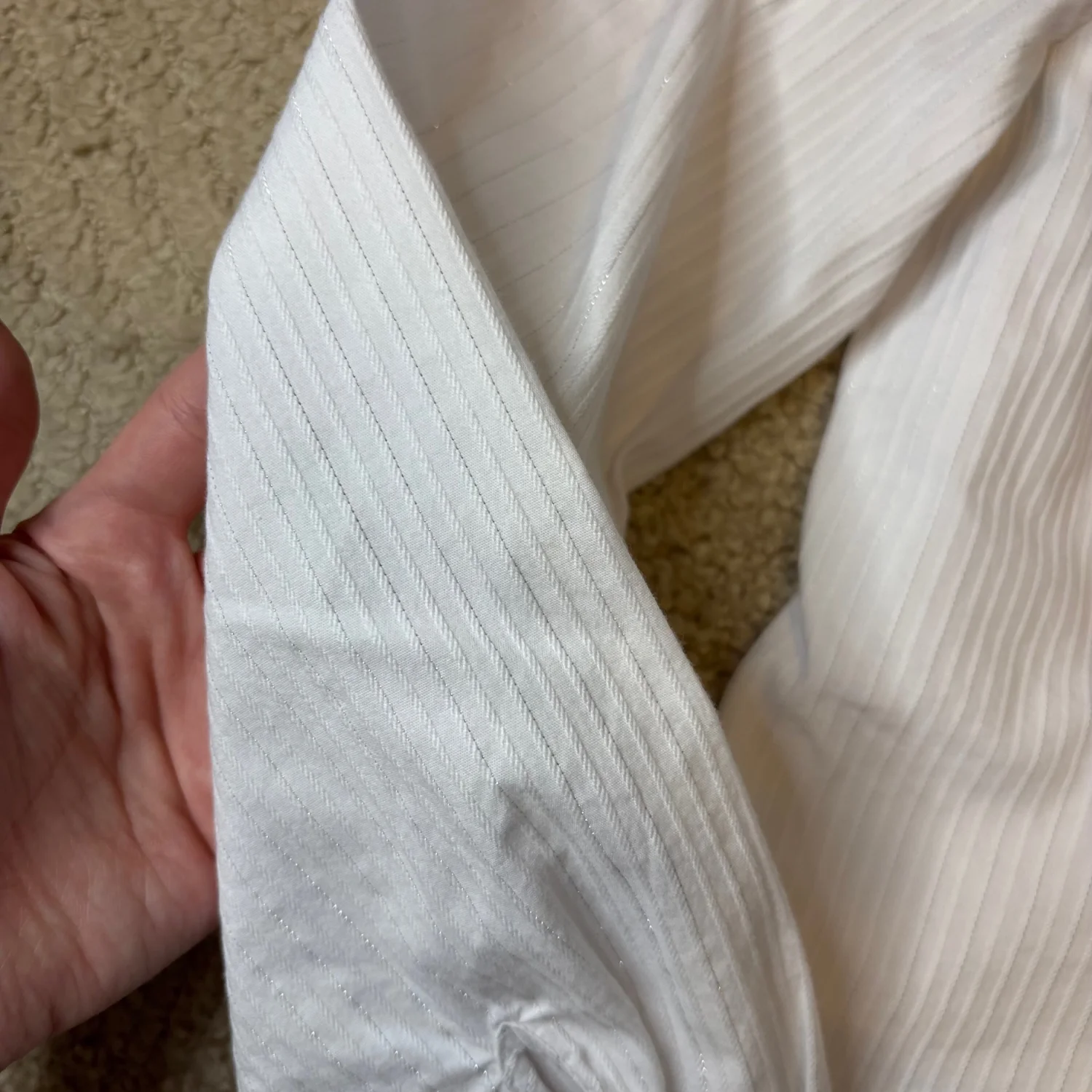 Jaclyn Smith white tailored long sleeve button down blouse with vertical shiny toned stripes Buttoned cuffs Great condition Small Cotton/ polyester/ spandex Pit to pit about 16.5 inches Pit down about 14 inches Arms about 17 inches