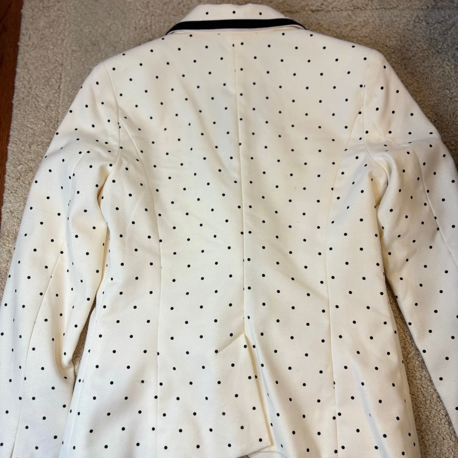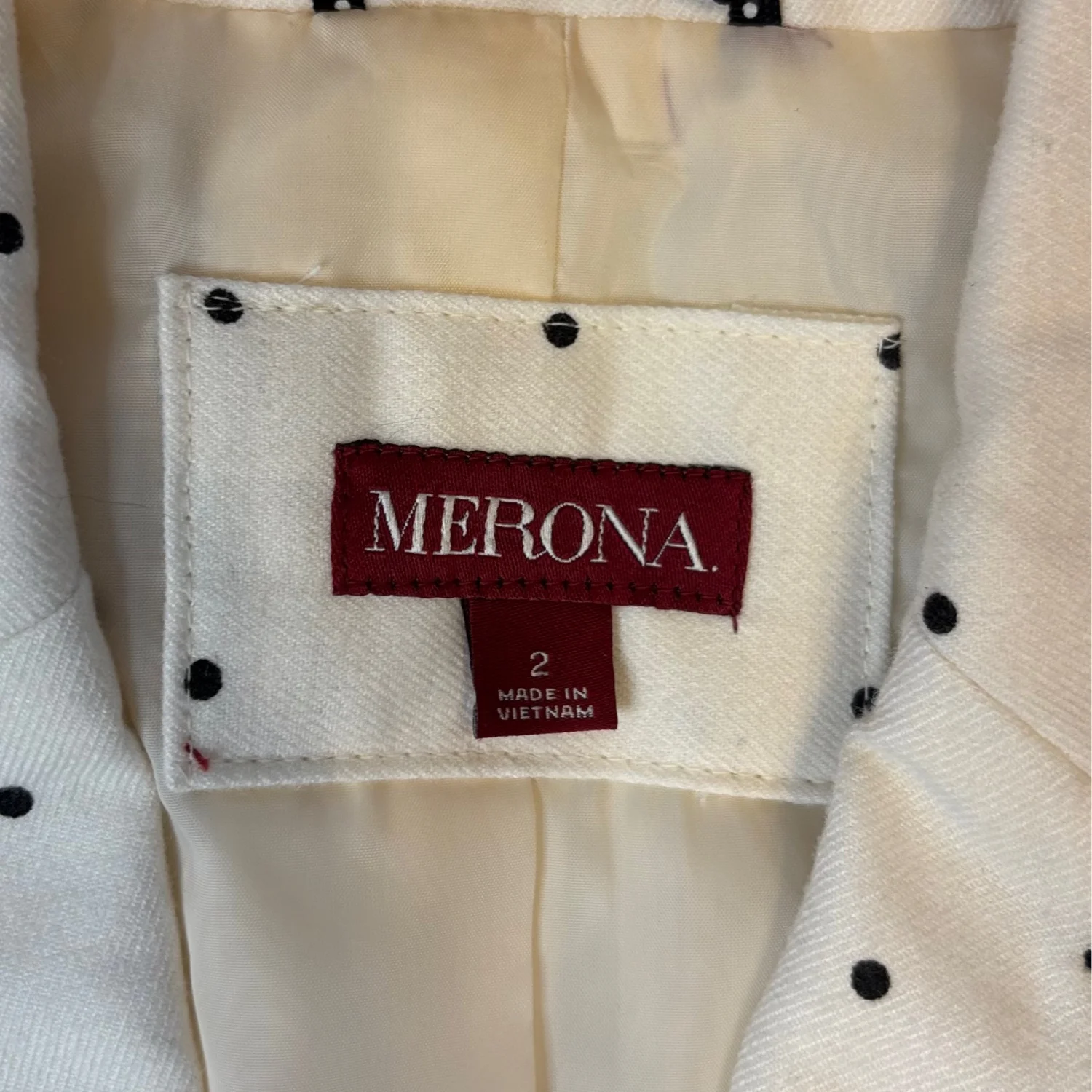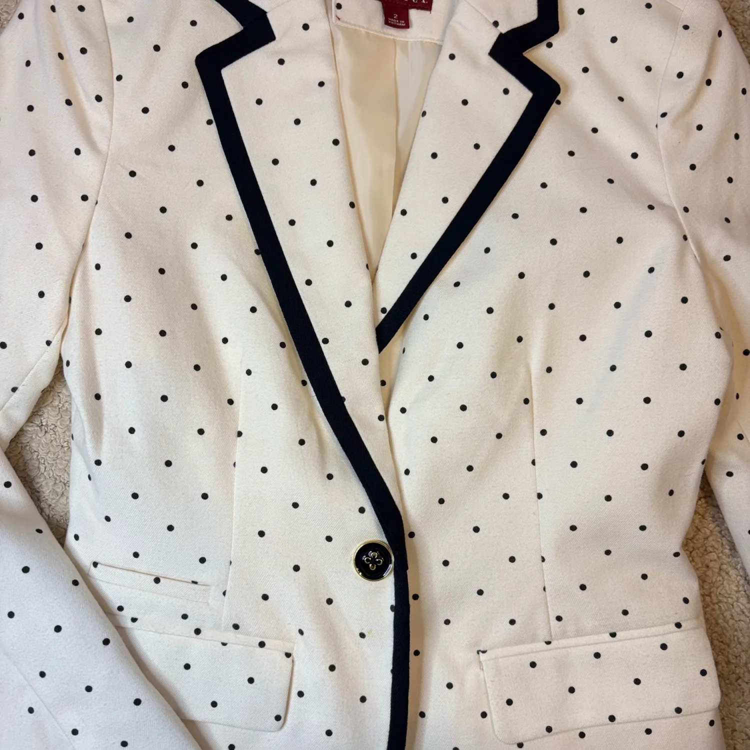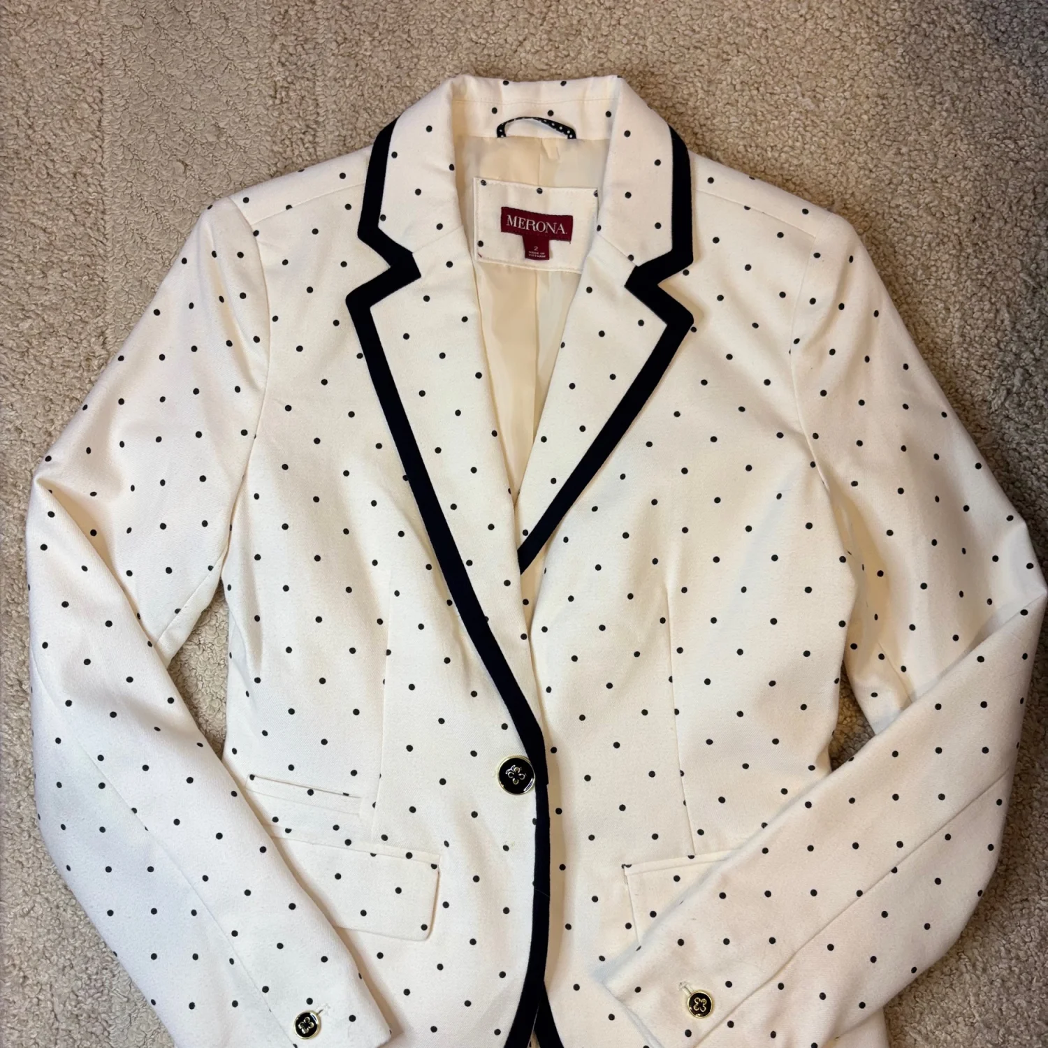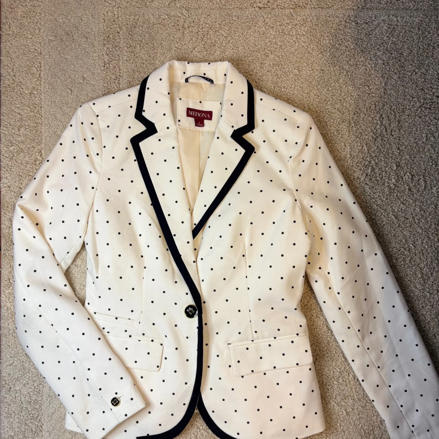 This stylish Merona blazer features a classic ivory background adorned with black polka dots, providing a timeless yet playful look. It has a tailored fit with a black trim along the lapel and pockets, enhancing its sophisticated design. The blazer is made from a comfortable material and is fully lined for added comfort. Ideal for both professional settings and casual outings. Size 2. #polkadots #blazer #Merona