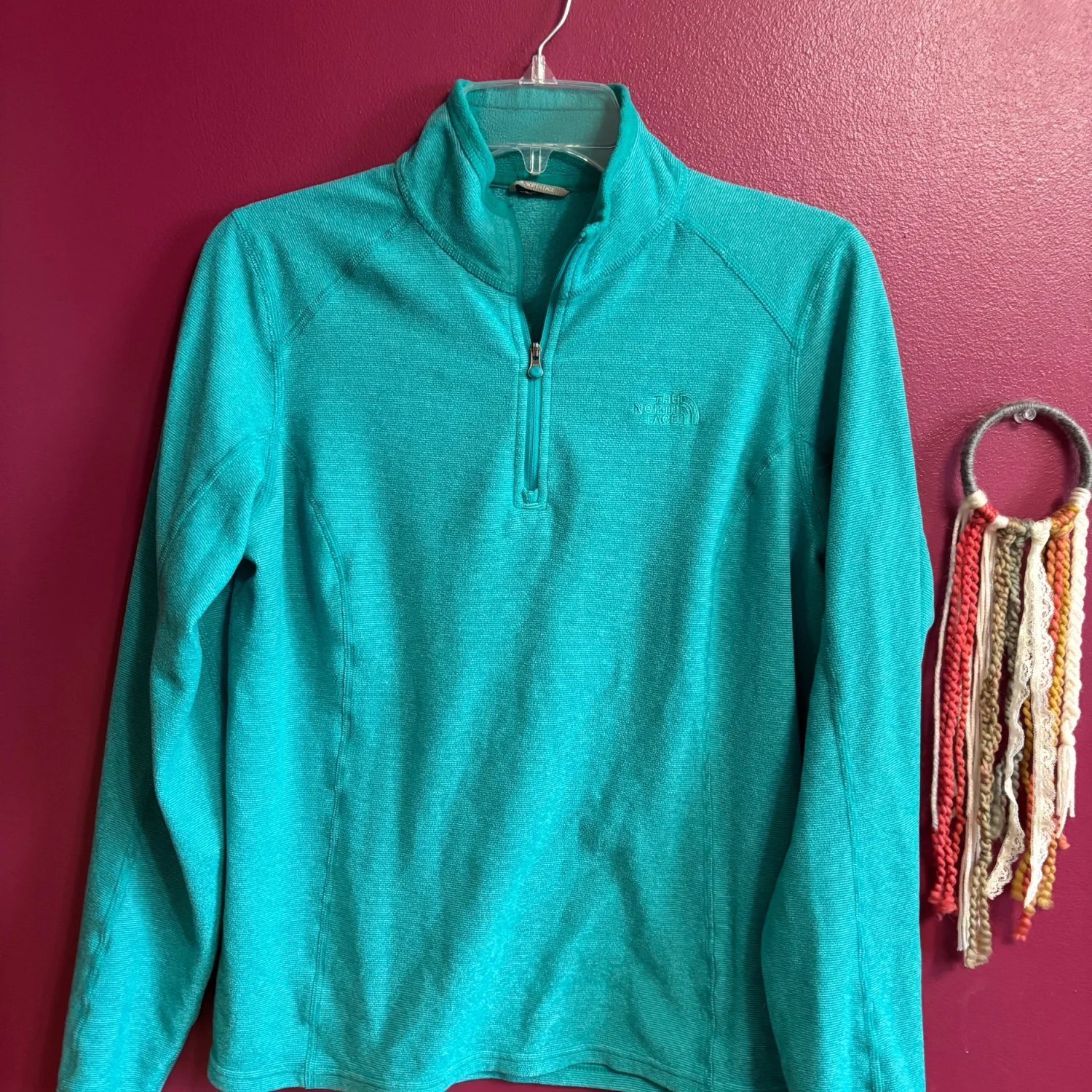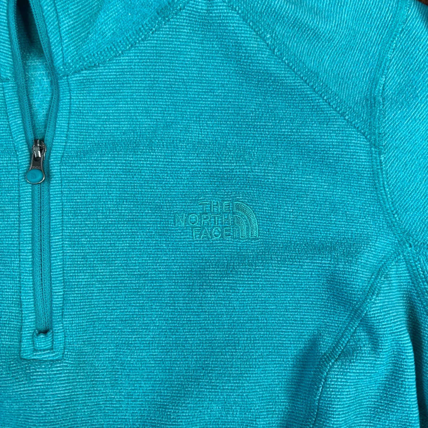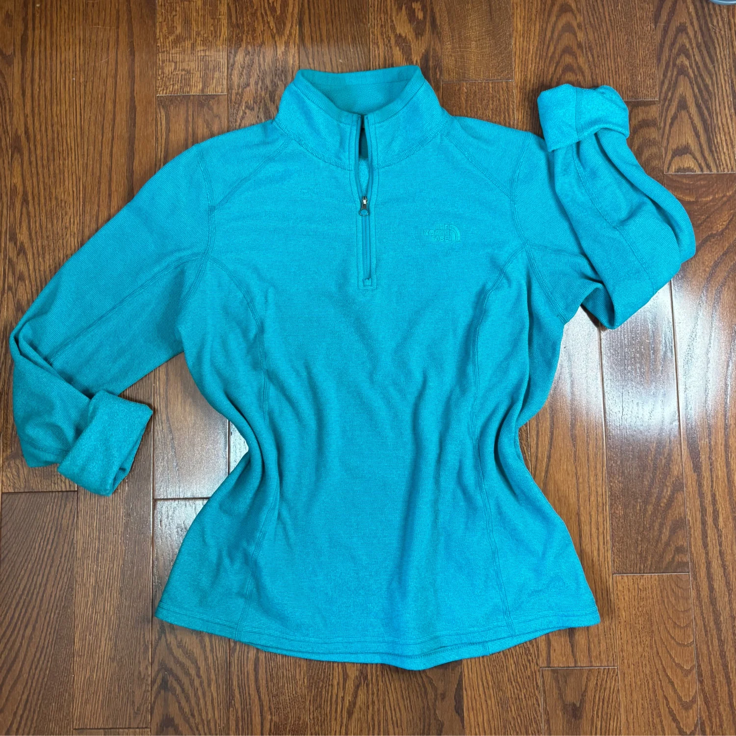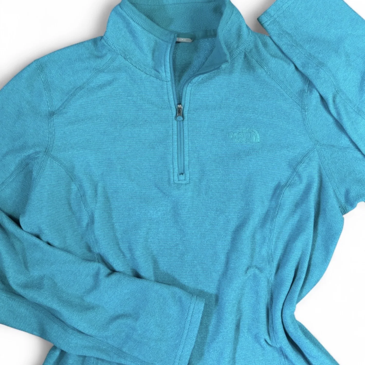 North face women’s blue quarter zip fleece jacket Light weight and warm Appears to fit a size small best. Measurements included Pit to pit about 18.5 inches Pit down about 14 inches Arms about 20 inches