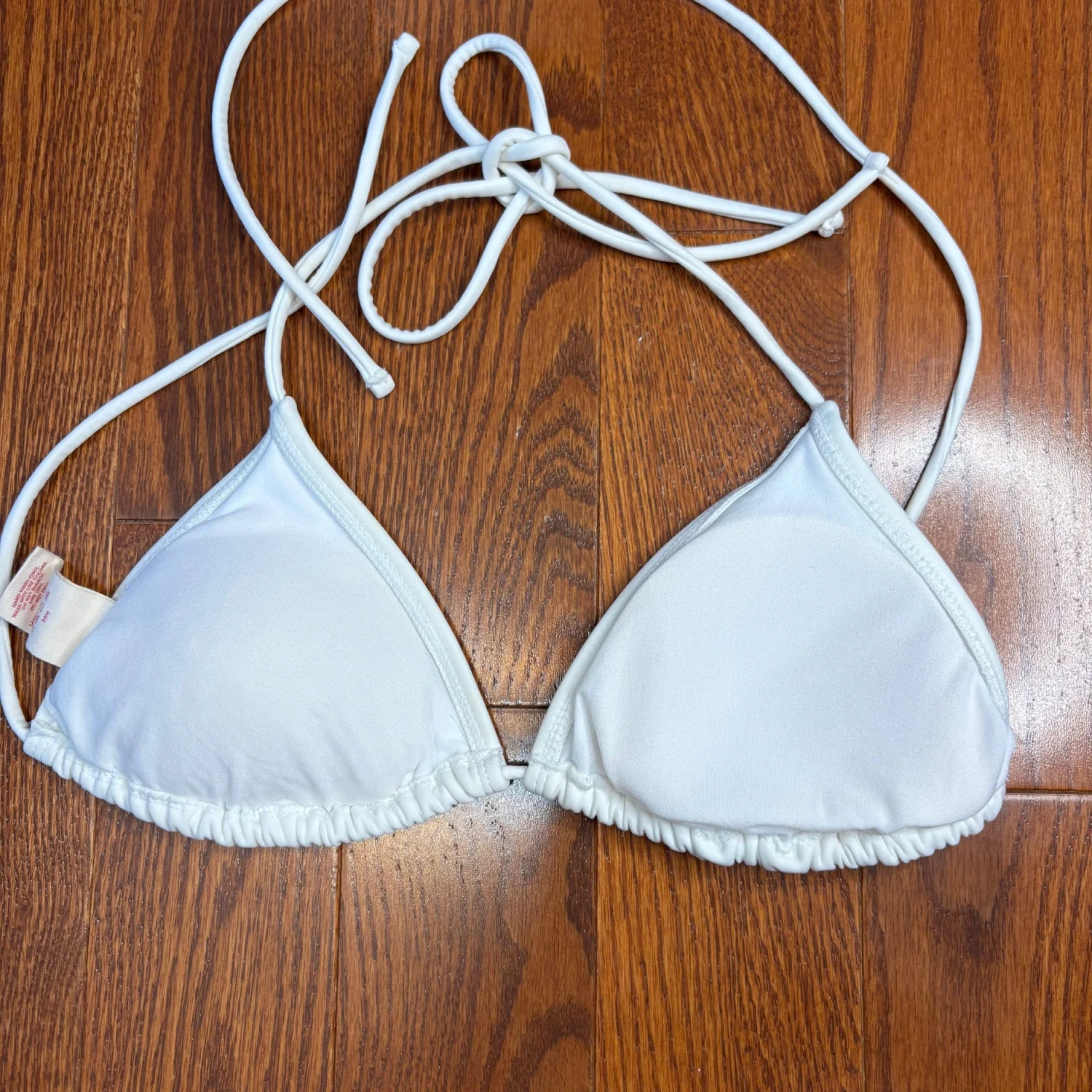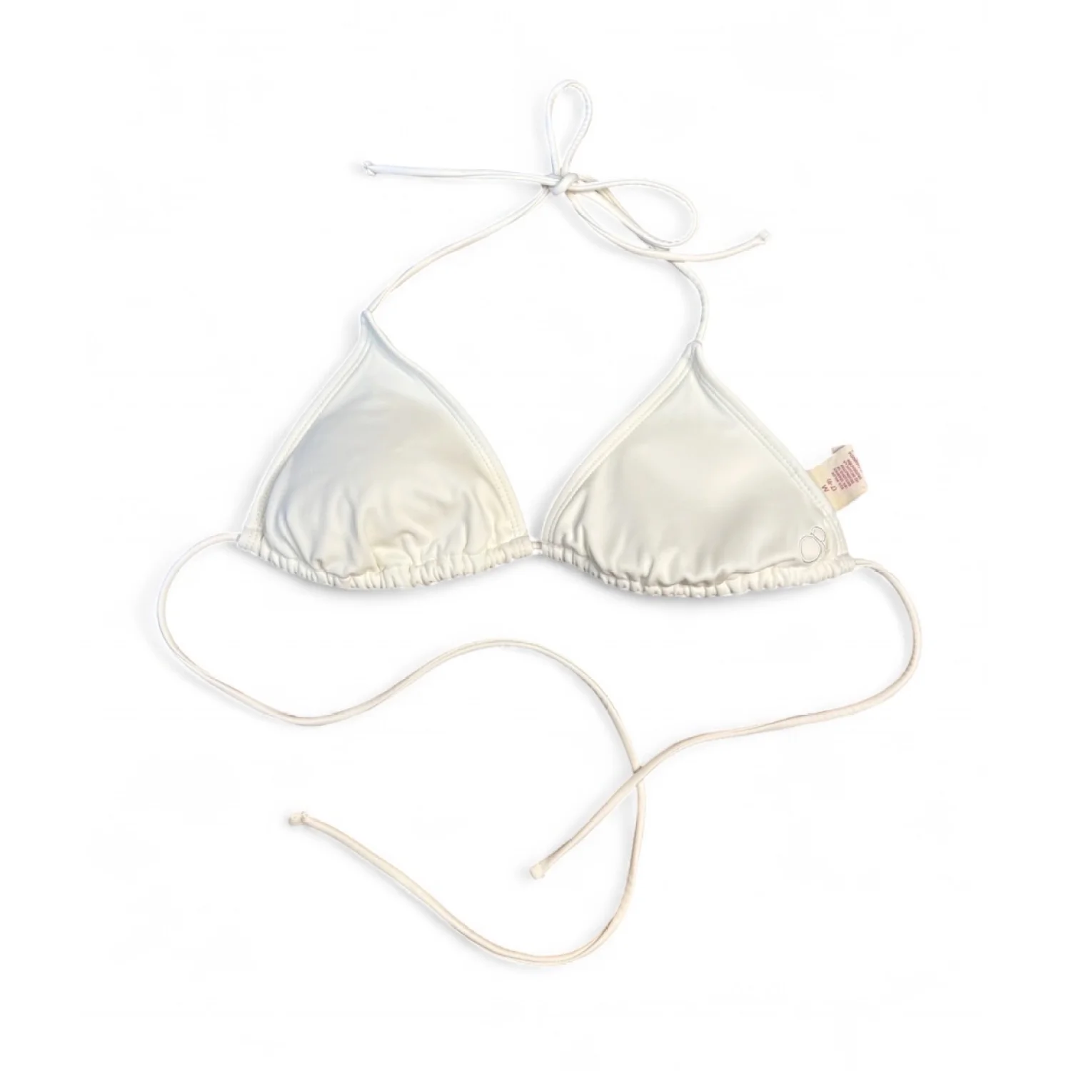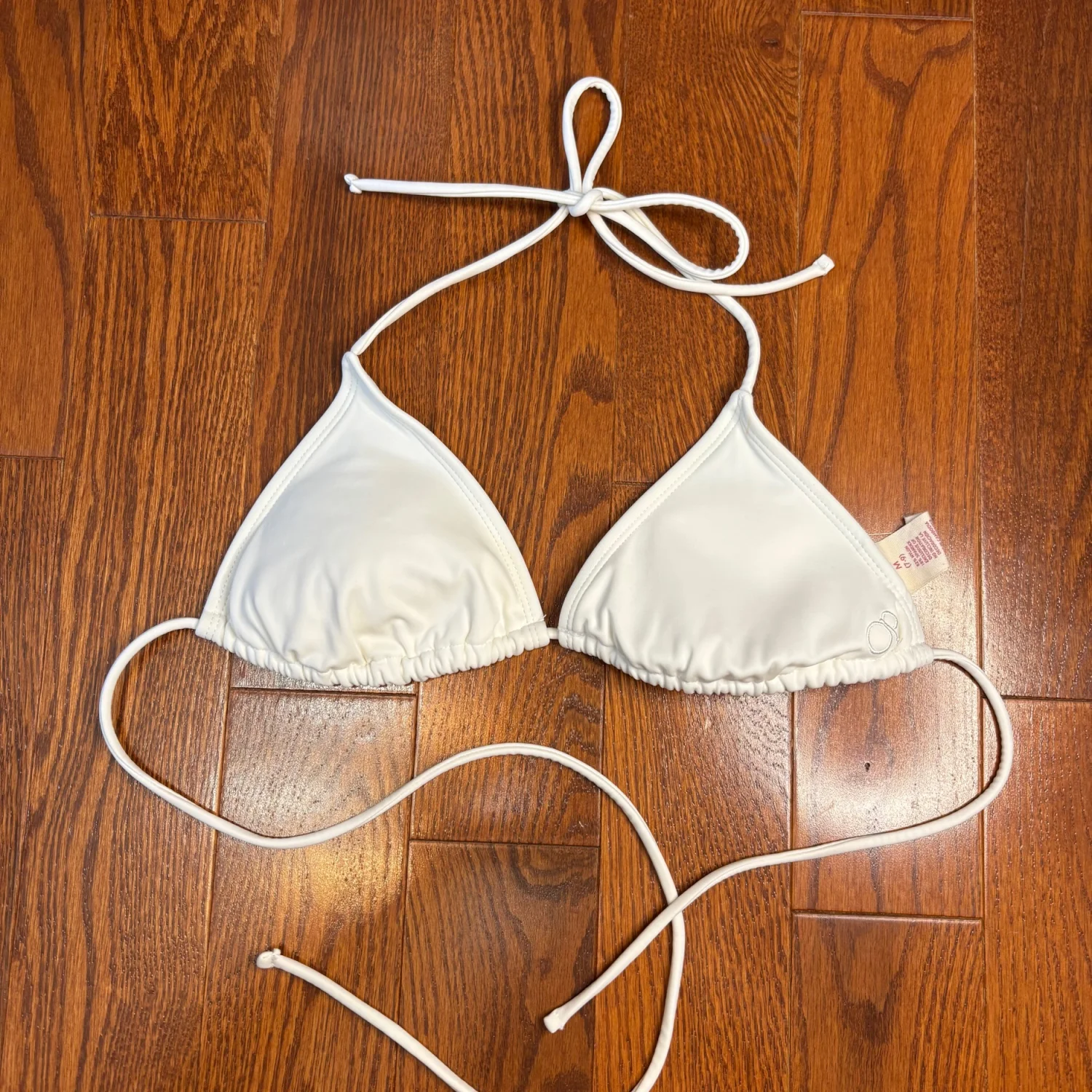 This white triangle bikini top is a classic swimwear piece from the brand Ocean Pacific (OP). It features adjustable halter and back ties, a timeless silhouette, and sliding cups that allow you to customize the coverage and fit.