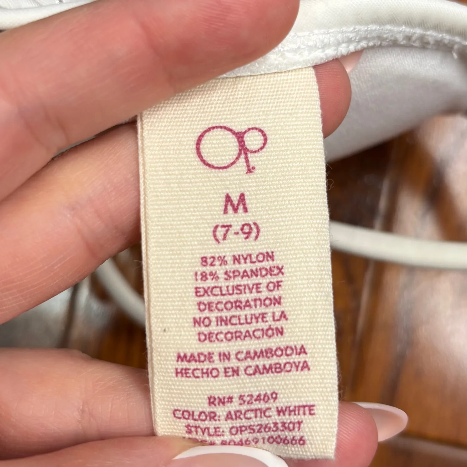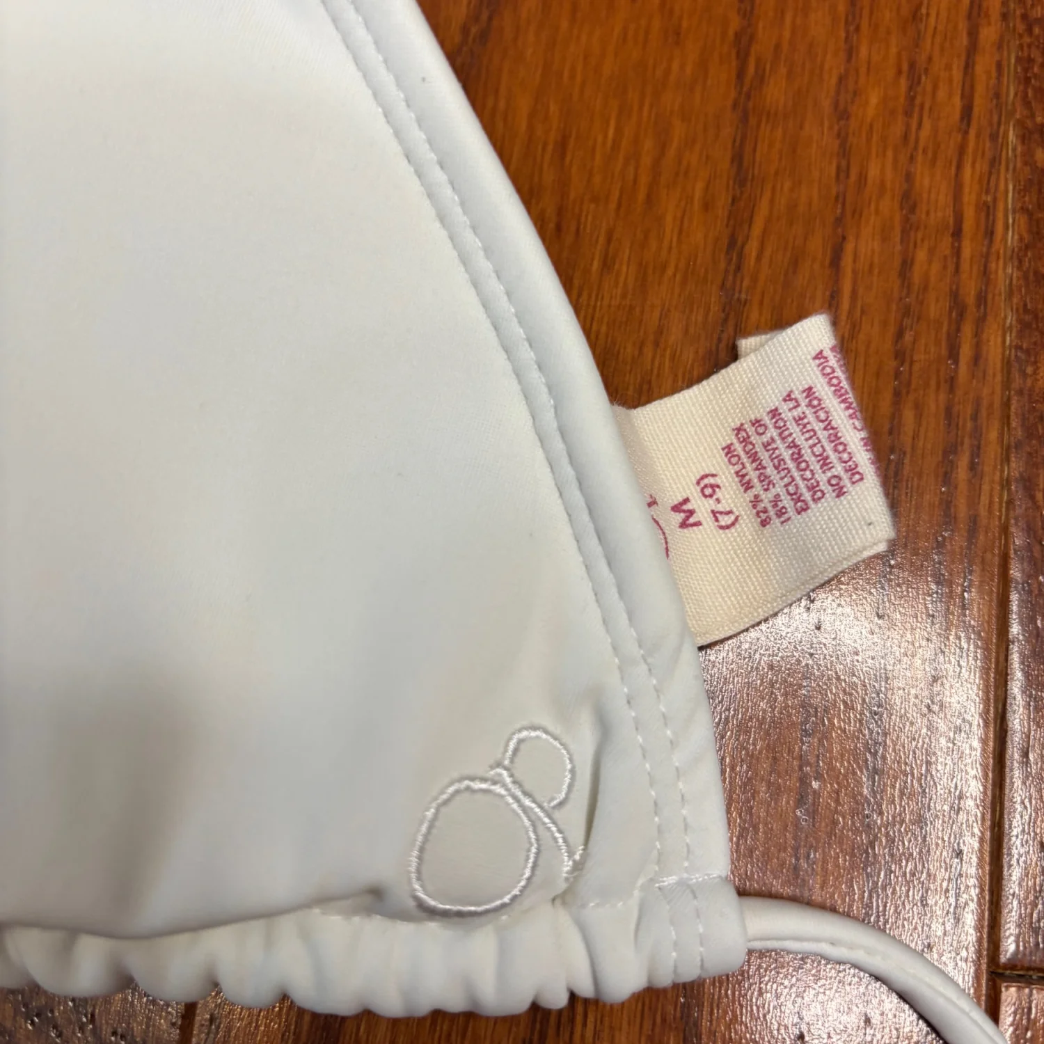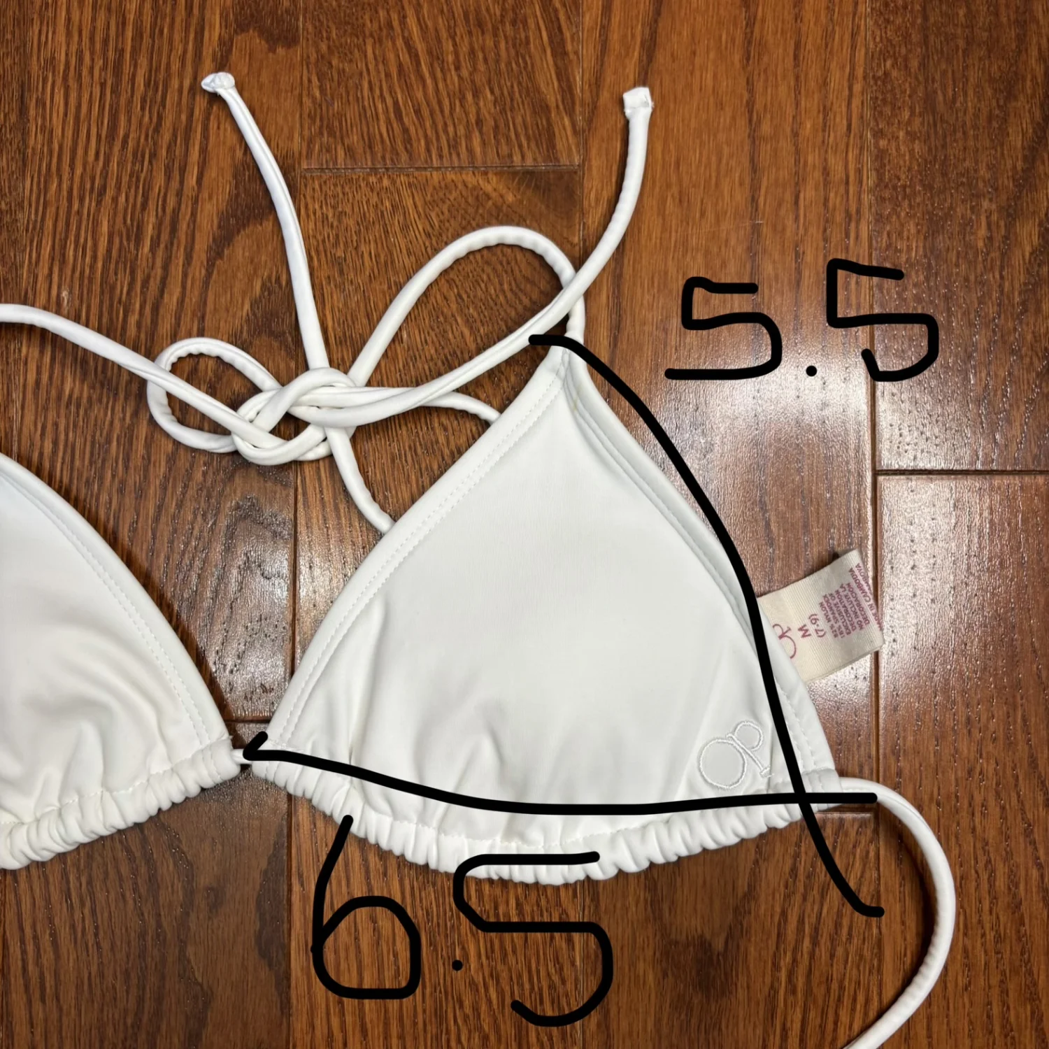 This white triangle bikini top is a classic swimwear piece from the brand Ocean Pacific (OP). It features adjustable halter and back ties, a timeless silhouette, and sliding cups that allow you to customize the coverage and fit.