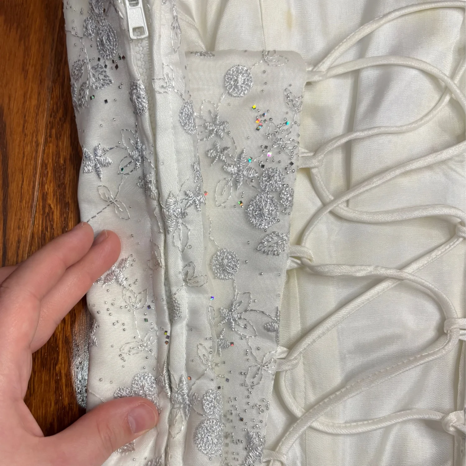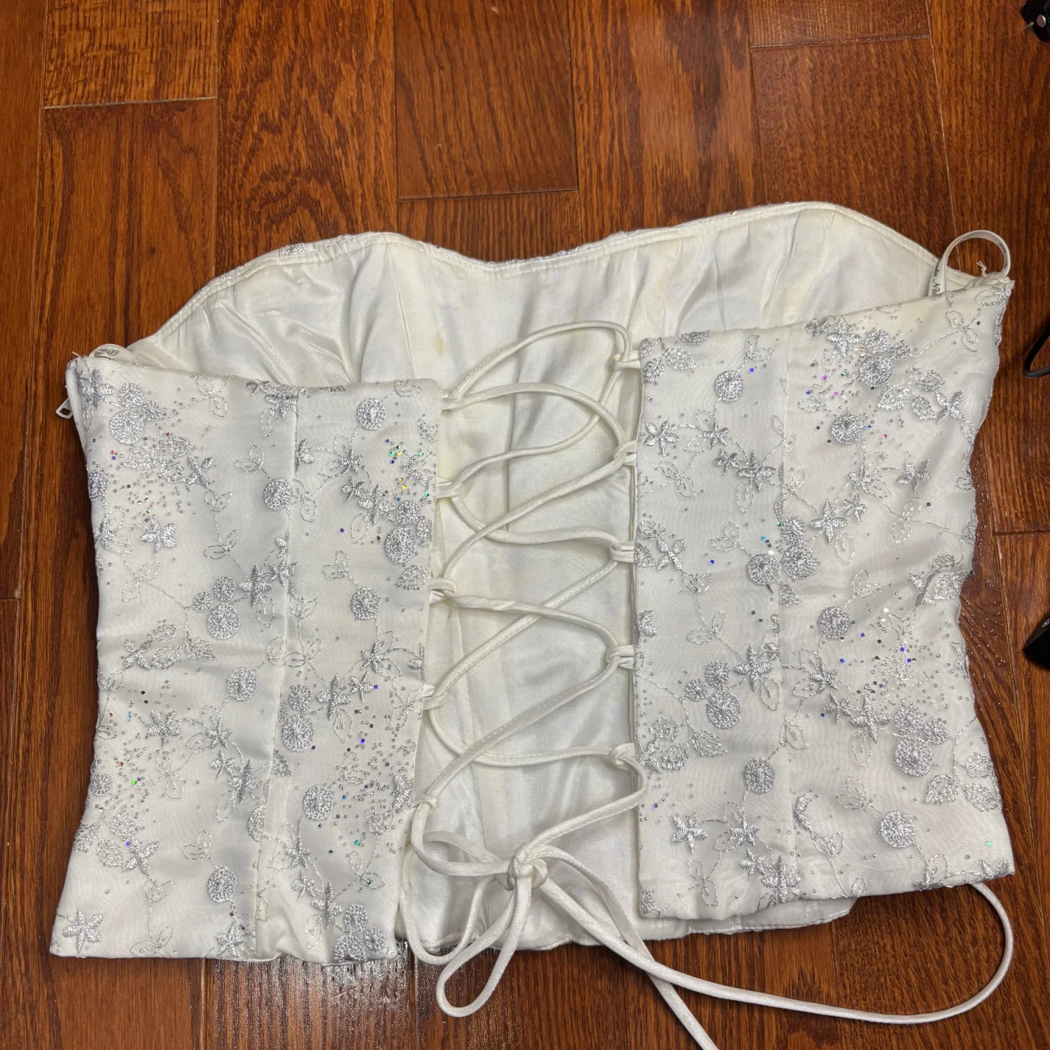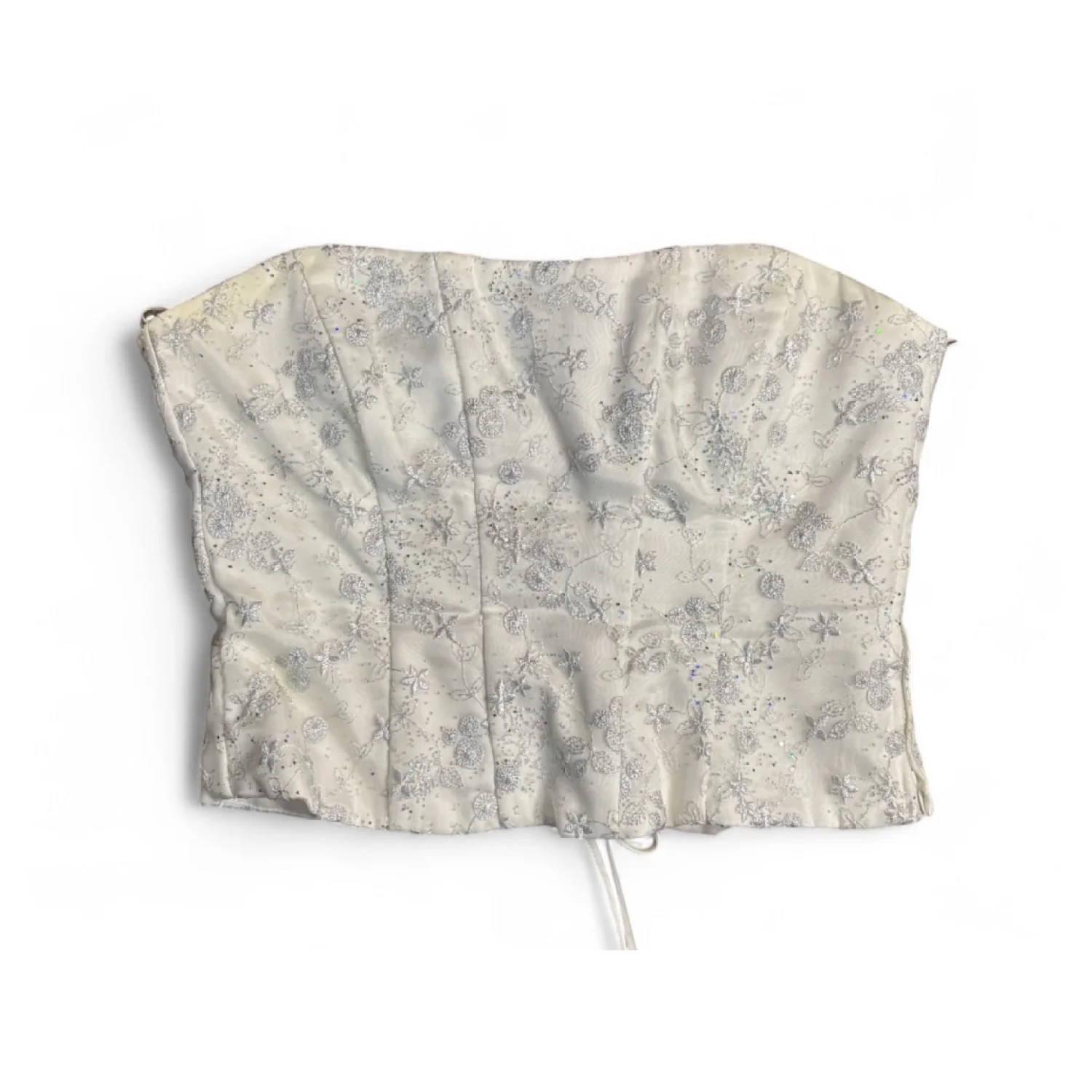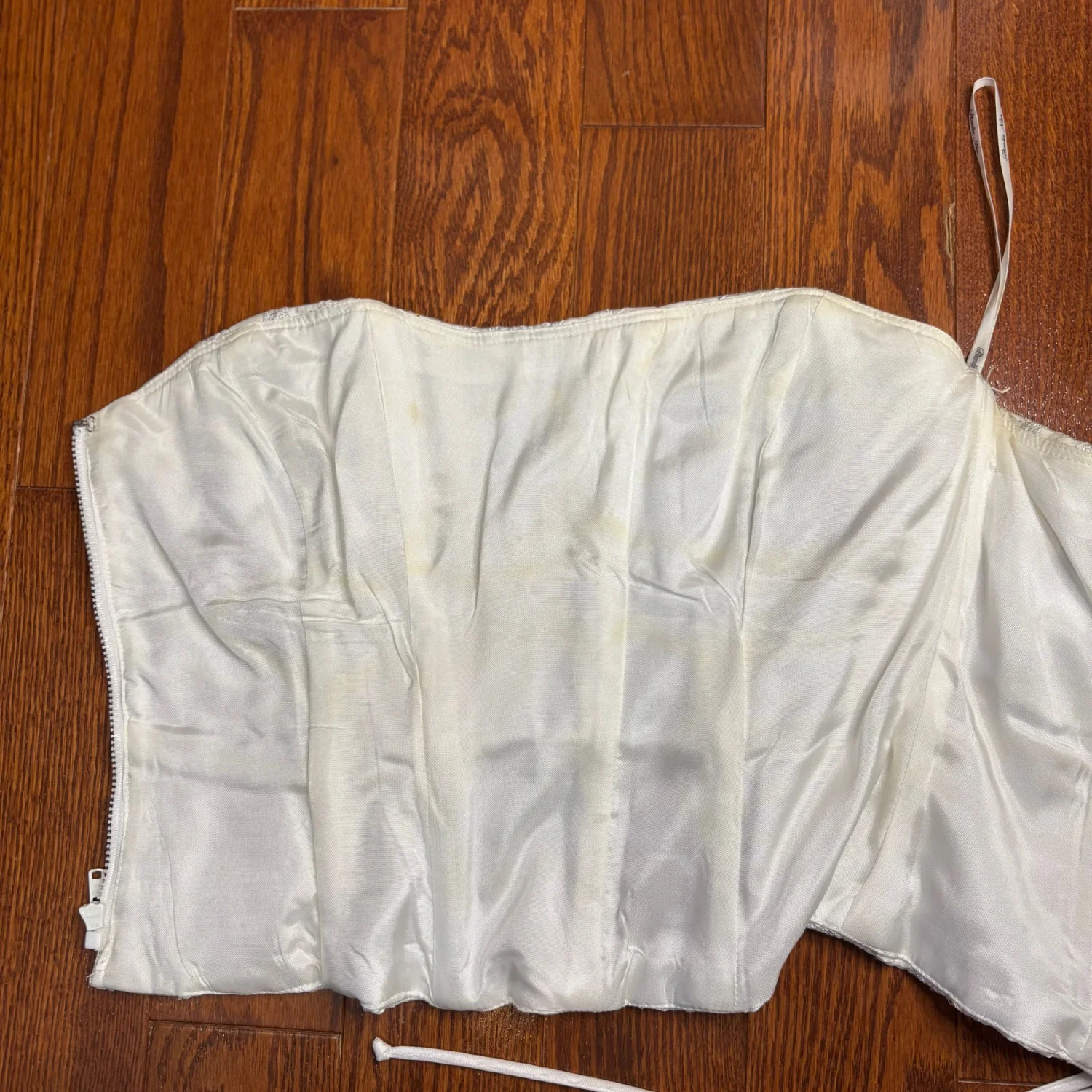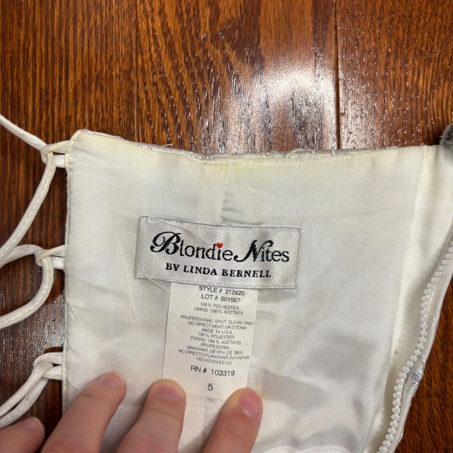 Vintage beaded floral embroidery blondie nites white/ivory corset top with lace up back and side zipper By Linda Bernell Polyester and acetate Size 5 Pit to pit about 15-16 inches Pit down about 9.5 inches Spotting near arm pits and inside top, unsure if dry cleaning will do the trick! Selling as is
