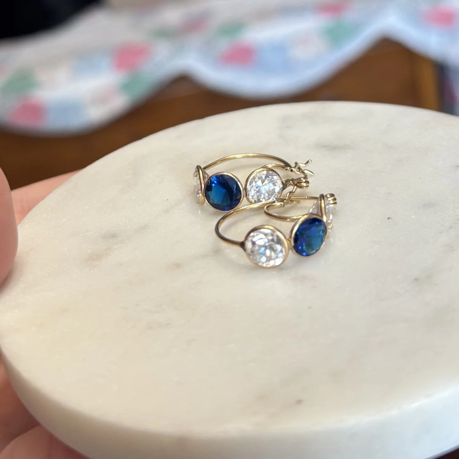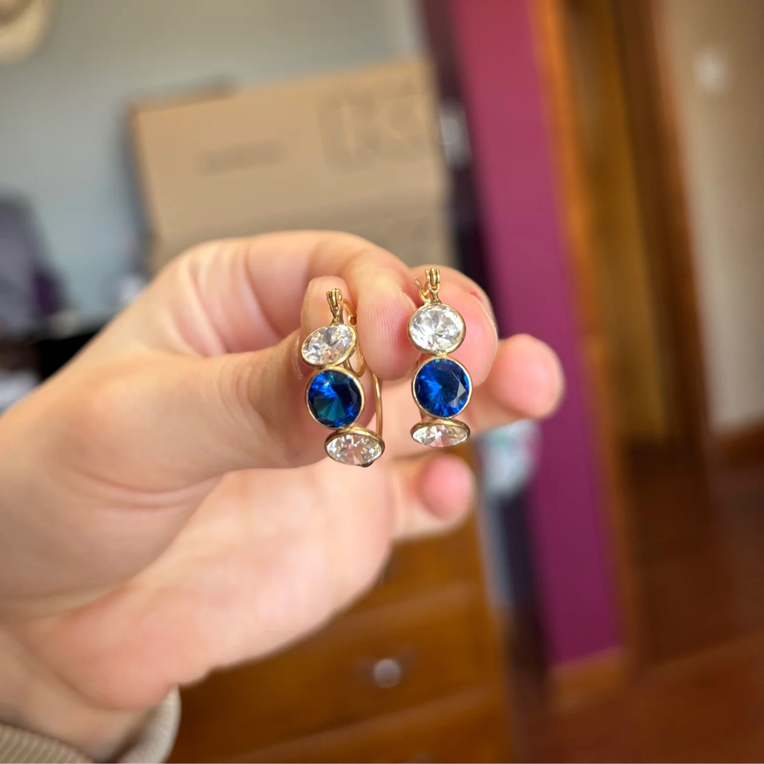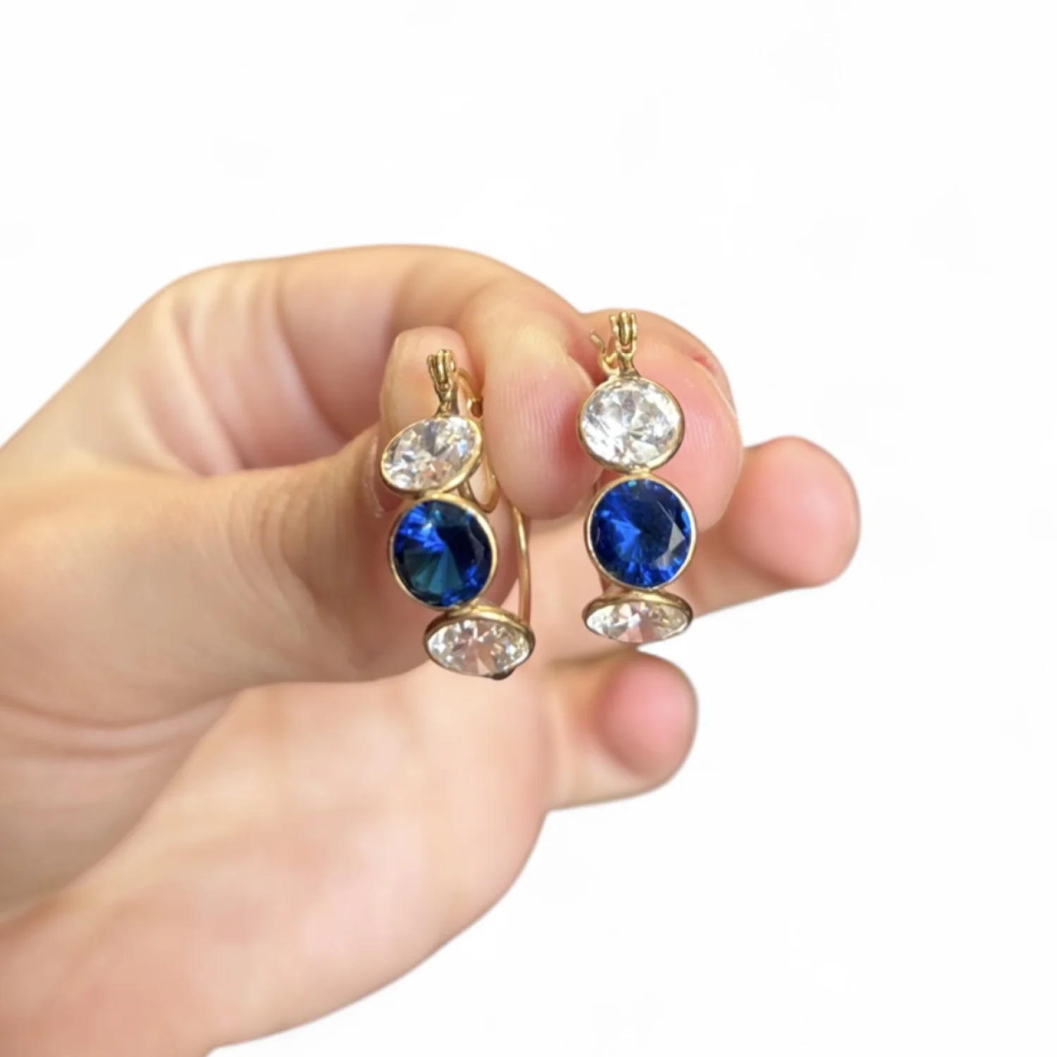 These vintage gold hoop earrings feature a three-stone bezel setting with alternating blue and clear round gemstones in a gold-tone finish. Rare, stylish, 70s vintage earrings, good condition