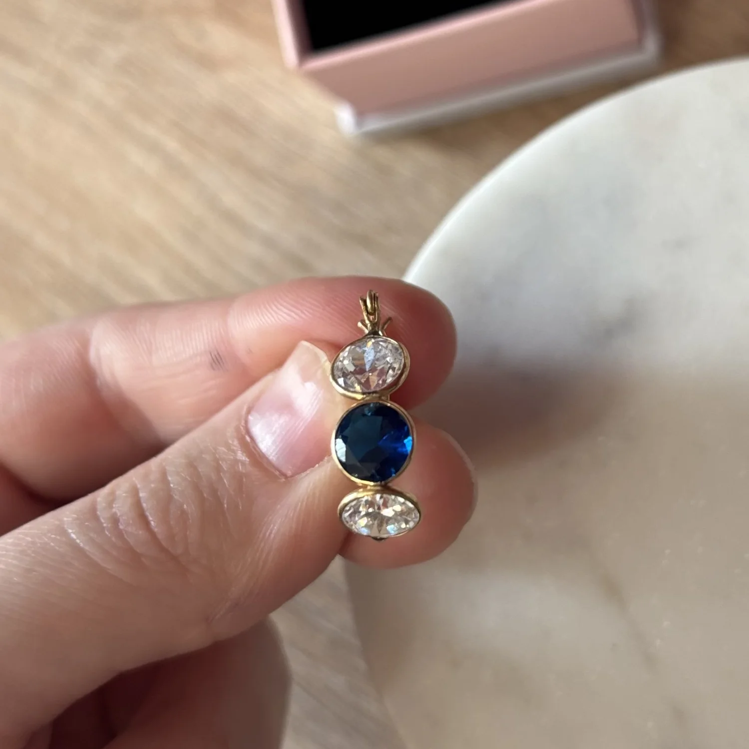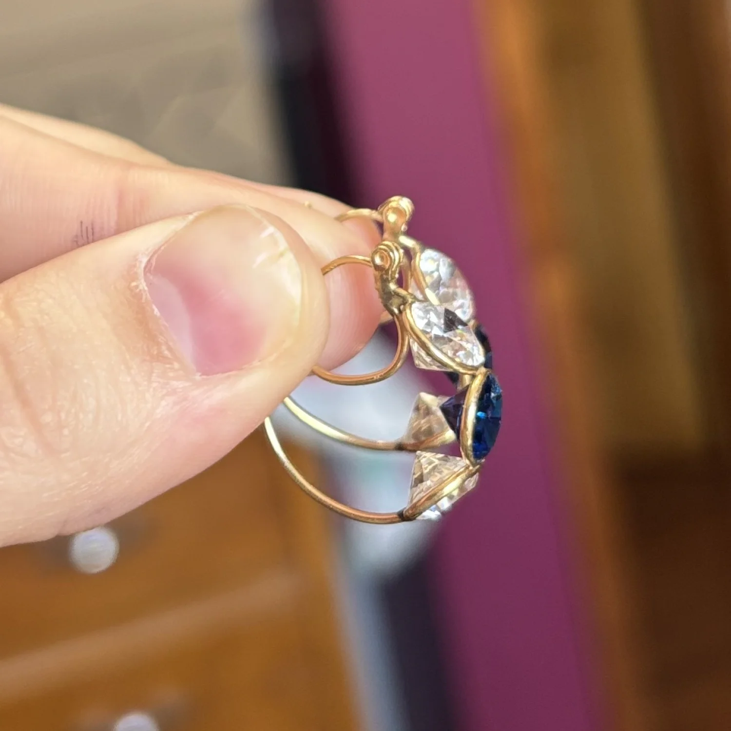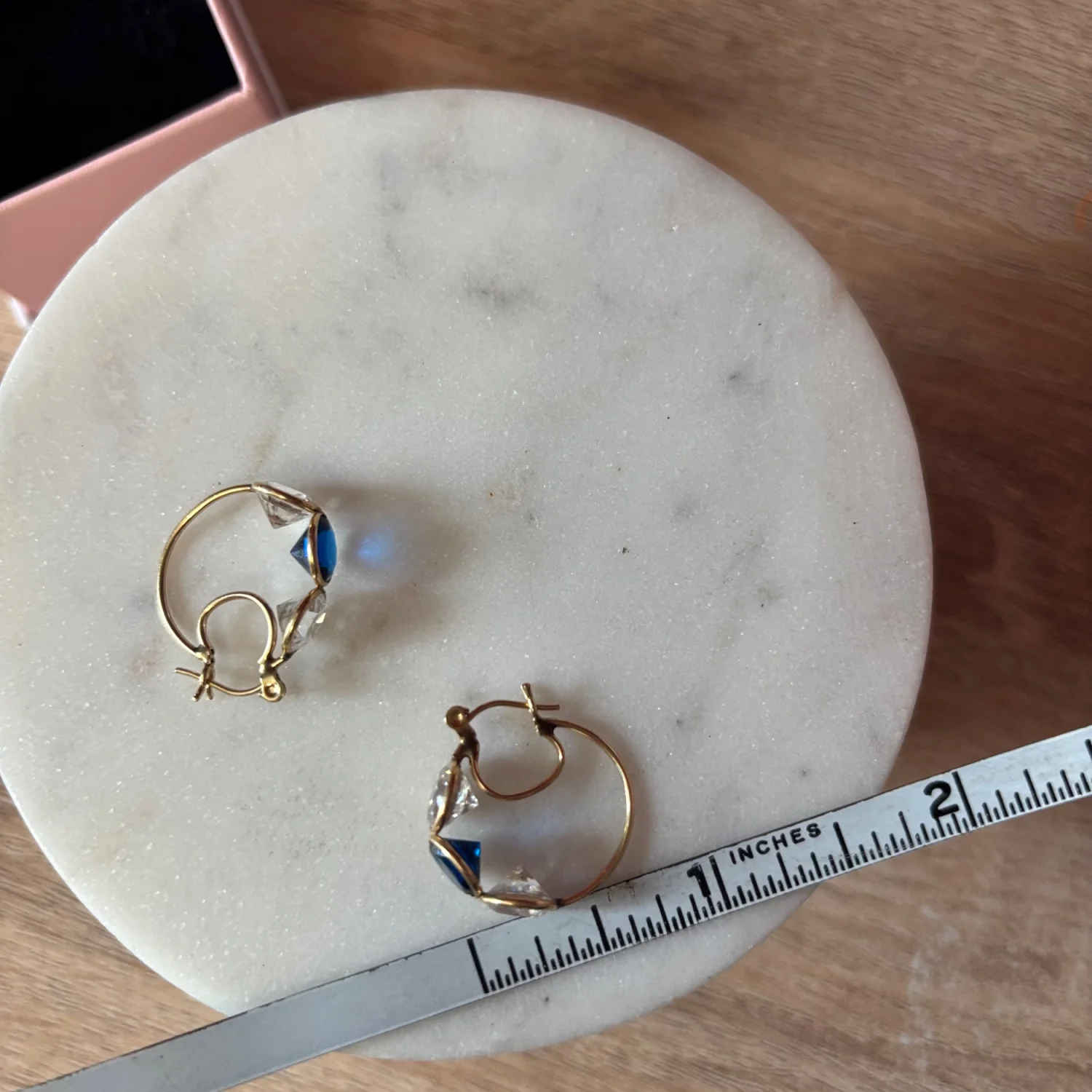 These vintage gold hoop earrings feature a three-stone bezel setting with alternating blue and clear round gemstones in a gold-tone finish. Rare, stylish, 70s vintage earrings, good condition