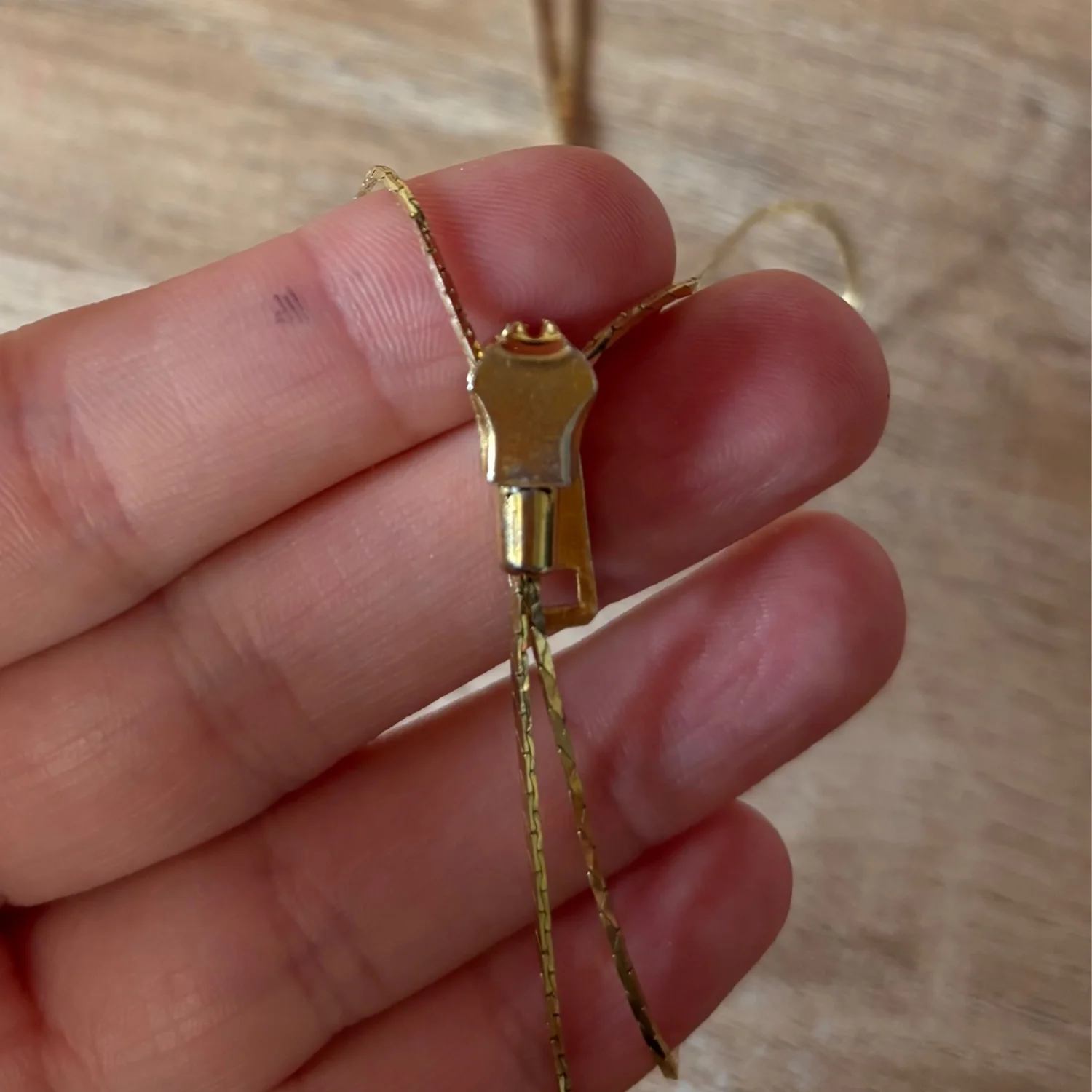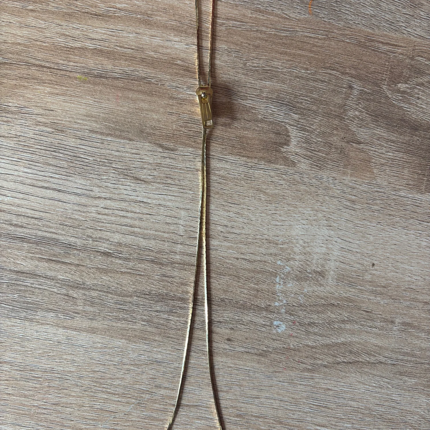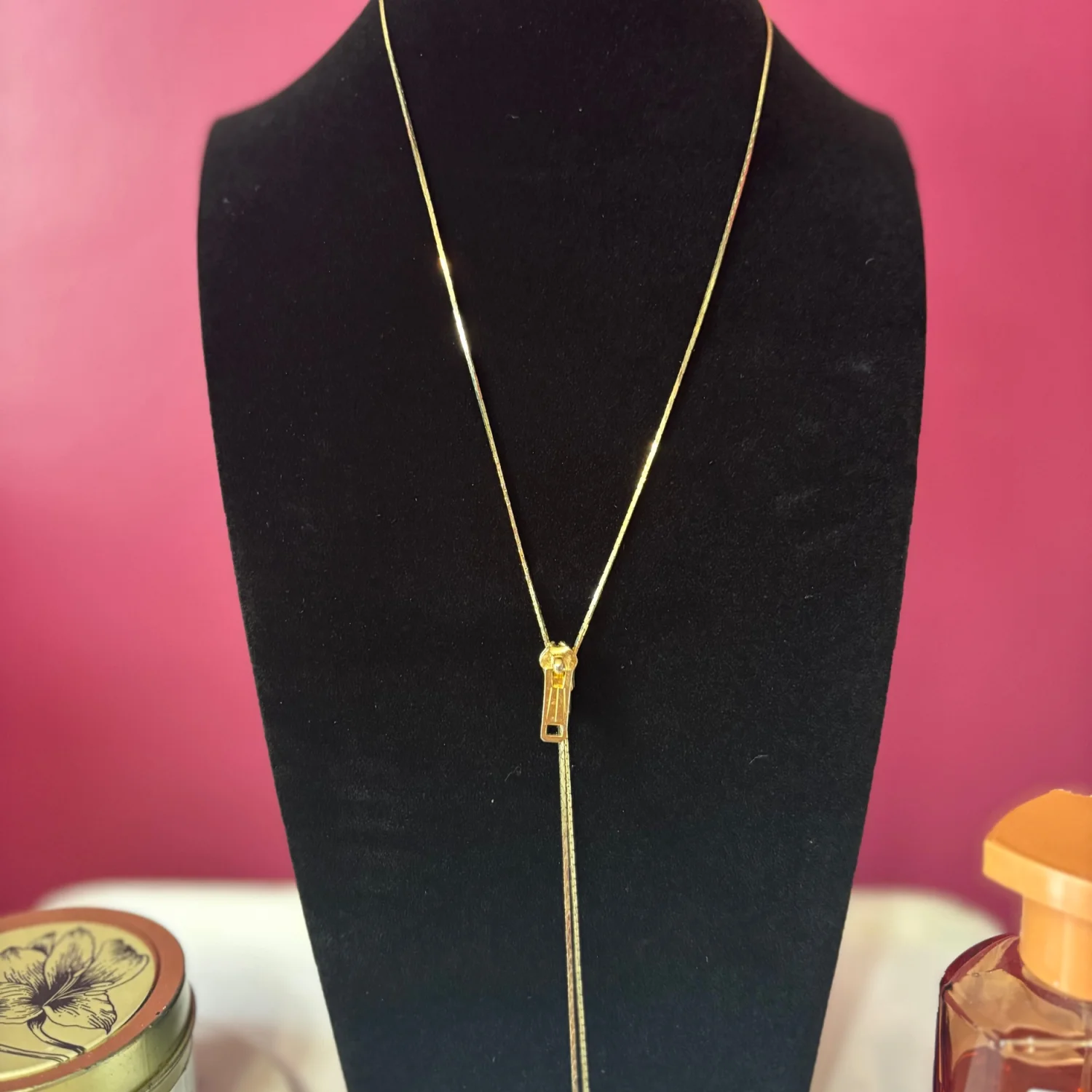 This item is a vintage-style gold tone lariat necklace featuring a functional zipper slide pendant and tassel ends. There is not engraving to determine the brand, but it is definitely a vintage piece. The zipper moves up and down with some tarnishing. Retro lariat or bolo design with an adjustable zipper closure with a gold tone finish. About 15 inches long Great vintage condition