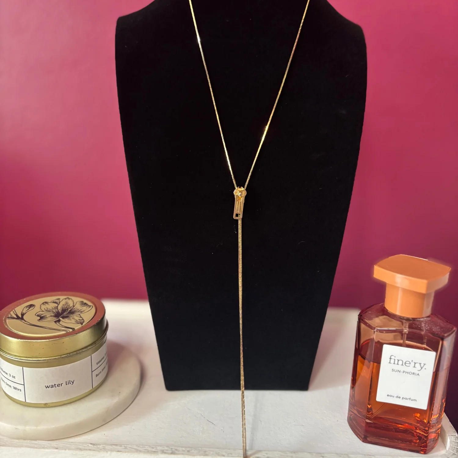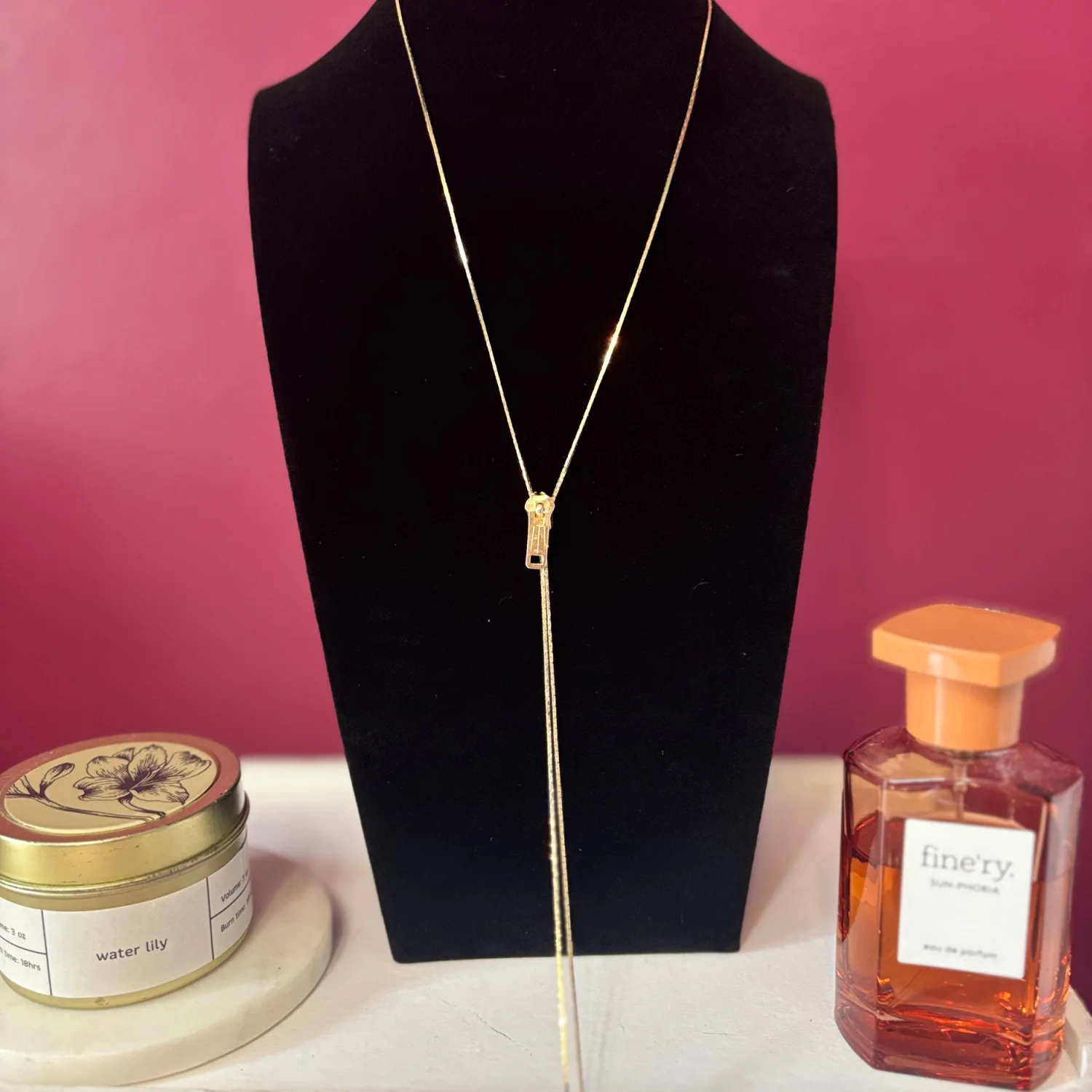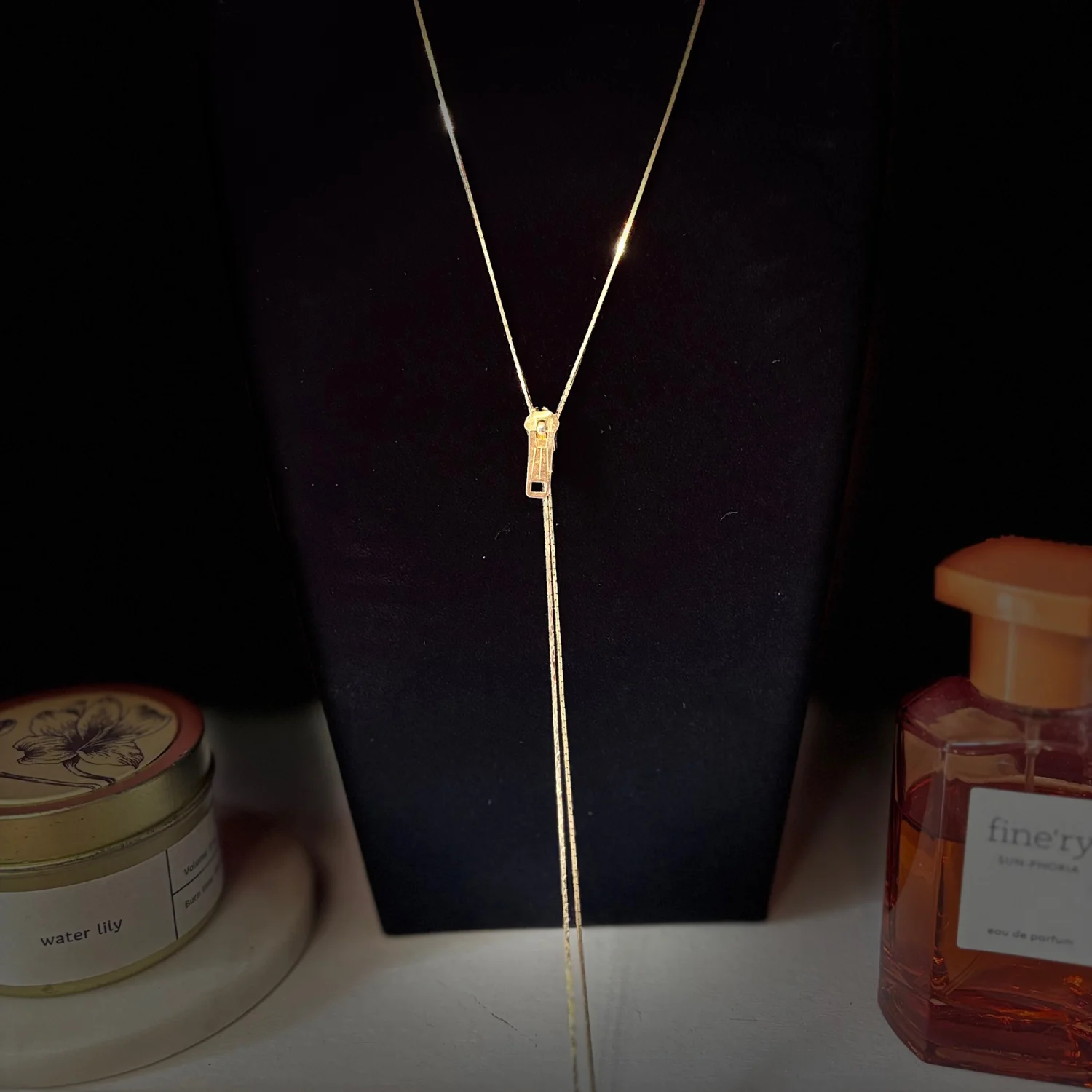 This item is a vintage-style gold tone lariat necklace featuring a functional zipper slide pendant and tassel ends. There is not engraving to determine the brand, but it is definitely a vintage piece. The zipper moves up and down with some tarnishing. Retro lariat or bolo design with an adjustable zipper closure with a gold tone finish. About 15 inches long Great vintage condition