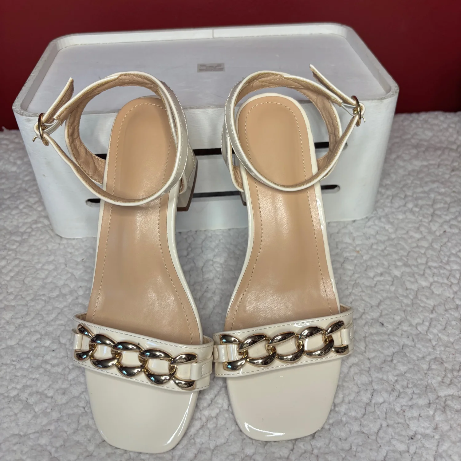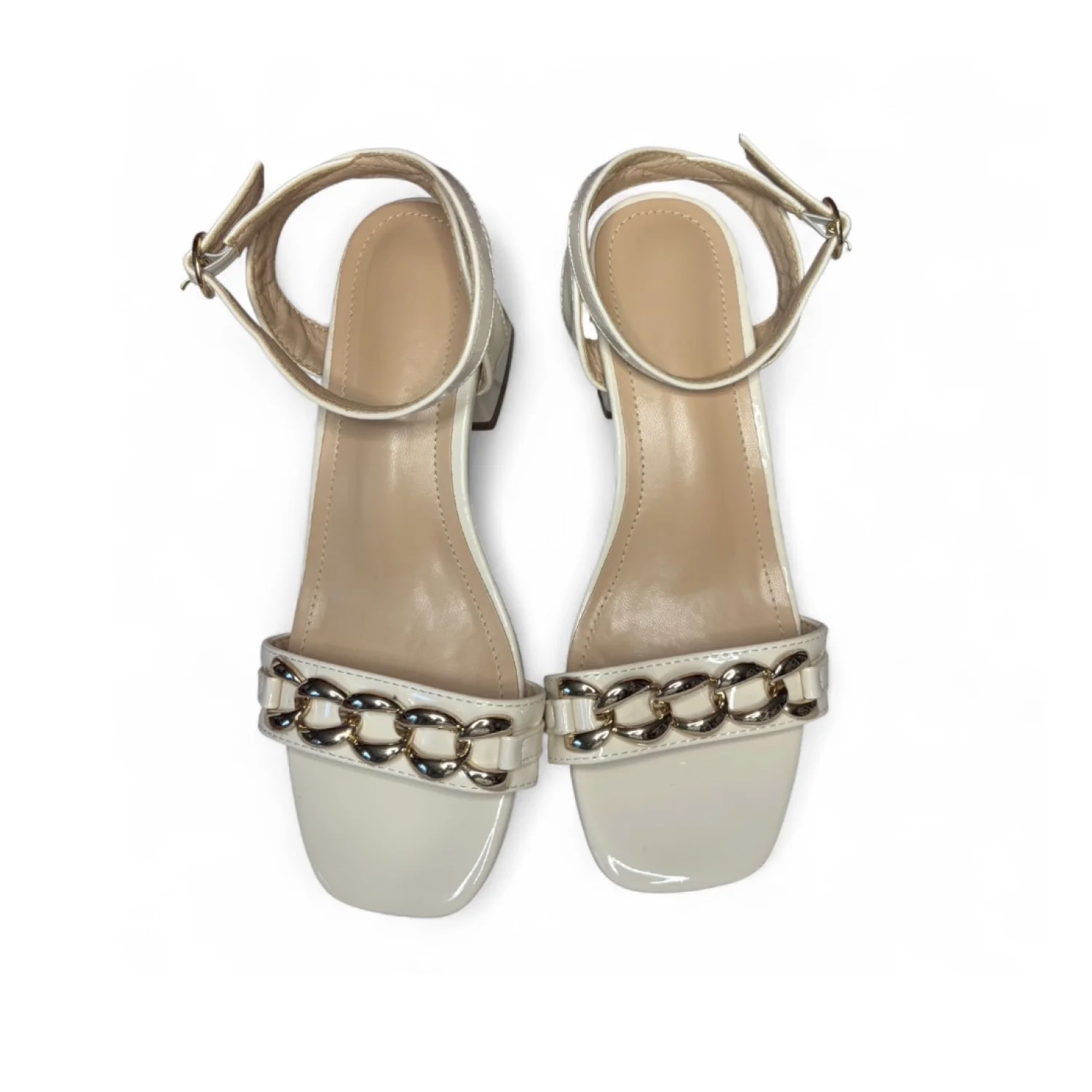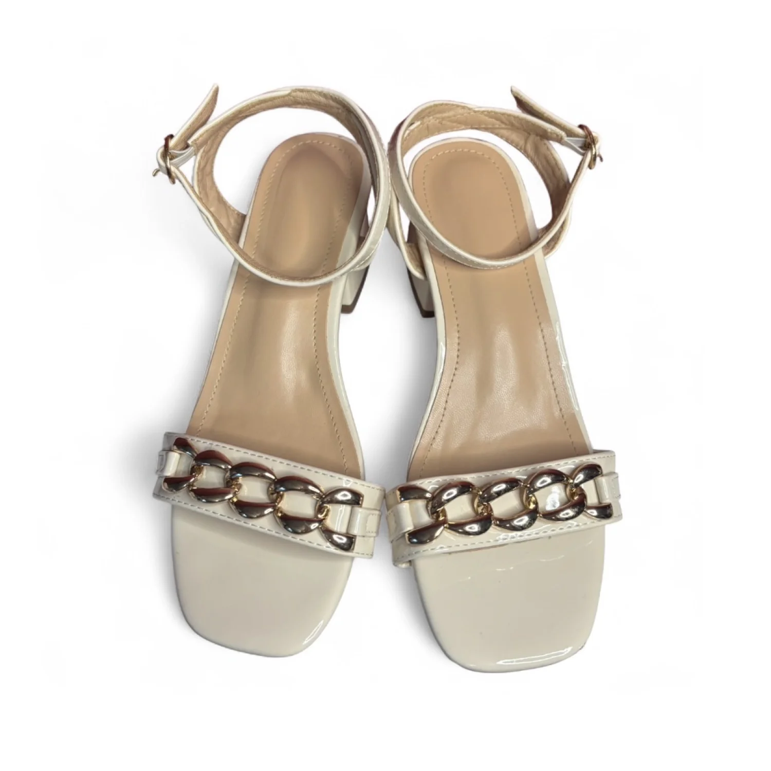 off-white/ cream colored patent leather heels accented with a gold-tone chain detail across the front strap and a block heel. Super stylish and goes with anything from jeans to a nice dress! Size 35/ or size 5/6 in women’s I would say. In used condition Old money, clean girl, angel core, chic, summer vibes, vacation.