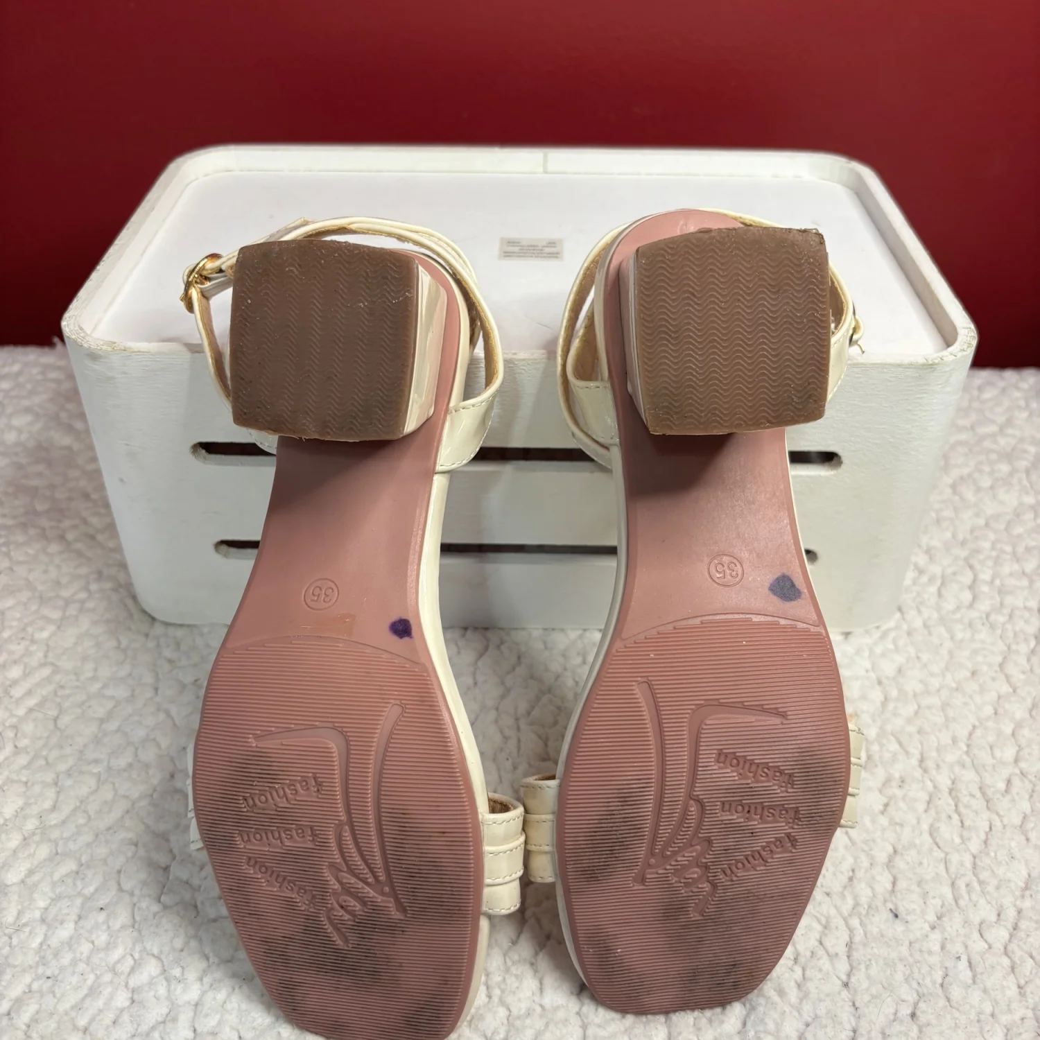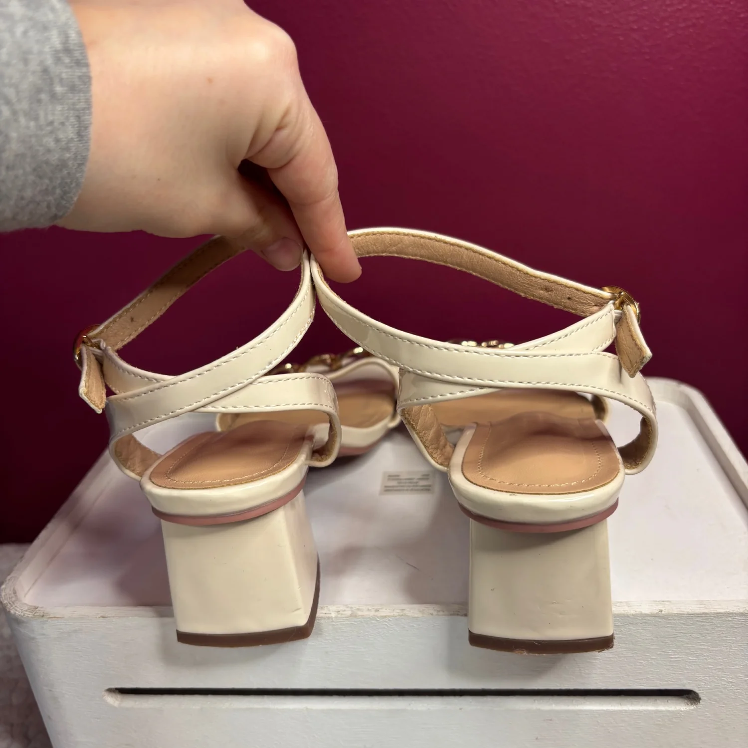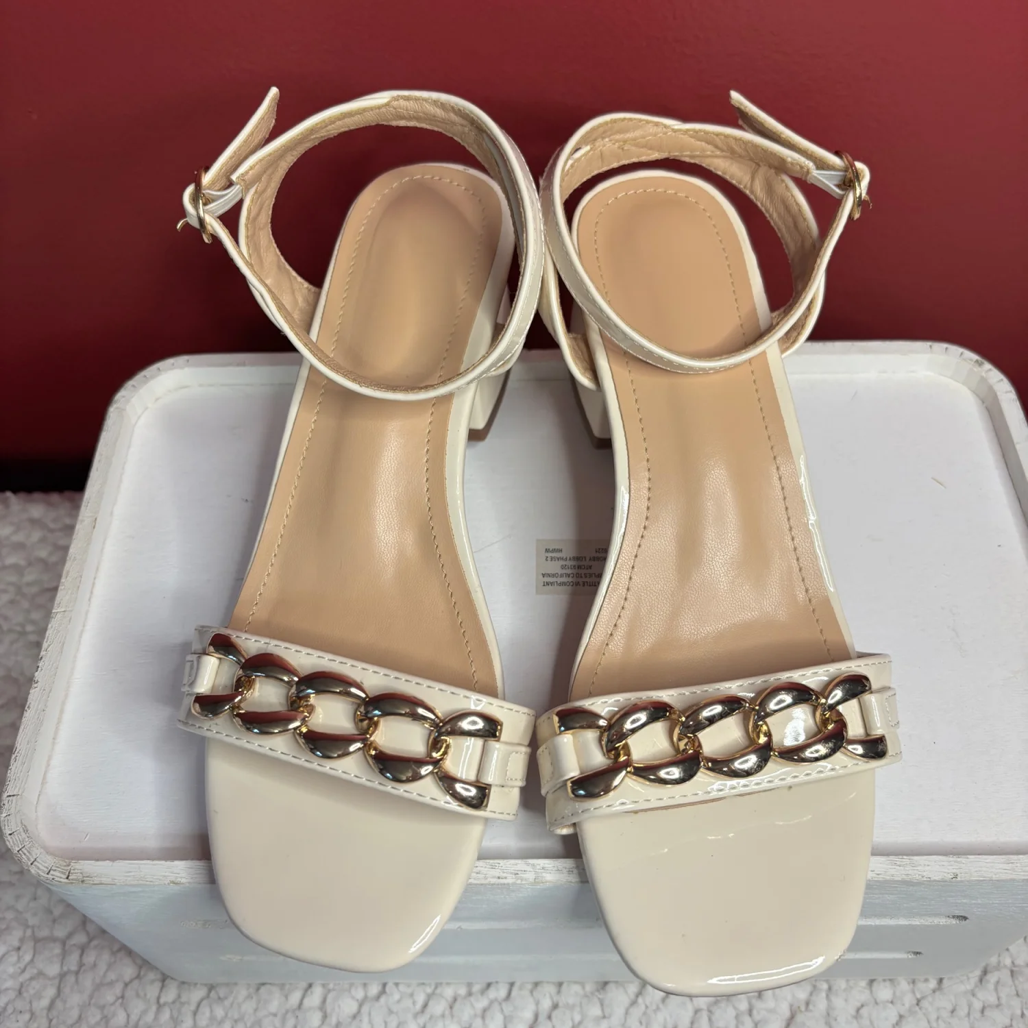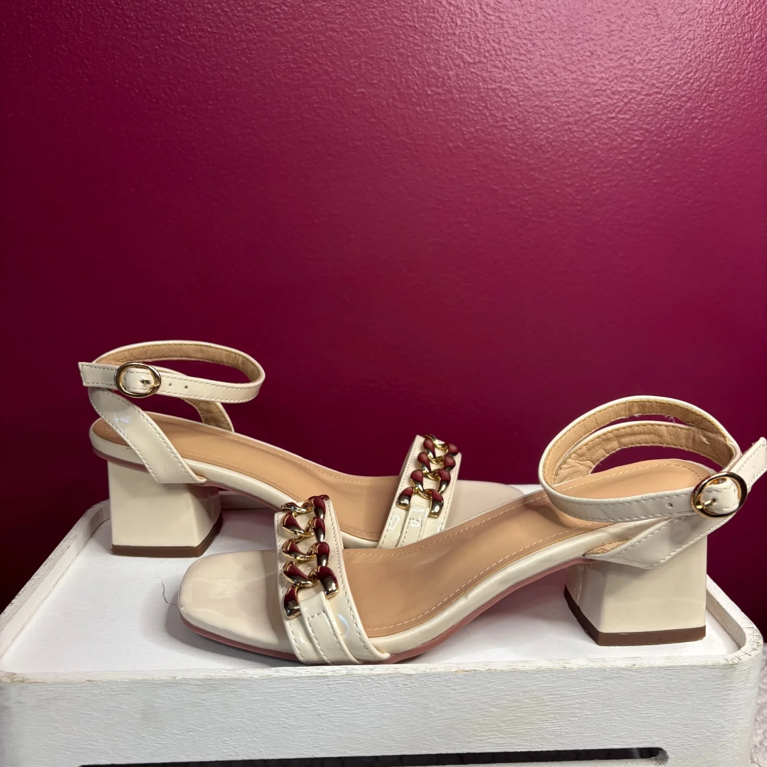 off-white/ cream colored patent leather heels accented with a gold-tone chain detail across the front strap and a block heel. Super stylish and goes with anything from jeans to a nice dress! Size 35/ or size 5/6 in women’s I would say. In used condition Old money, clean girl, angel core, chic, summer vibes, vacation.